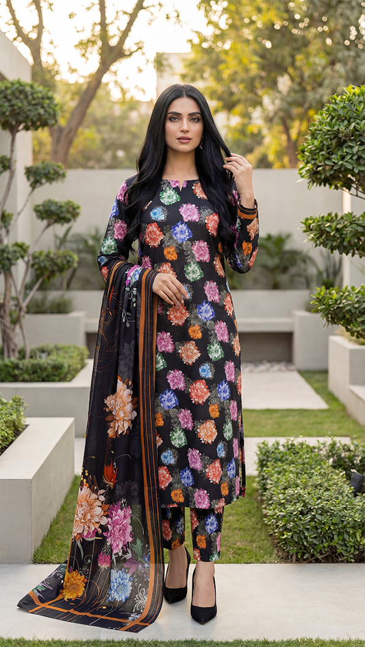 Make a bold statement with this stunning black embroidered outfit, crafted with intricate white threadwork...