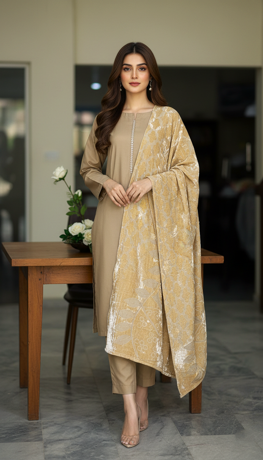 Details: Shirt: Premium Viscose Silk featuring fine thread embroidery on the neckline, front panel, and...