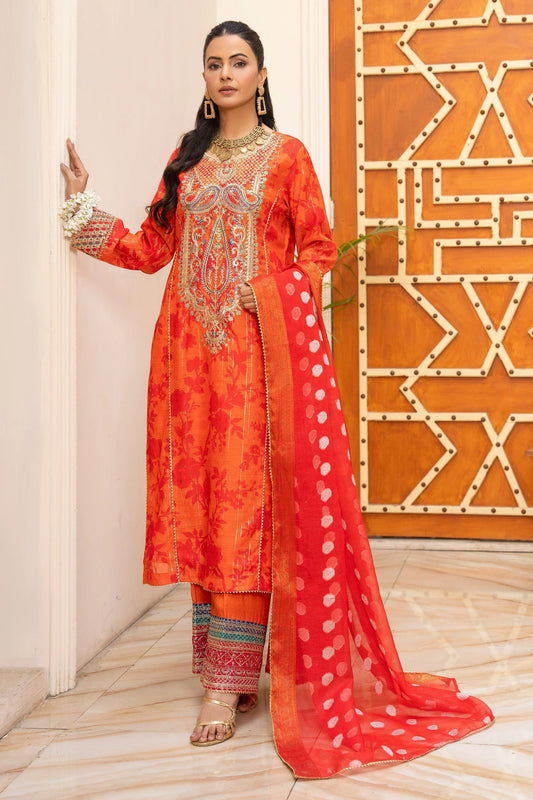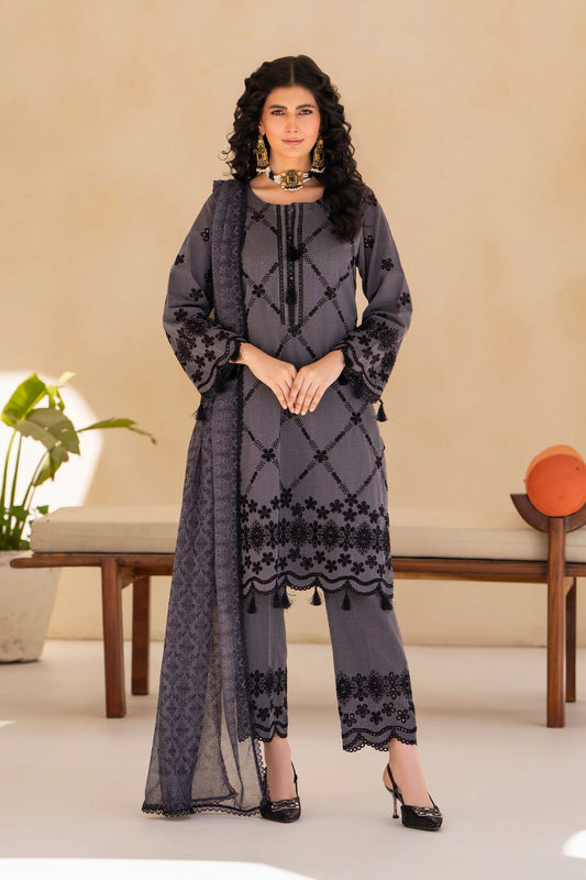 Details: Shirt: Chambray Embroidered Chambray Shirt Trouser: Plain Chambray trouser with embroidered borders Dupatta: Printed...