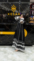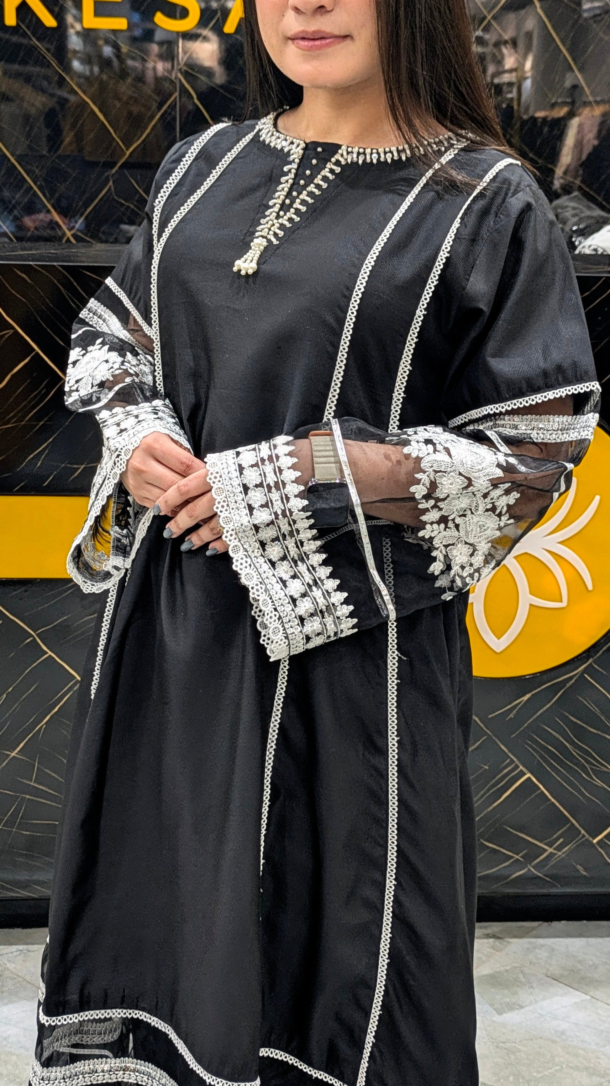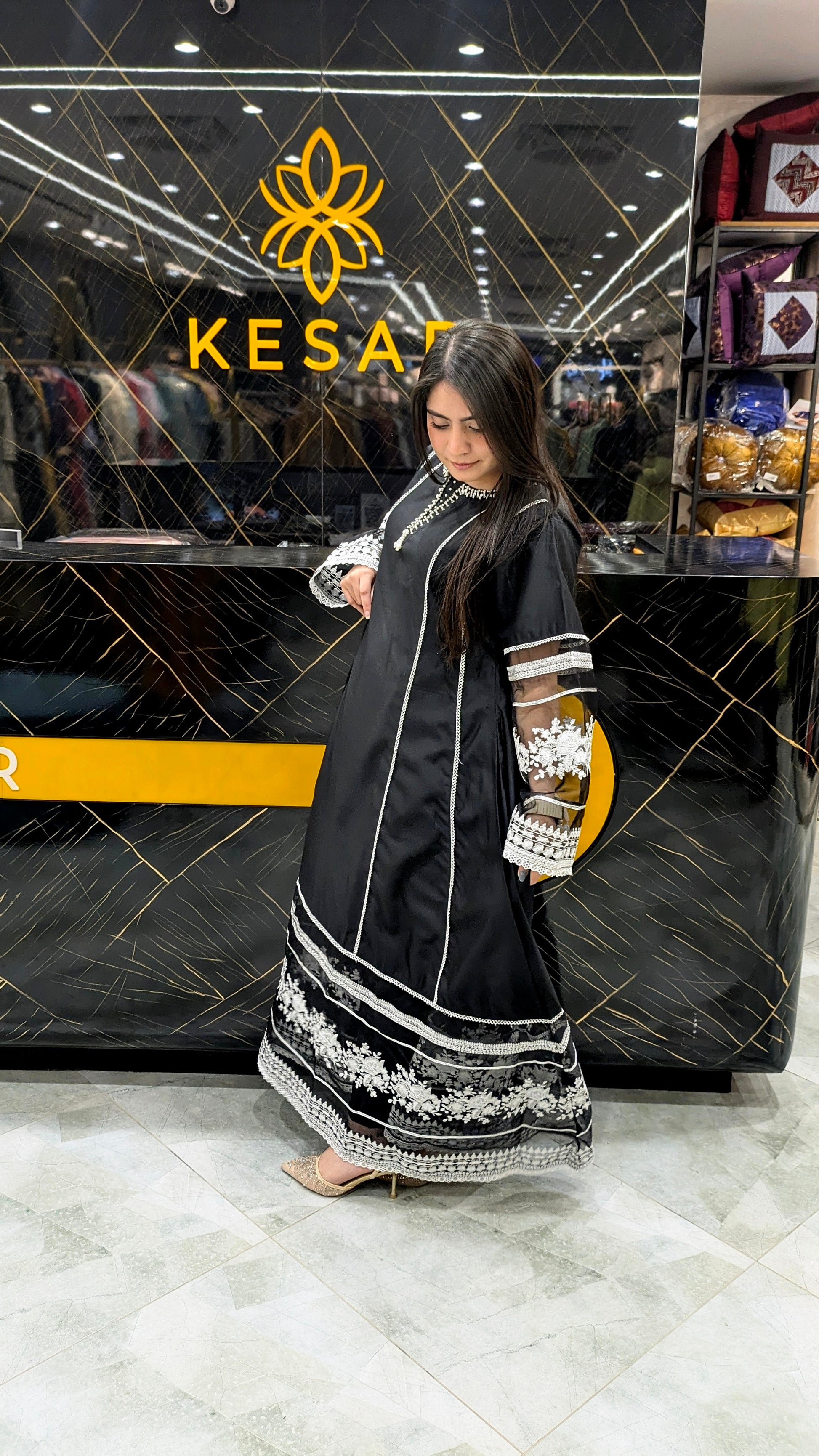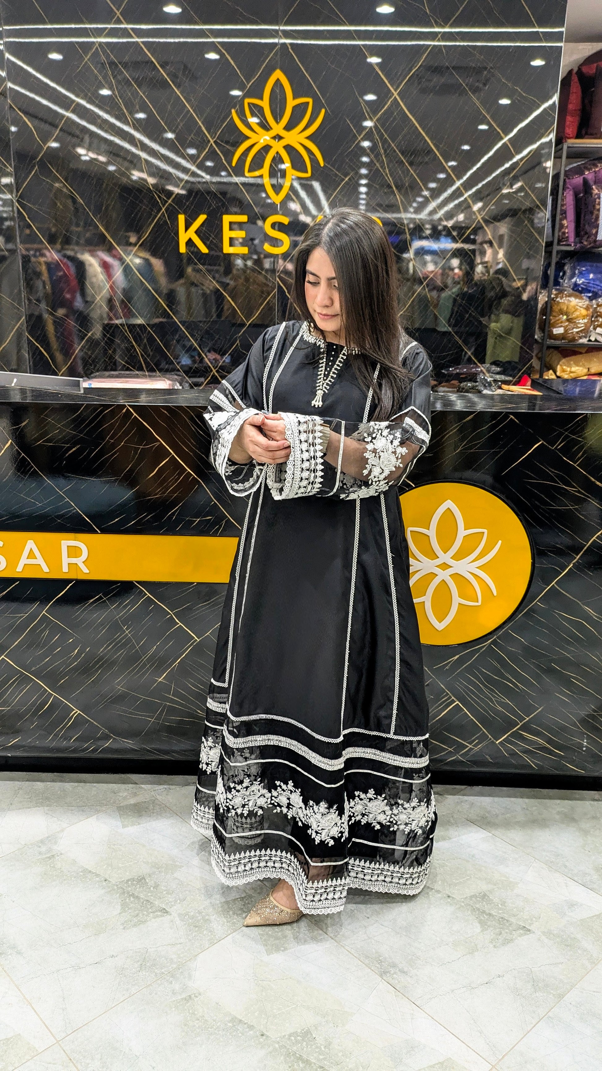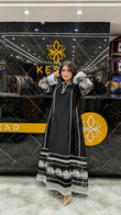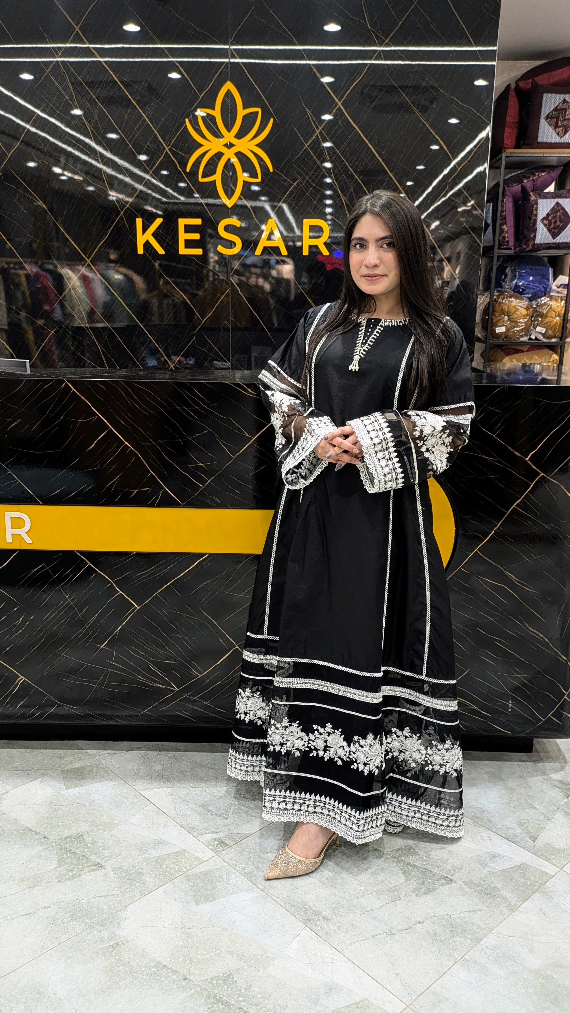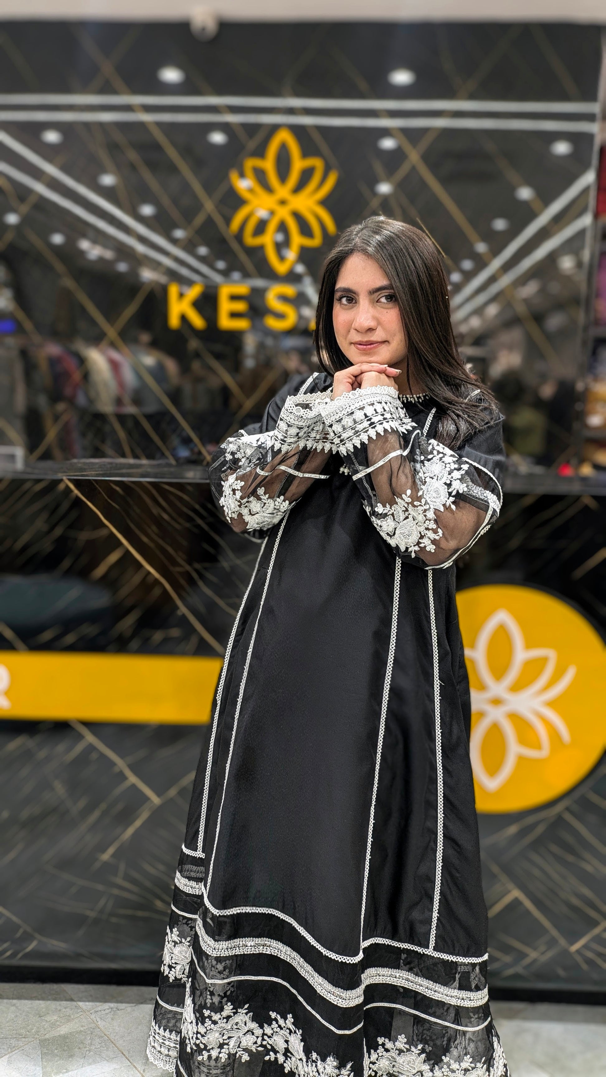 Make a bold statement with this stunning black embroidered outfit, crafted with intricate white threadwork that adds timeless sophistication. The classic black canvas beautifully enhances the floral printed dupatta, creating a perfect blend of tradition and modern chic. Its elegant neckline, delicate lace details, and graceful fall make it ideal for parties, gatherings, and formal functions. Designed for women who love strong colors with soft feminine detailing. A must-have luxury outfit that ensures you look stylish, confident, and effortlessly elegant.