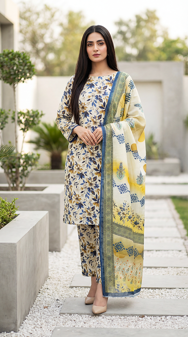 This fresh and vibrant 3-piece suit features an all-over floral print in soft cream tones, adorned with delicate blue and yellow flowers. The design has a calming effect while adding a touch of nature to your wardrobe. The long-sleeve shirt with its simple yet elegant neckline is paired with matching pants, creating a coordinated look.