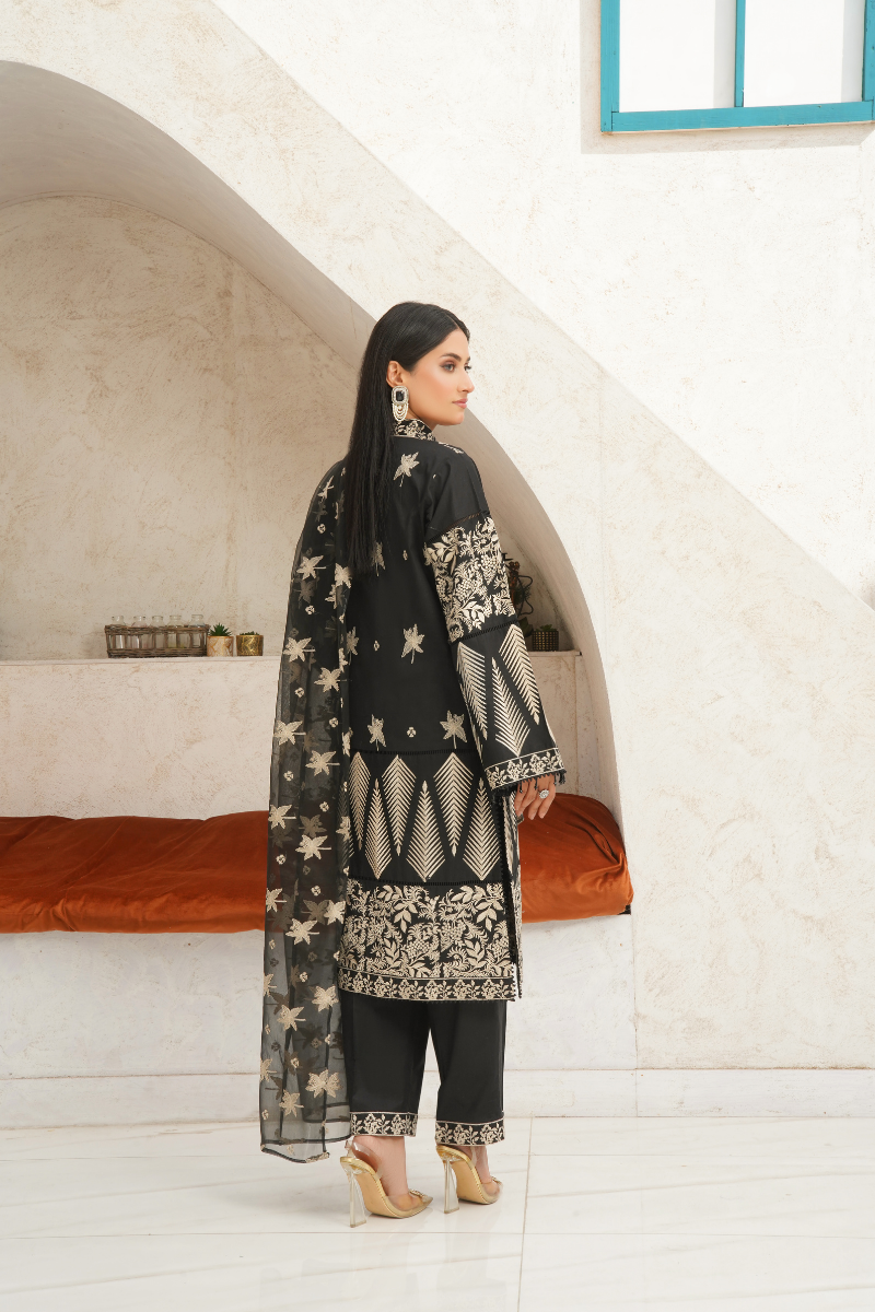 3-Piece Embroidered Black Suit Stitched – Gold Details - PP00241