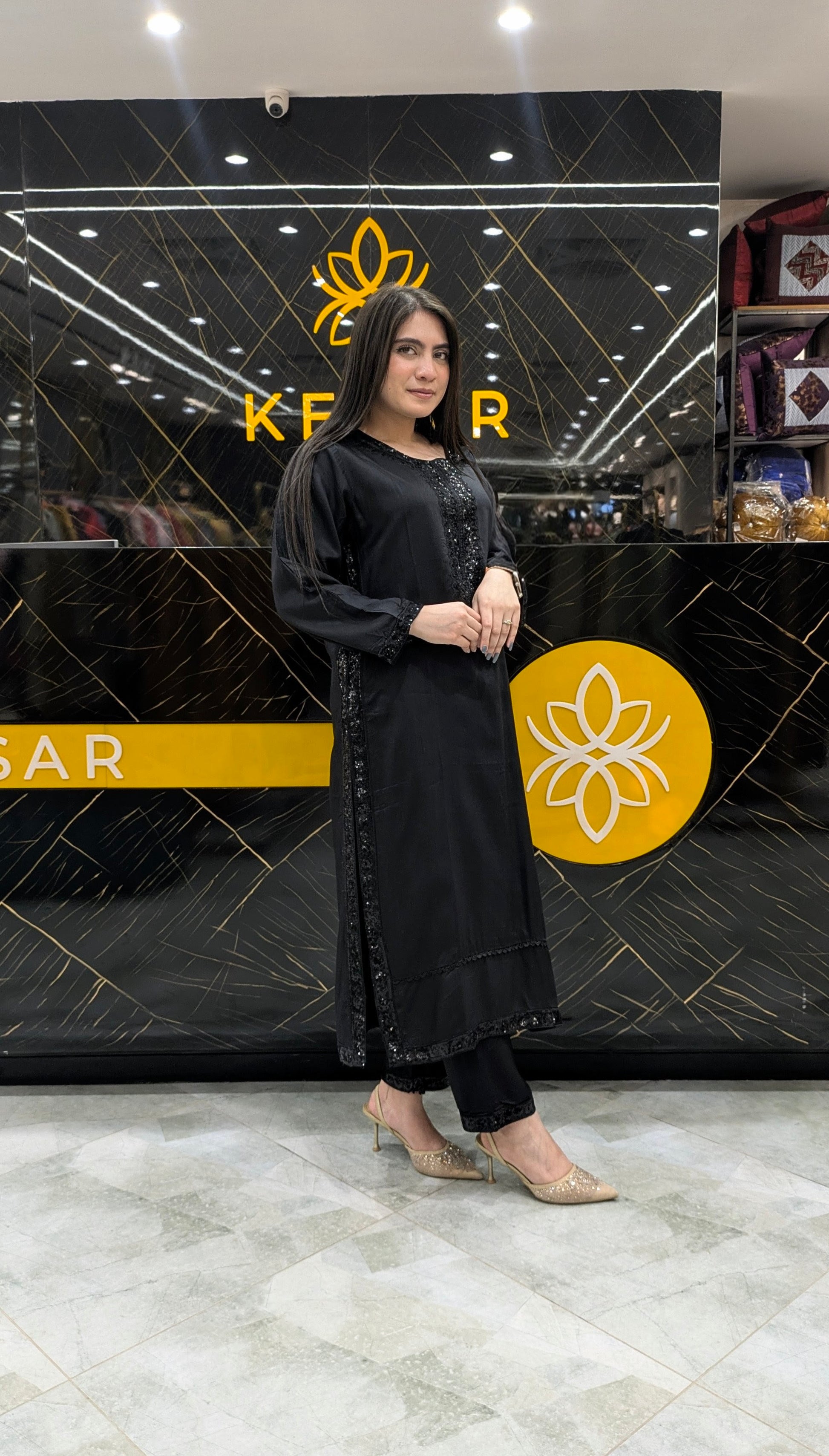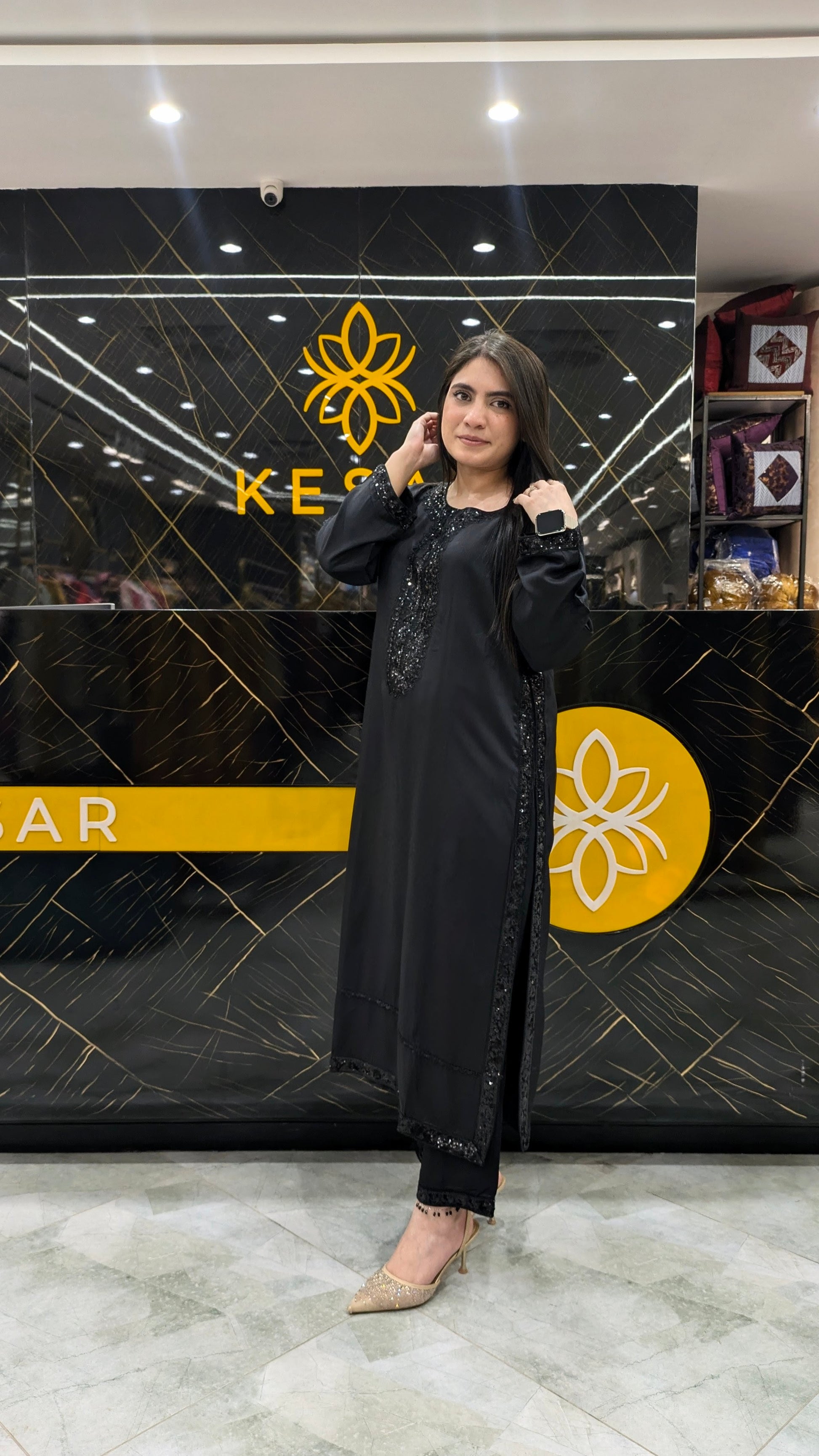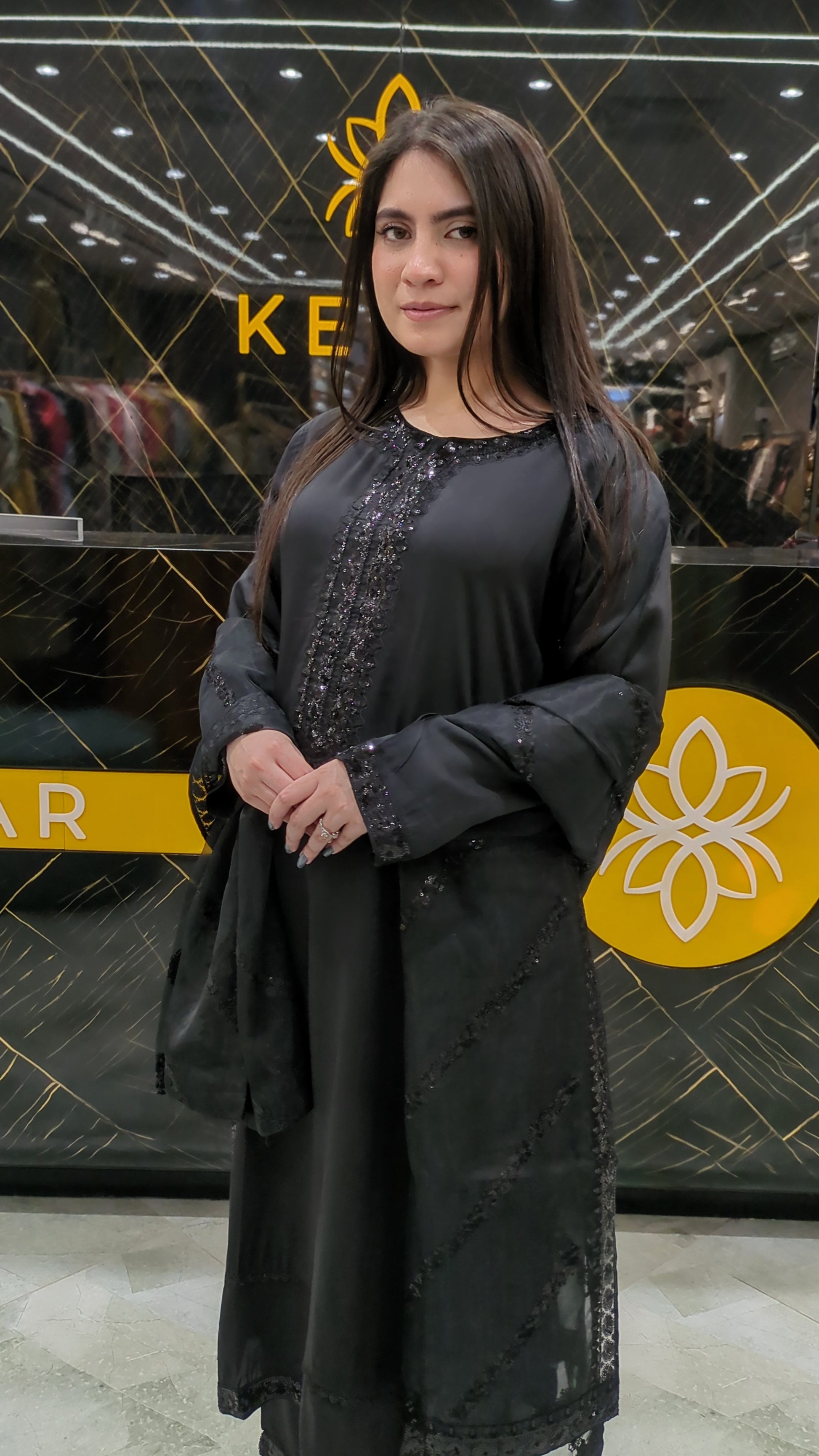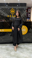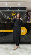 This timeless black ensemble is crafted for women who adore elegance in its purest form. The shirt features beautiful sequin embellishment along the neckline and sleeves, adding subtle shine without overpowering the look. Its sleek, straight-cut silhouette enhances sophistication while ensuring comfort. Paired with matching trousers, it creates a graceful and refined appearance perfect for dinners, parties, and formal evenings. A versatile black classic that never goes out of style.