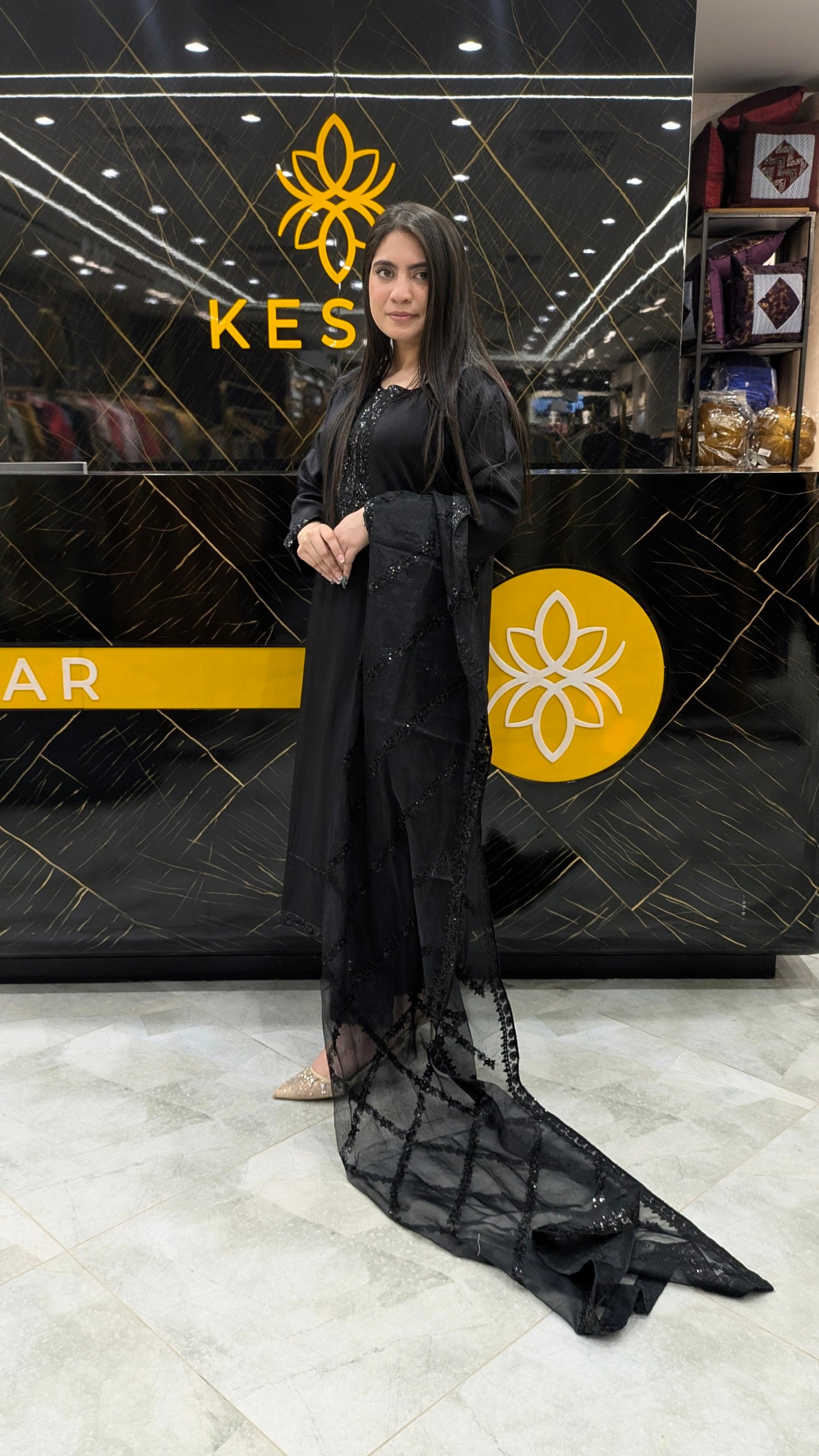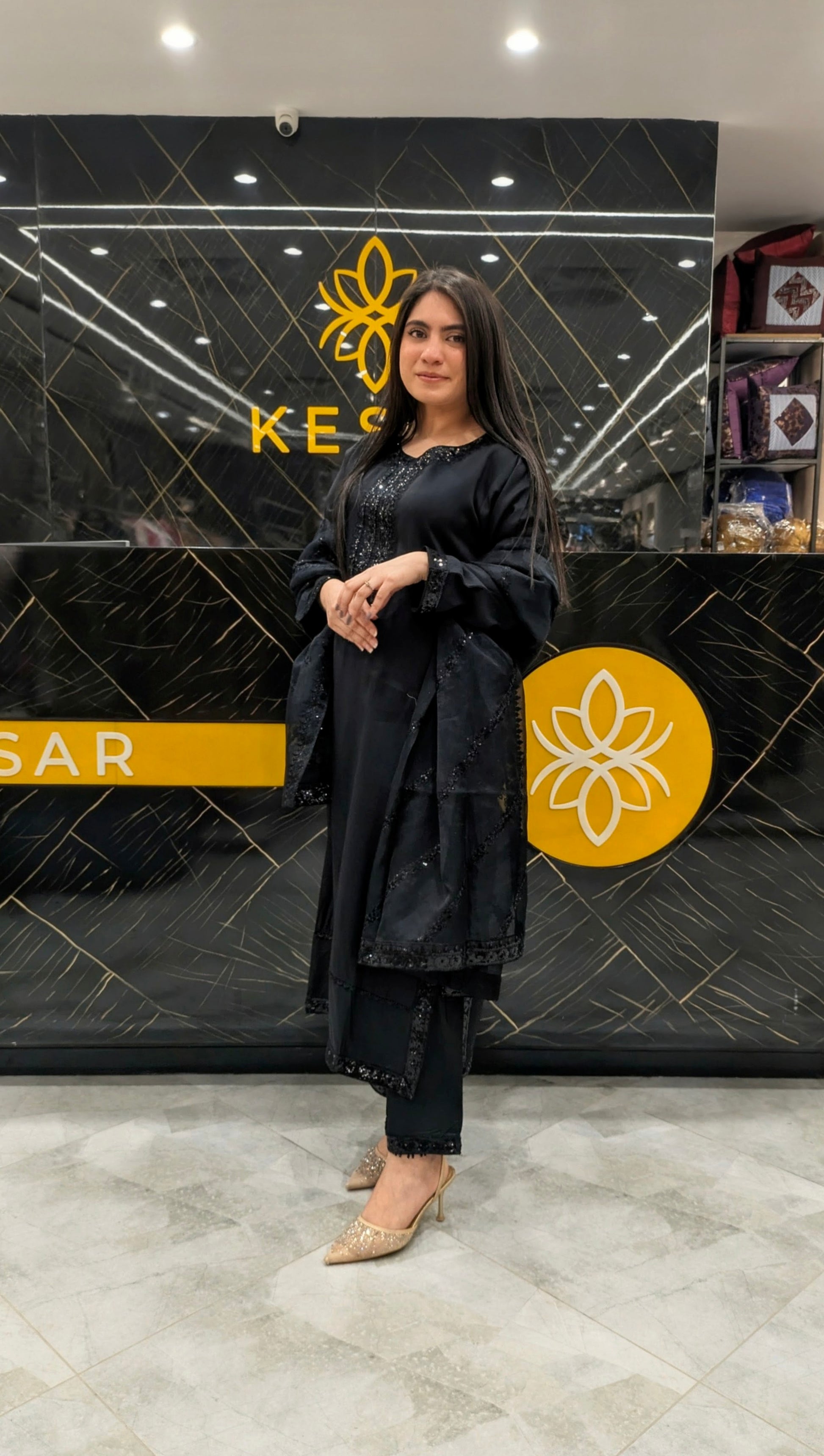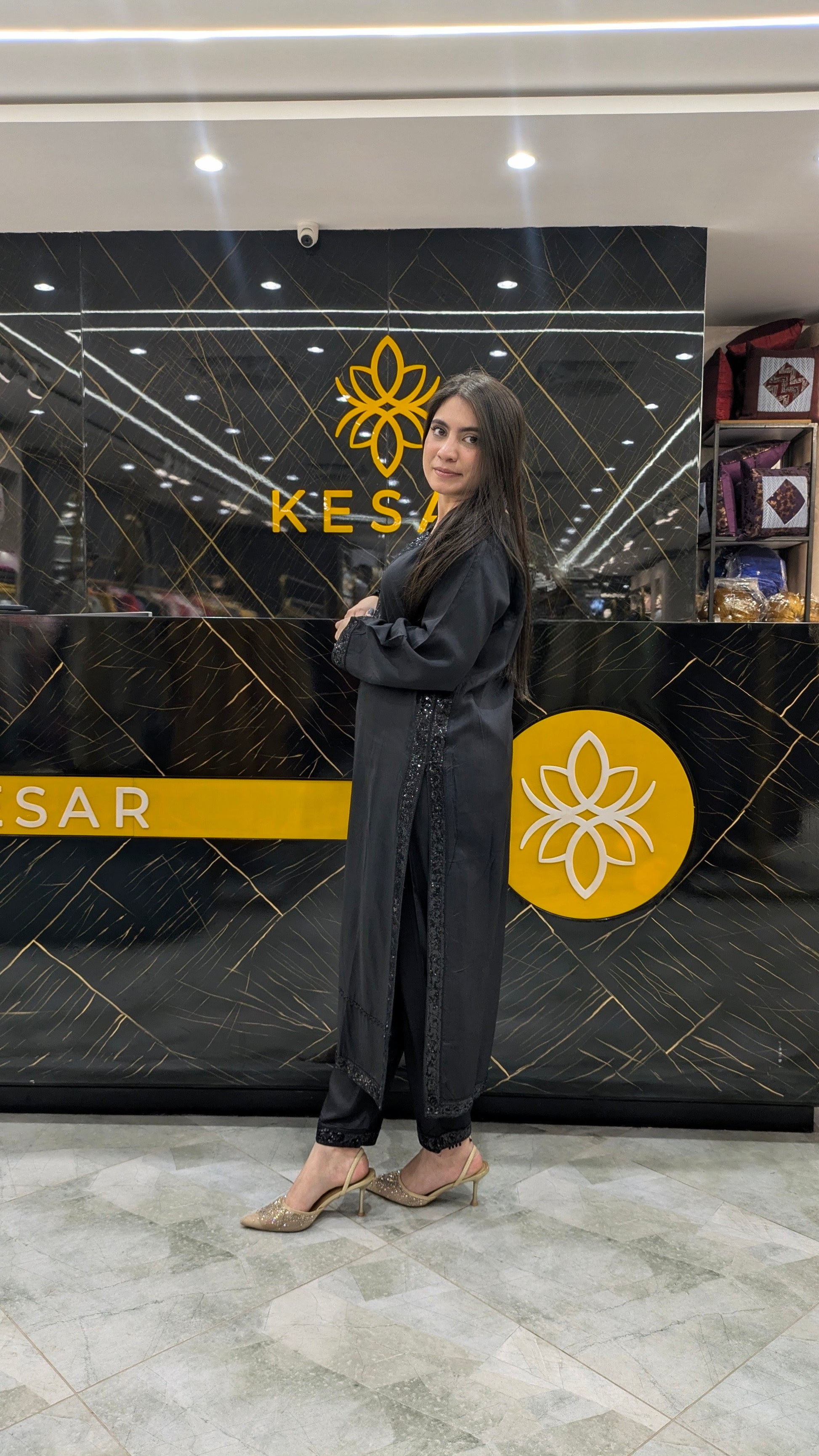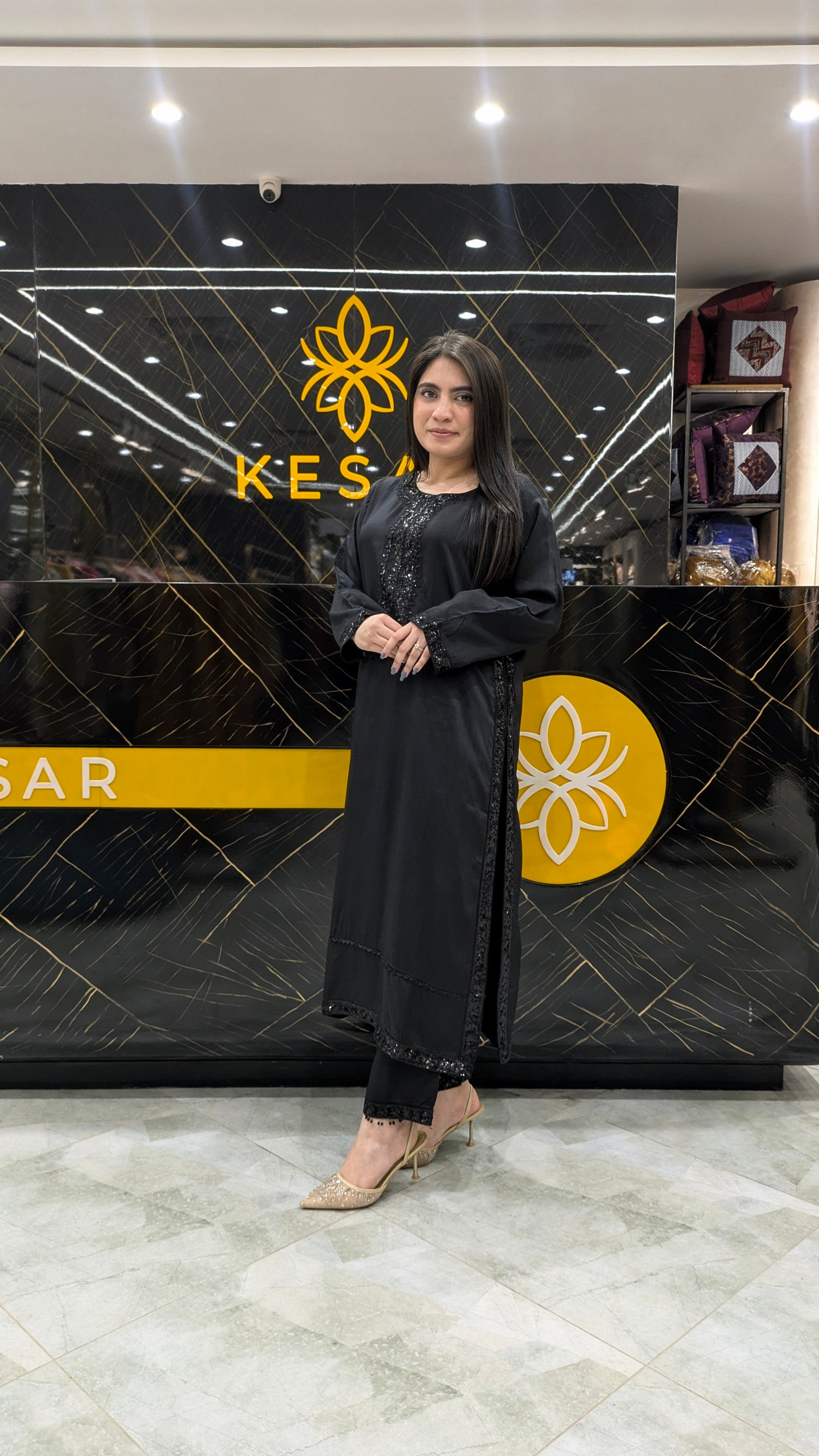 This timeless black ensemble is crafted for women who adore elegance in its purest form. The shirt features beautiful sequin embellishment along the neckline and sleeves, adding subtle shine without overpowering the look. Its sleek, straight-cut silhouette enhances sophistication while ensuring comfort. Paired with matching trousers, it creates a graceful and refined appearance perfect for dinners, parties, and formal evenings. A versatile black classic that never goes out of style.