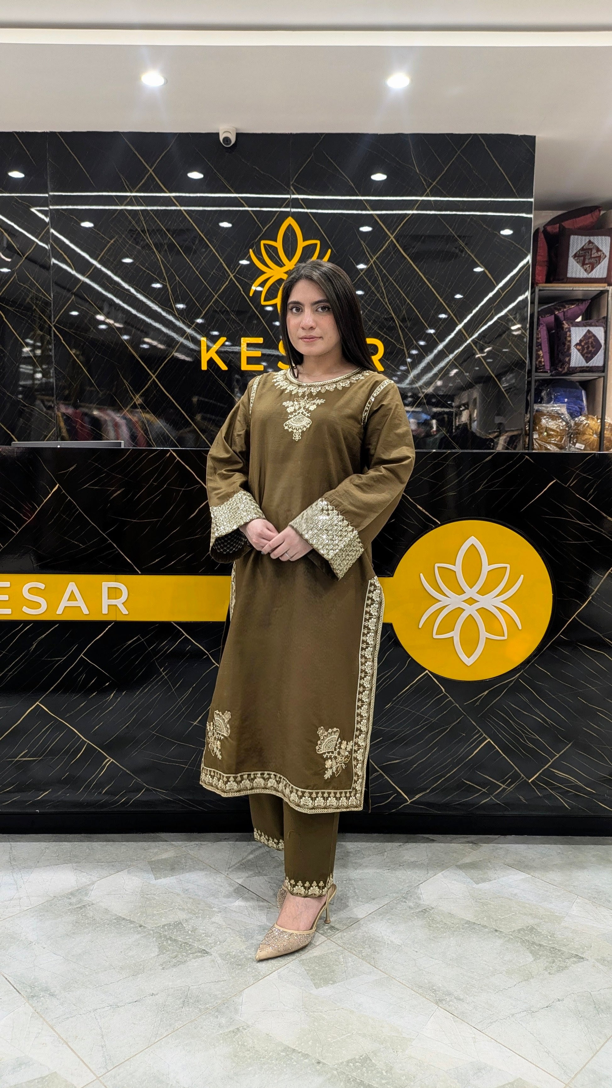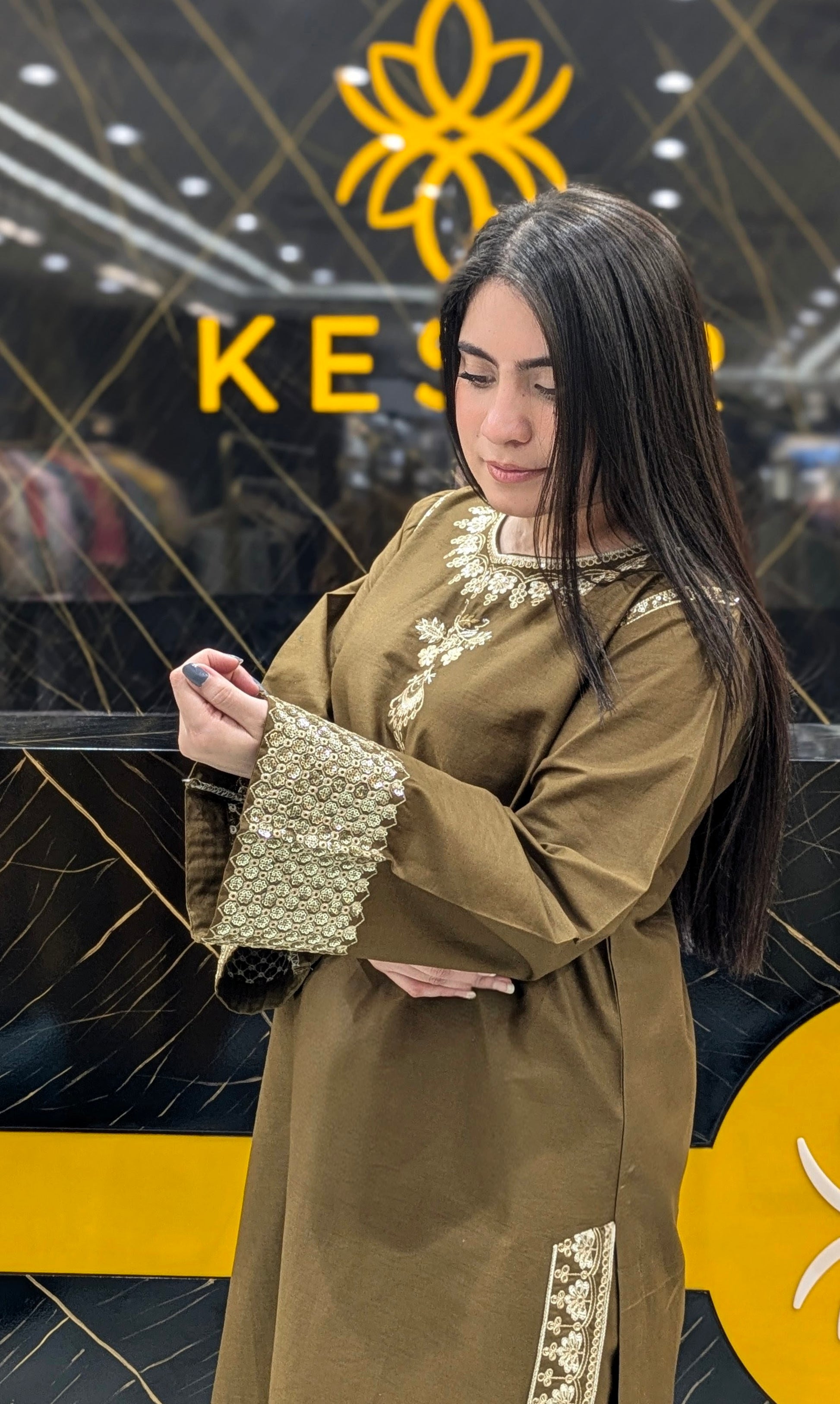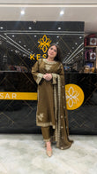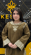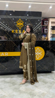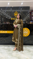 Experience timeless elegance with this olive green embroidered 3-piece suit, beautifully detailed with golden threadwork for a rich, regal finish. The neckline, sleeves, and borders feature intricate embellishments, adding a luxurious festive touch. Its matching embroidered dupatta drapes gracefully, creating a perfectly refined and graceful look. Soft, comfortable, and premium—this outfit is ideal for festive dinners, family gatherings, parties, and special occasions. A stunning choice for women who love classy colours and elegant craftsmanship.