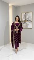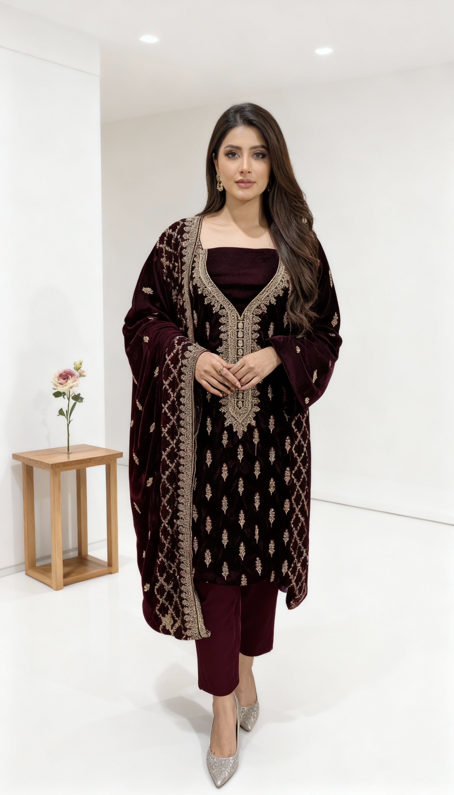 This luxurious velvet ensemble showcases exquisite gold embroidery that enhances the neckline, sleeves, and front with stunning precision. The rich velvet fabric adds depth and elegance, making it a perfect choice for winter festivities, formal dinners, and special occasions. The matching dupatta features beautifully detailed borders and delicate motifs, adding a graceful flow to the entire look. Paired with tailored trousers and shimmering heels, the outfit creates a polished and sophisticated silhouette. Designed for those who appreciate refined craftsmanship, this ensemble exudes timeless beauty and regal charm.