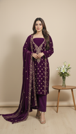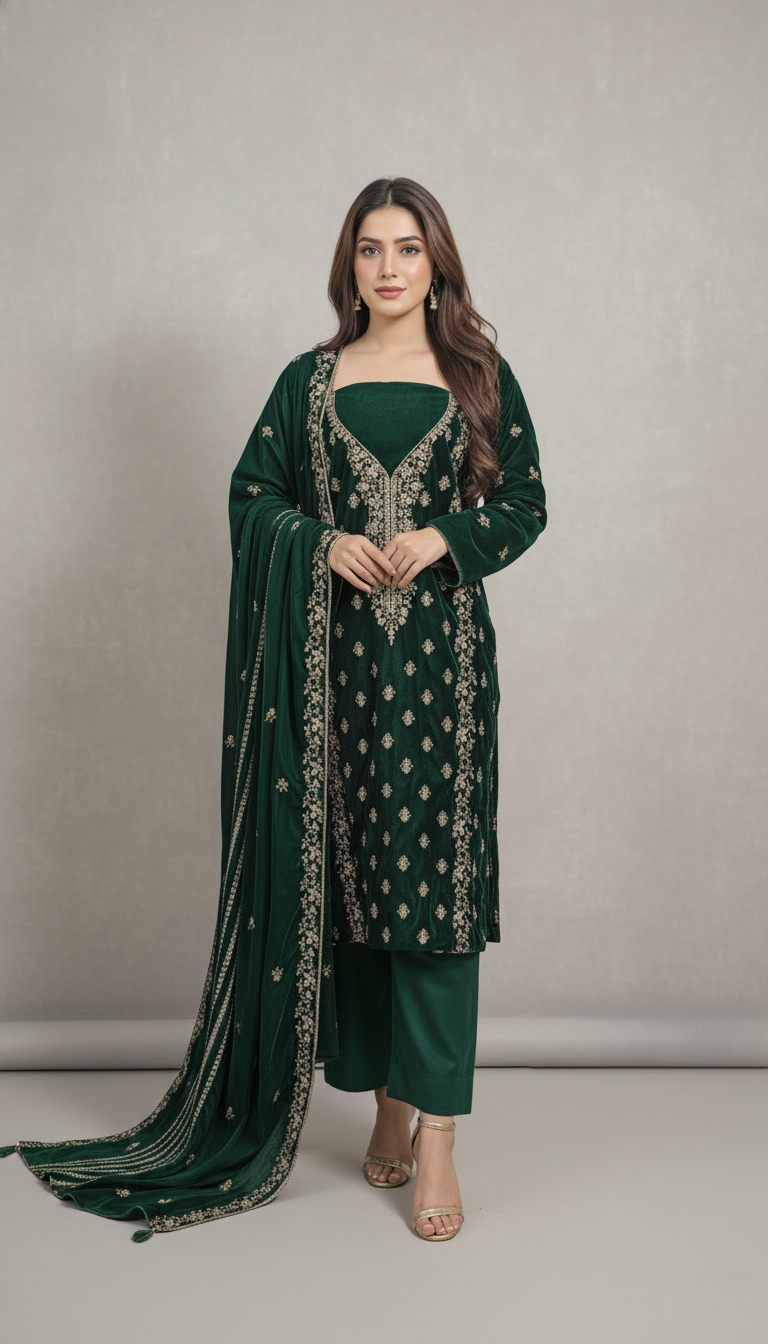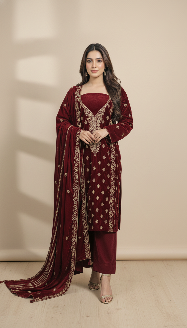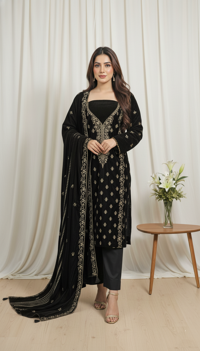 This exquisite velvet ensemble radiates timeless luxury with its intricate gold embroidery adorning the neckline, sleeves, and front panel. The rich velvet texture adds depth and elegance, making it a perfect choice for festive occasions and winter celebrations. The matching dupatta, detailed with beautifully embroidered borders and scattered motifs, enhances the outfit’s regal charm. Paired with sleek trousers and elegant heels, it creates a polished and graceful silhouette. Designed for those who appreciate refined craftsmanship, this outfit offers a perfect blend of sophistication and classic allure.