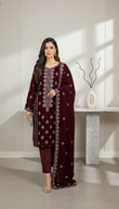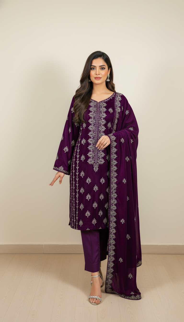 This elegant velvet ensemble stands out with its exquisite silver embroidery, beautifully arranged across the neckline, sleeves, and front panel. The rich velvet fabric adds depth and sophistication, making it a perfect choice for winter festivities and formal events. The matching dupatta, adorned with detailed embroidered borders and delicate motifs, enhances the outfit’s graceful flow. Paired with sleek black trousers and embellished heels, it creates a polished and timeless silhouette. Designed for those who appreciate refined luxury, this ensemble exudes class, charm, and effortless elegance.