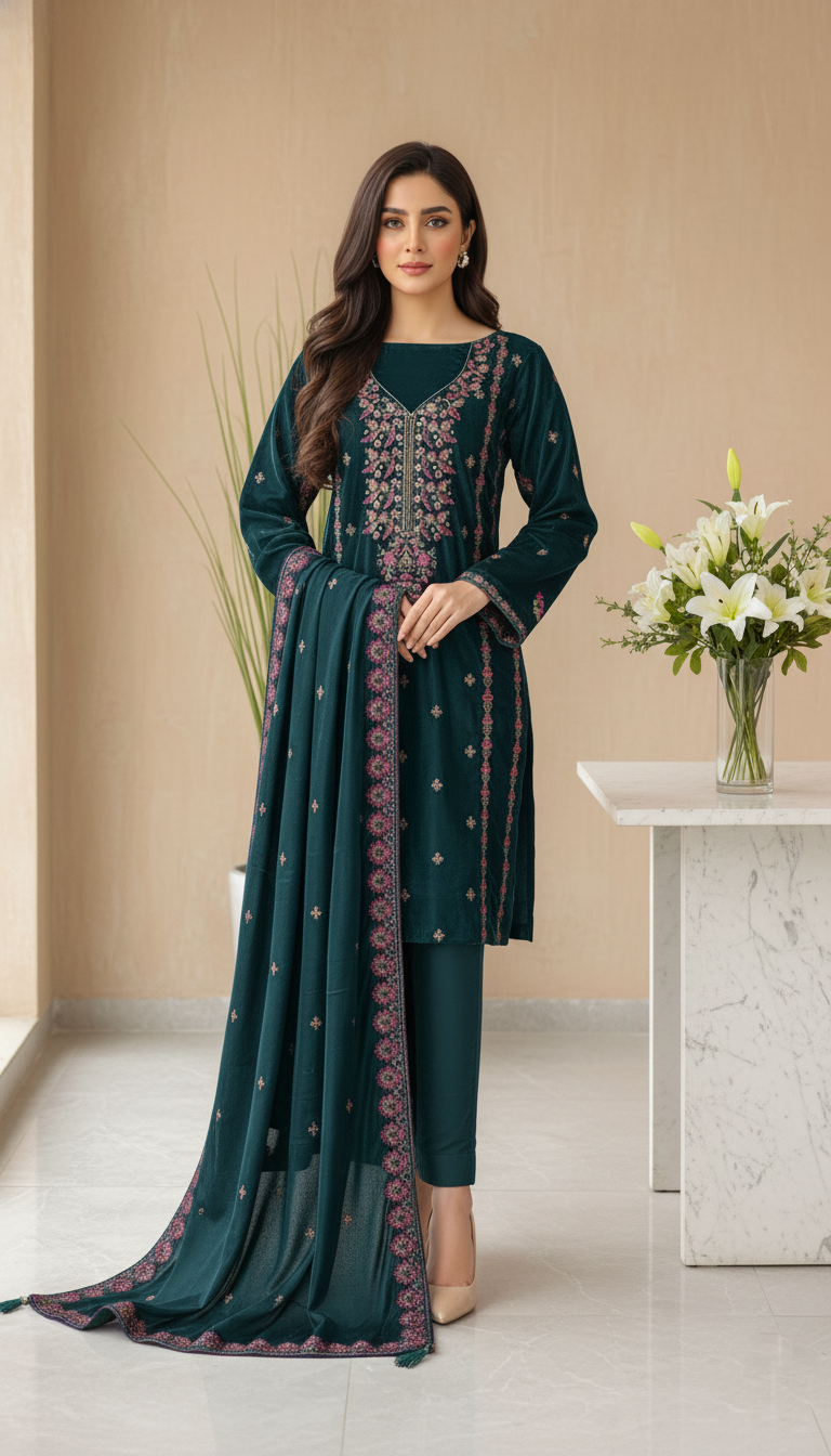 This elegant velvet ensemble features beautifully crafted pink floral embroidery that adds a touch of charm and sophistication. The detailed work on the neckline, sleeves, and front panel enhances its graceful and feminine appeal. The matching dupatta, adorned with embroidered borders and delicate motifs, flows effortlessly to complete the look. Paired with sleek trousers, the outfit offers a polished and refined silhouette. Perfect for winter festivities, formal gatherings, or evening events, this ensemble brings together elegance, color, and timeless style.