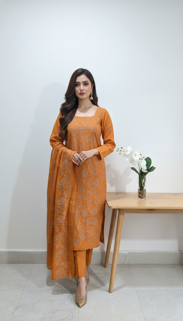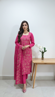This elegant ensemble features exquisite gold floral patterns that add richness, charm, and a timeless appeal to the look. The beautifully coordinated dupatta, adorned with matching motifs, enhances the outfit with a graceful and refined touch. Paired with sleek trousers and delicate heels, it creates a polished and feminine silhouette. The vibrant pink tone brings freshness and radiance, perfect for festive events, gatherings, or daytime occasions. Designed with both style and comfort in mind, this outfit blends classic elegance with modern sophistication.