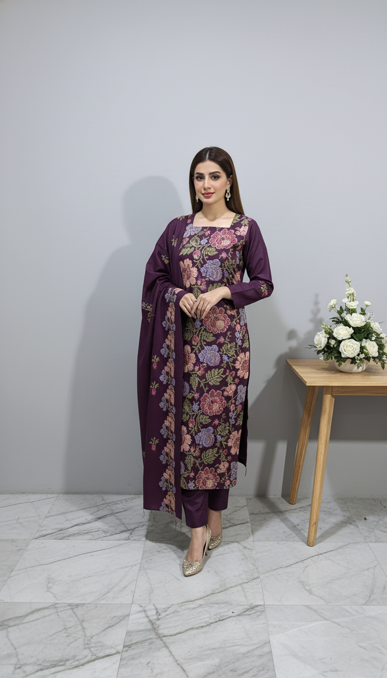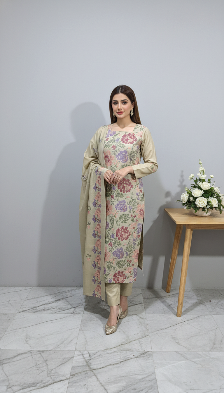This elegant ensemble features a beautifully detailed floral print in rich shades of pink, purple, and gold, adding a graceful and feminine charm to the look. The matching dupatta, adorned with coordinating floral motifs, enhances the outfit with seamless sophistication. Paired with sleek green trousers, it creates a polished and balanced silhouette. The vibrant yet earthy tones make it perfect for casual gatherings, festive occasions, or daytime events. Designed for comfort and elegance, this outfit blends classic florals with modern style effortlessly.
