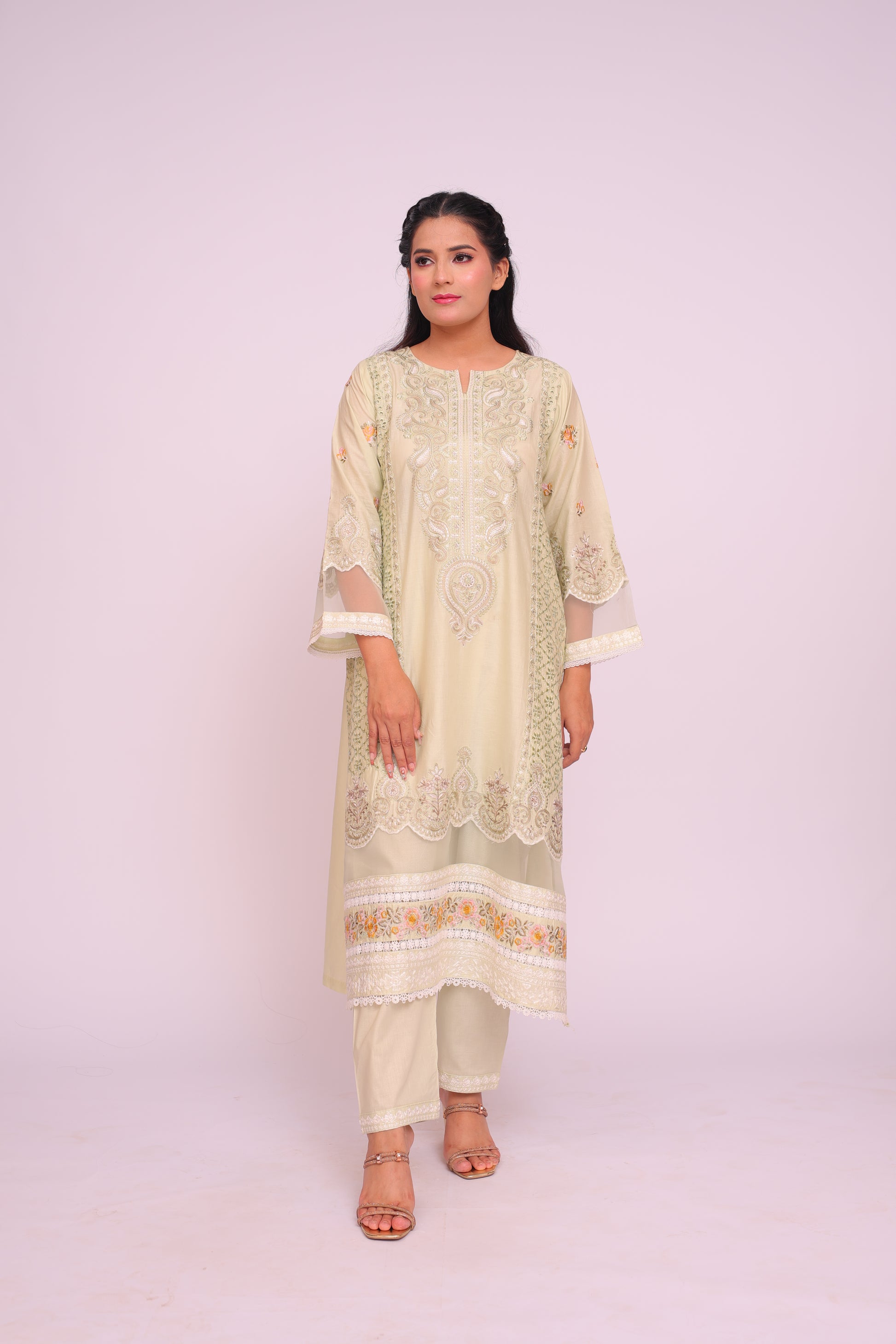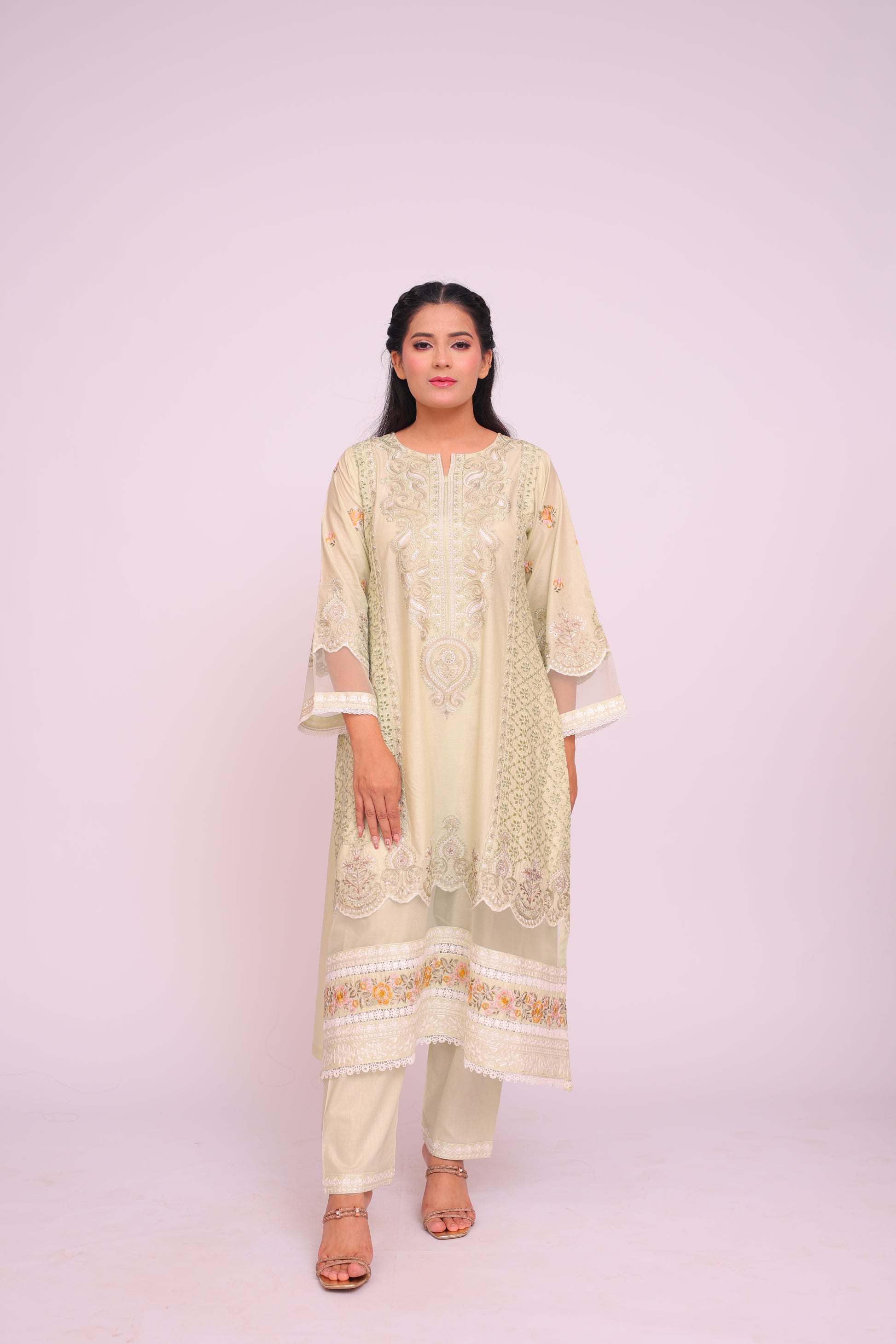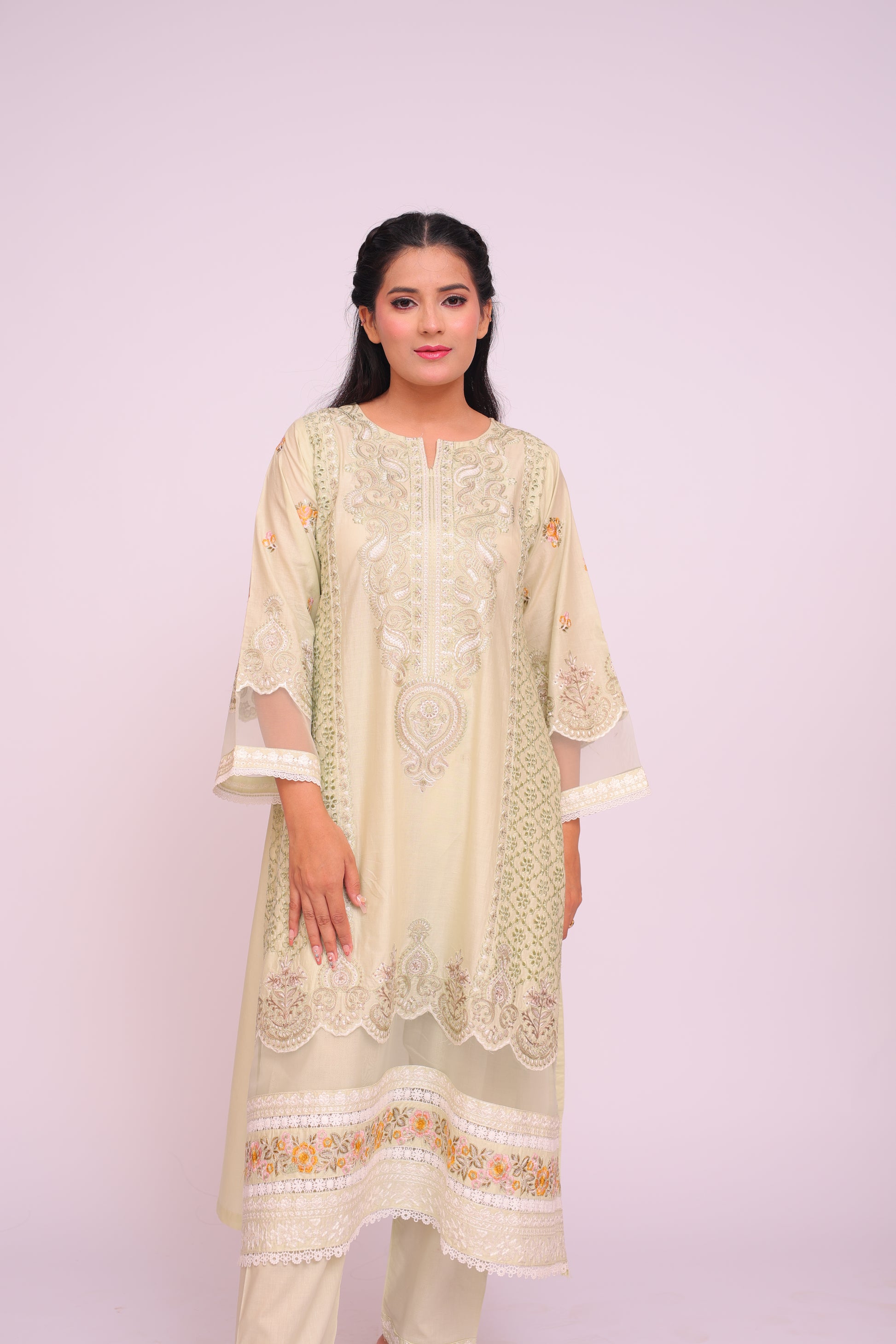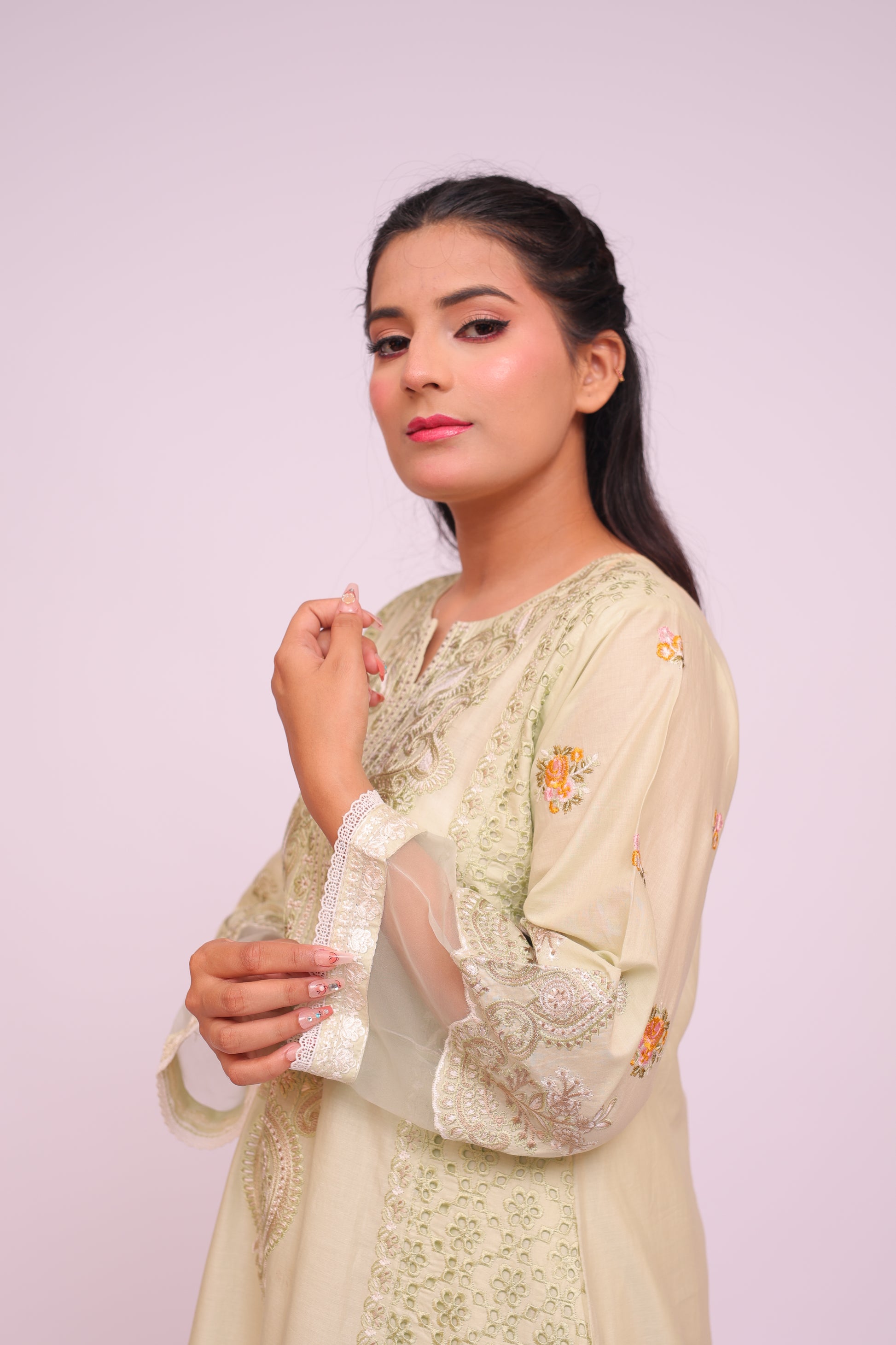 Shirt: Imported Chamery with embroidery, pleated bodice, lace-trimmed daman and sleeves