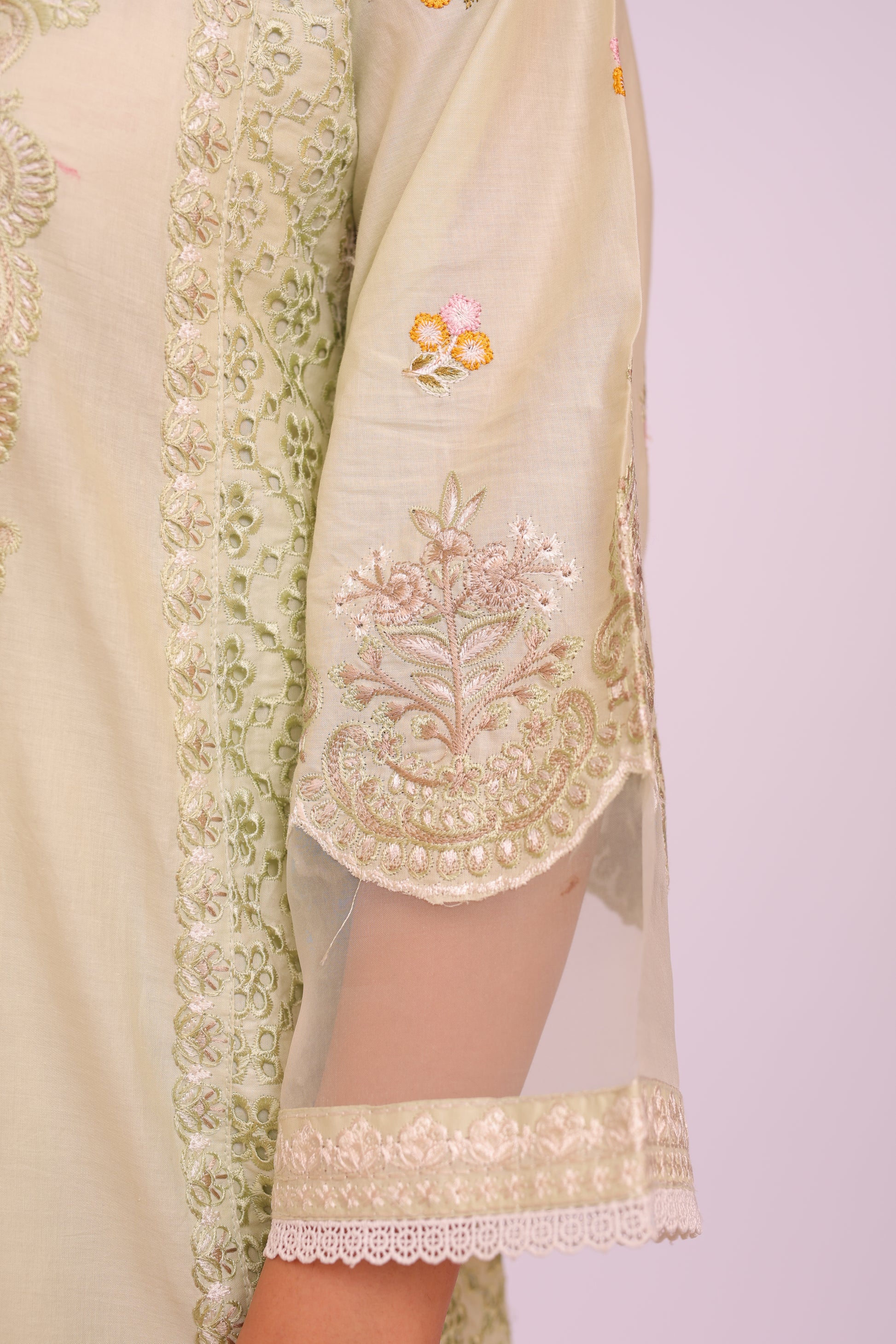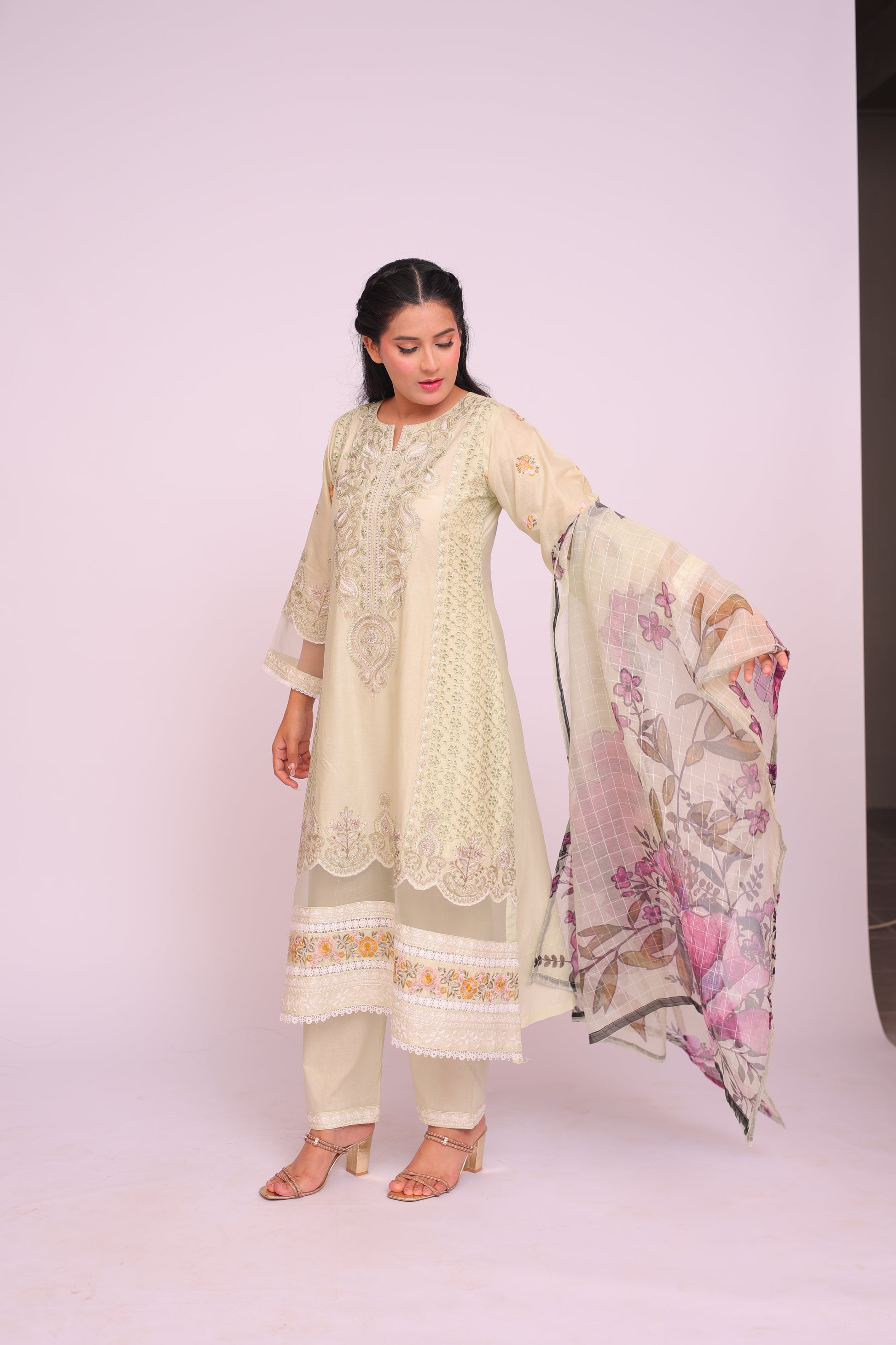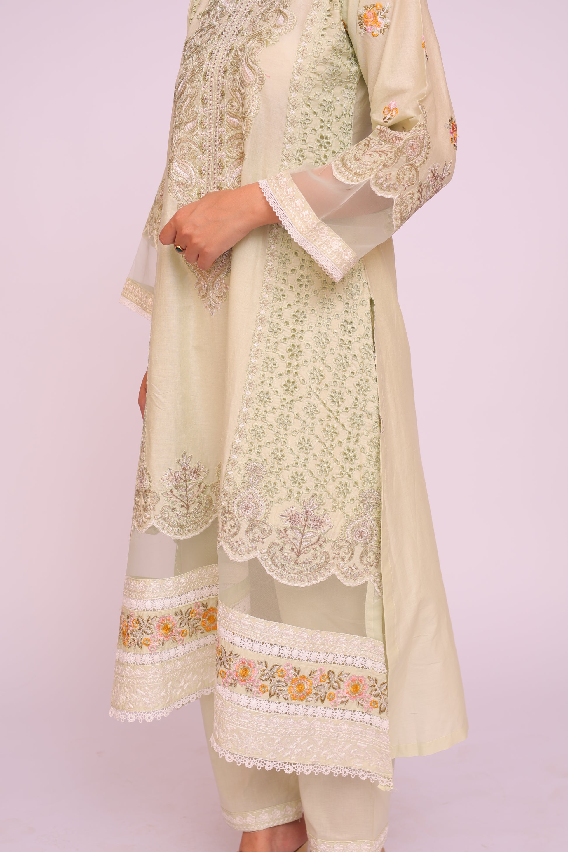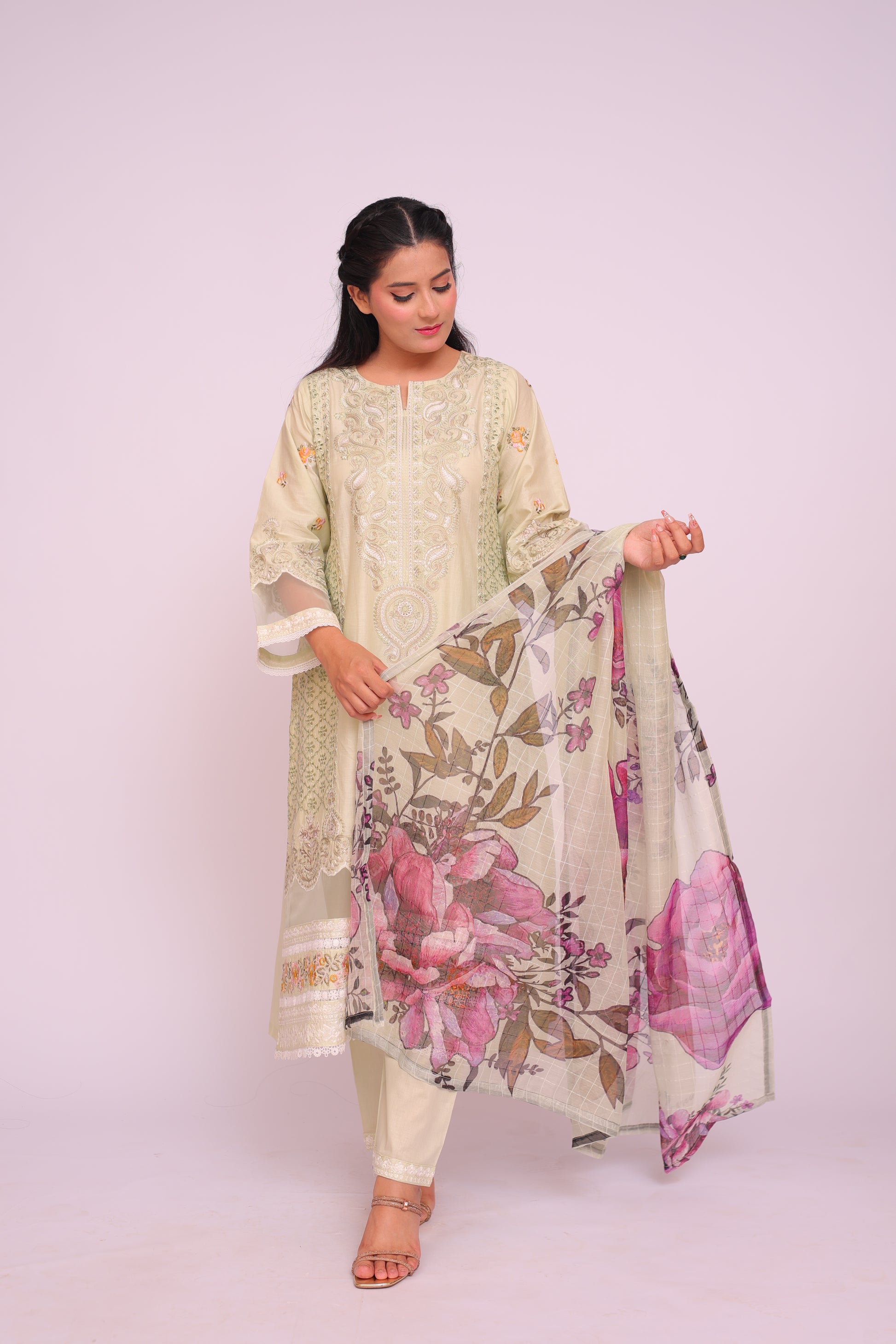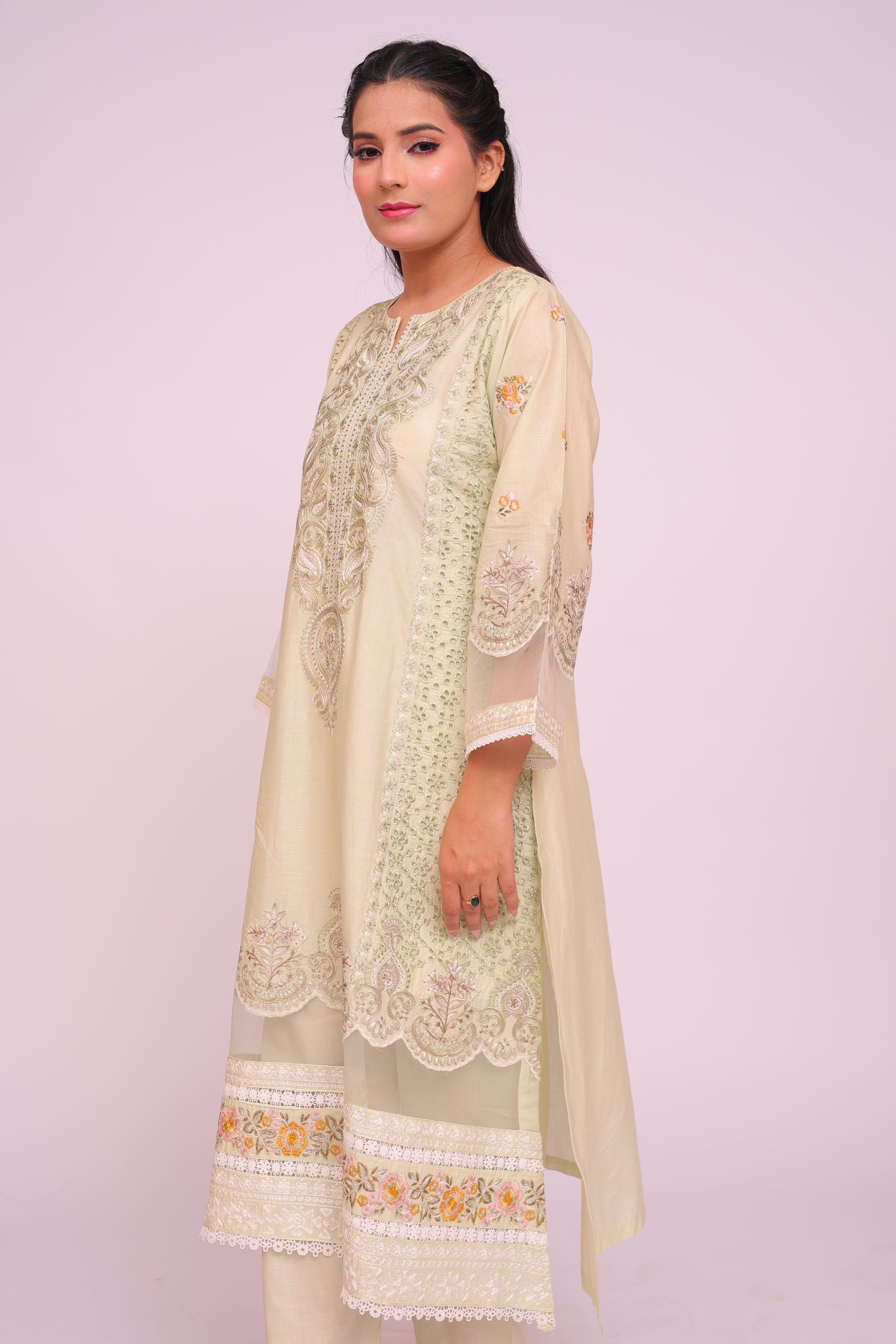 Shirt: Imported Chamery with embroidery, pleated bodice, lace-trimmed daman and sleeves
