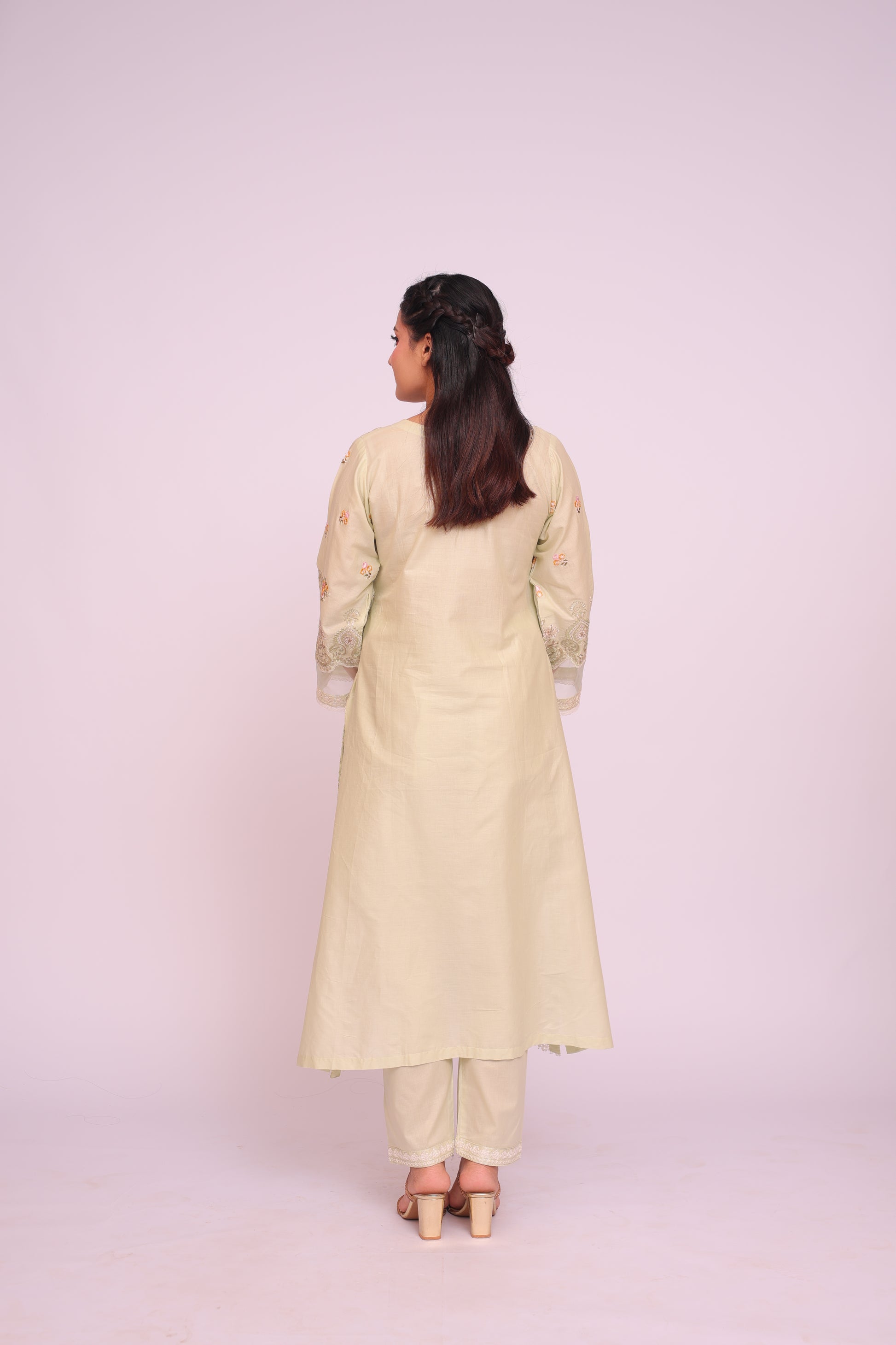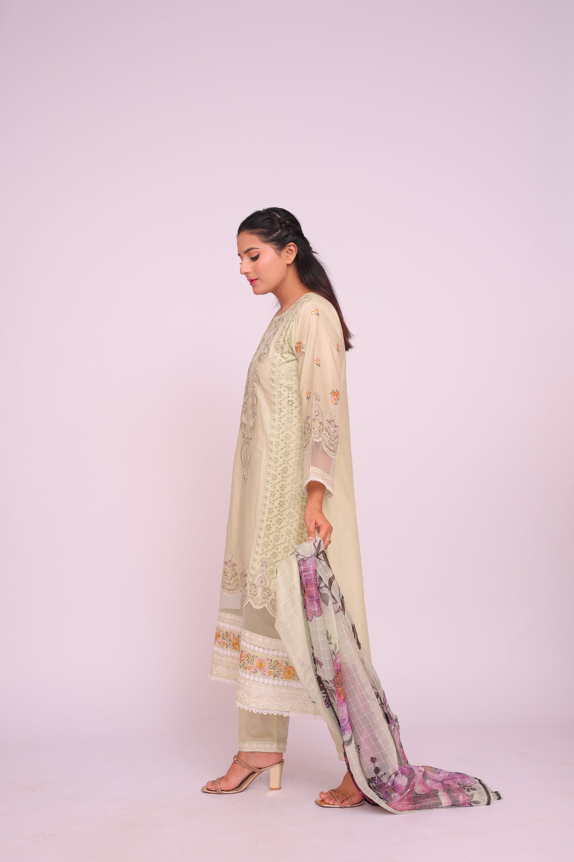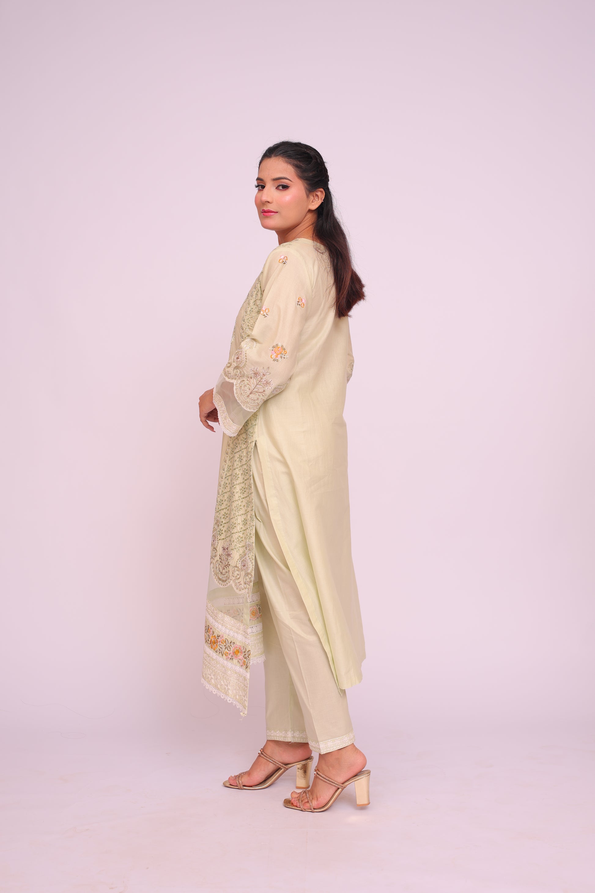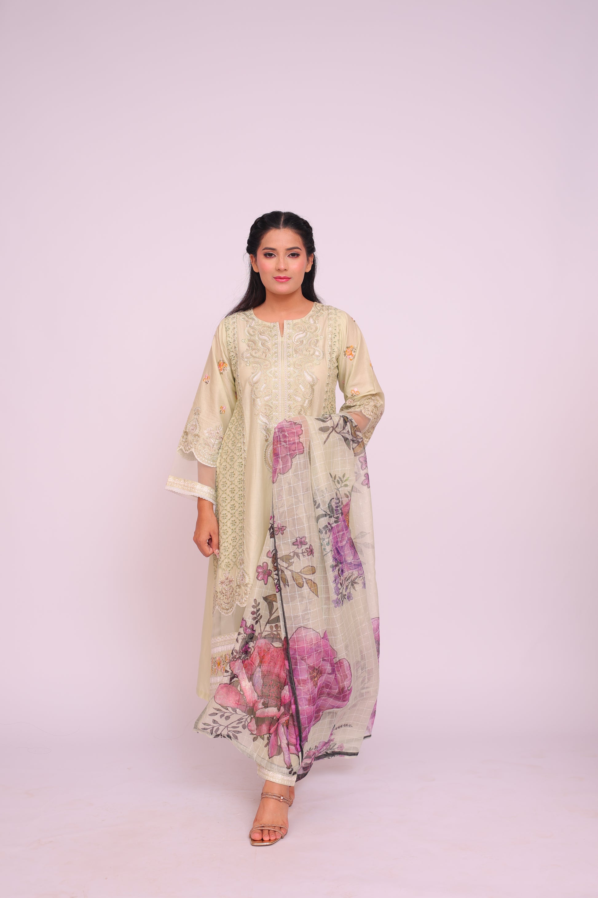 Shirt: Imported Chamery with embroidery, pleated bodice, lace-trimmed daman and sleeves