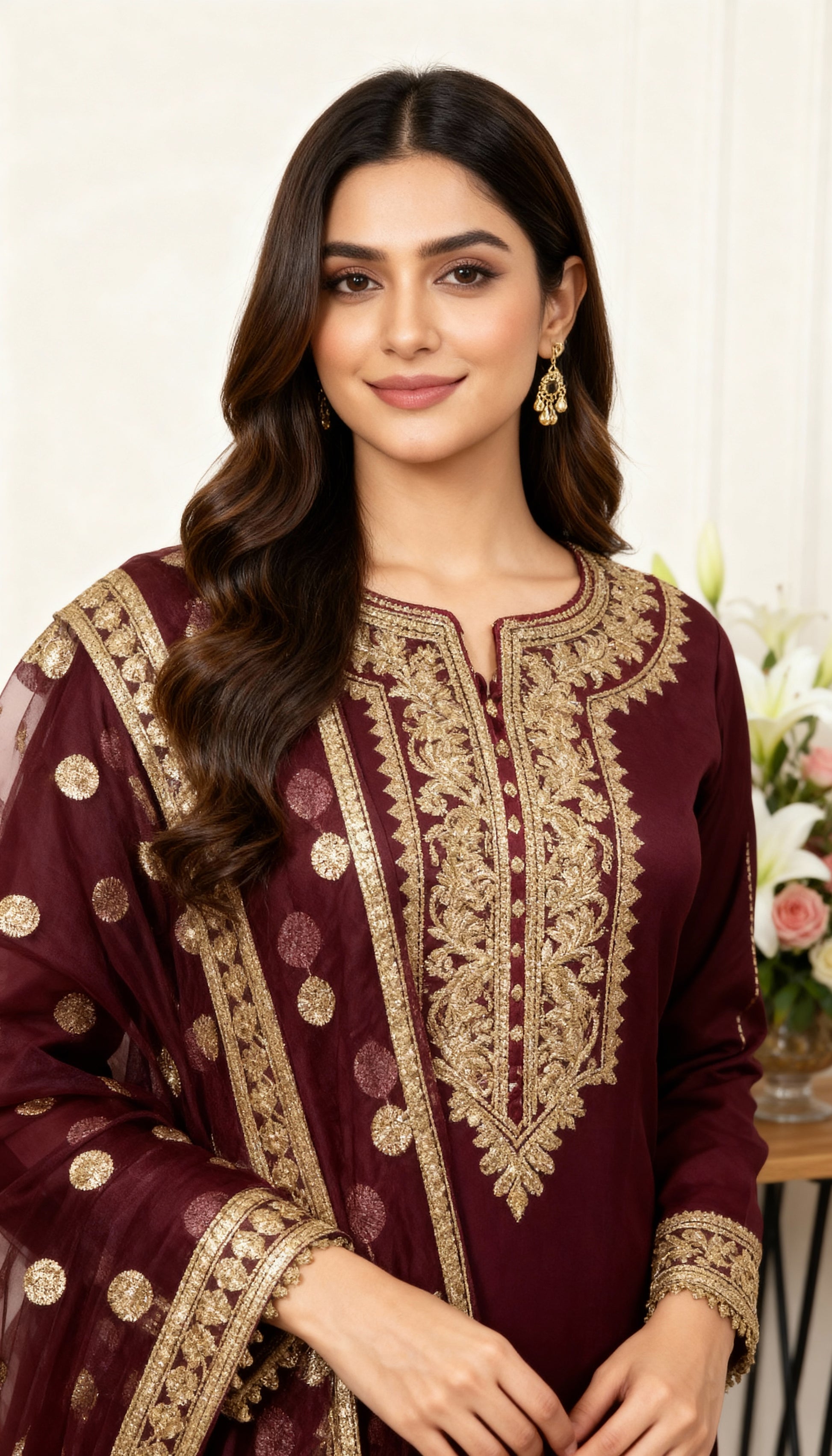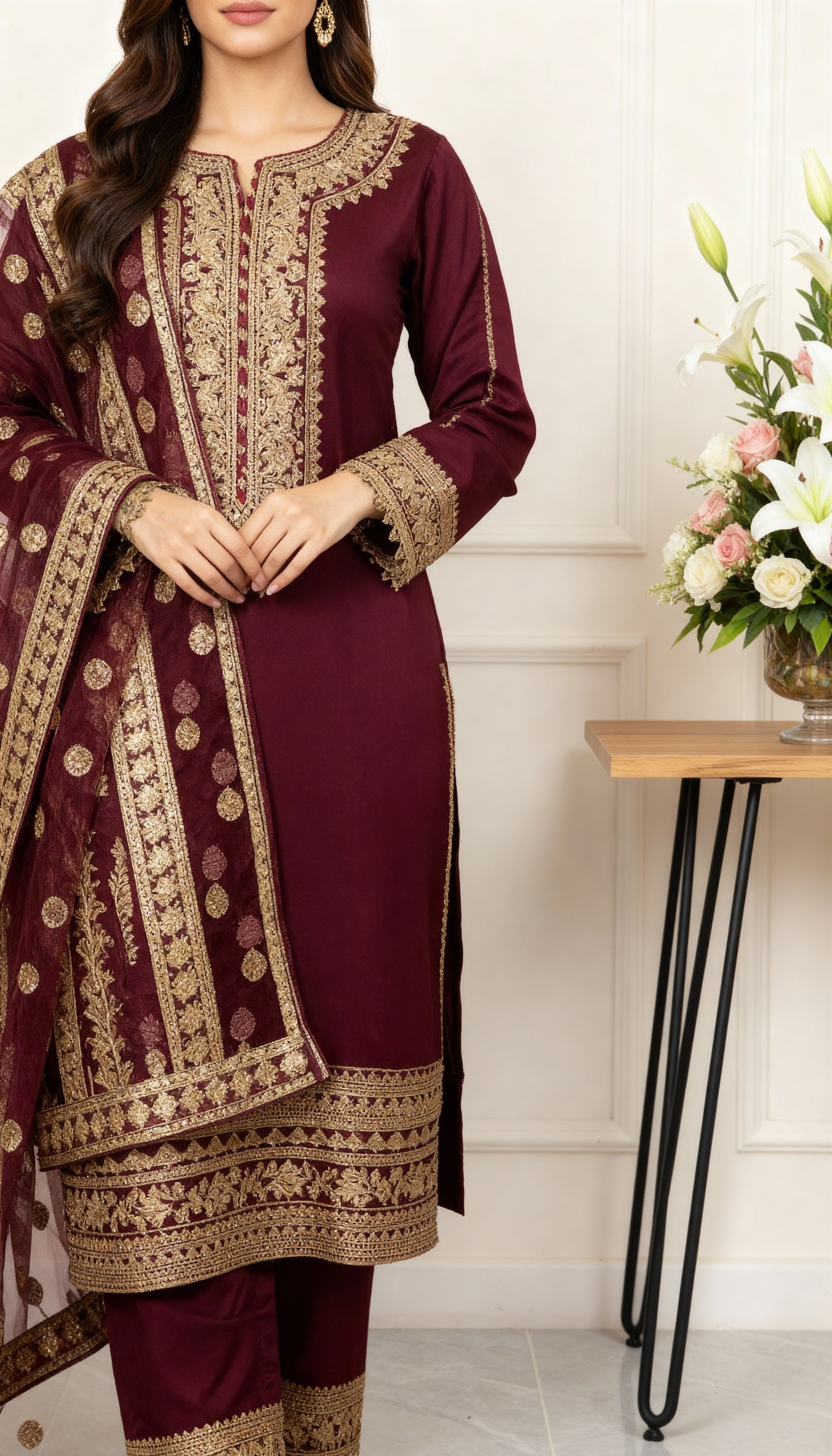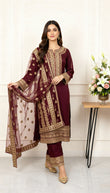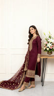 Radiate timeless elegance in Burgundy, a luxurious 3-piece ensemble crafted from premium Viscous . The deep maroon base is beautifully complemented by intricate gold zari embroidery adorning the neckline, sleeves, and hemline, exuding a regal charm.