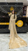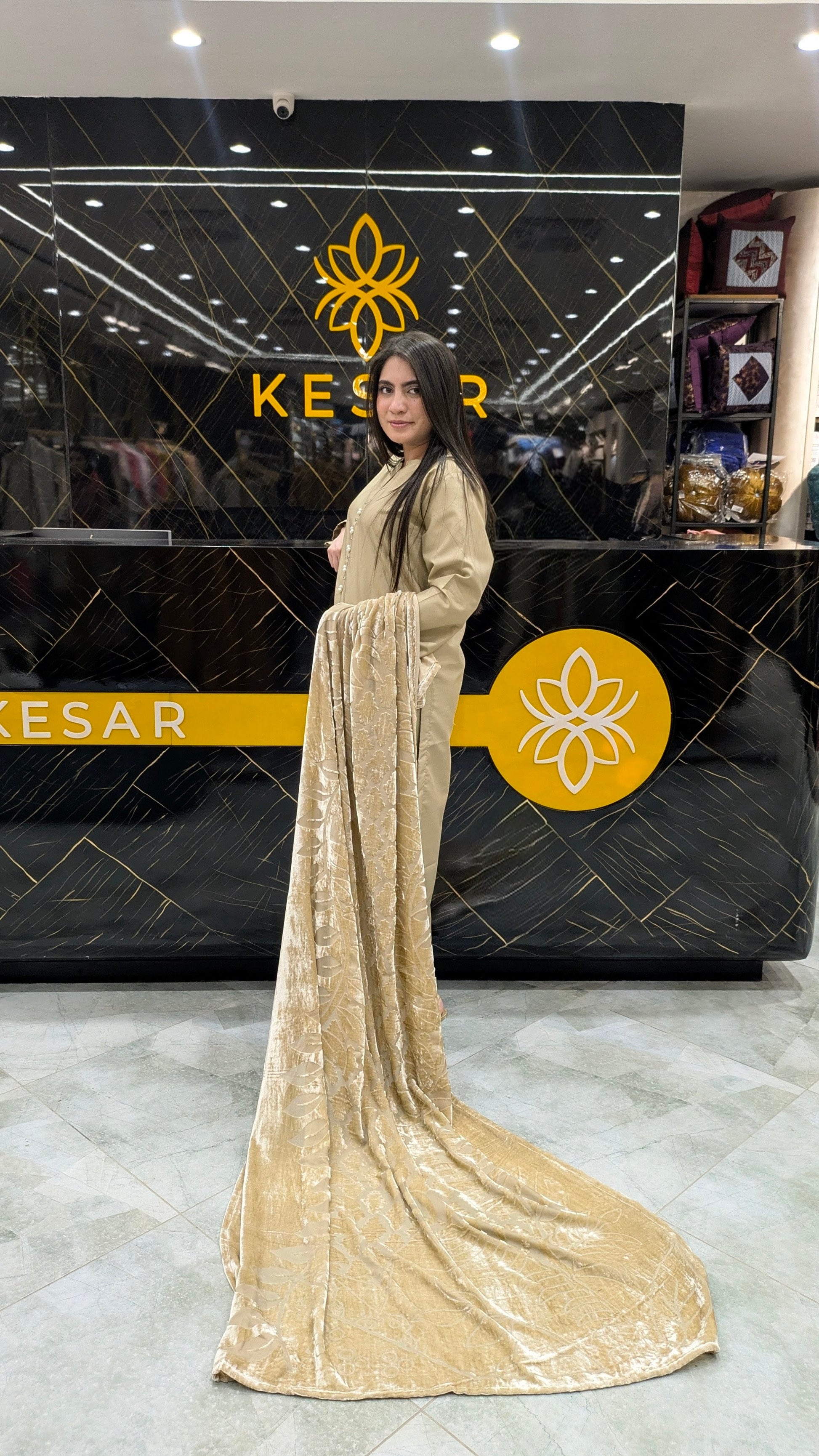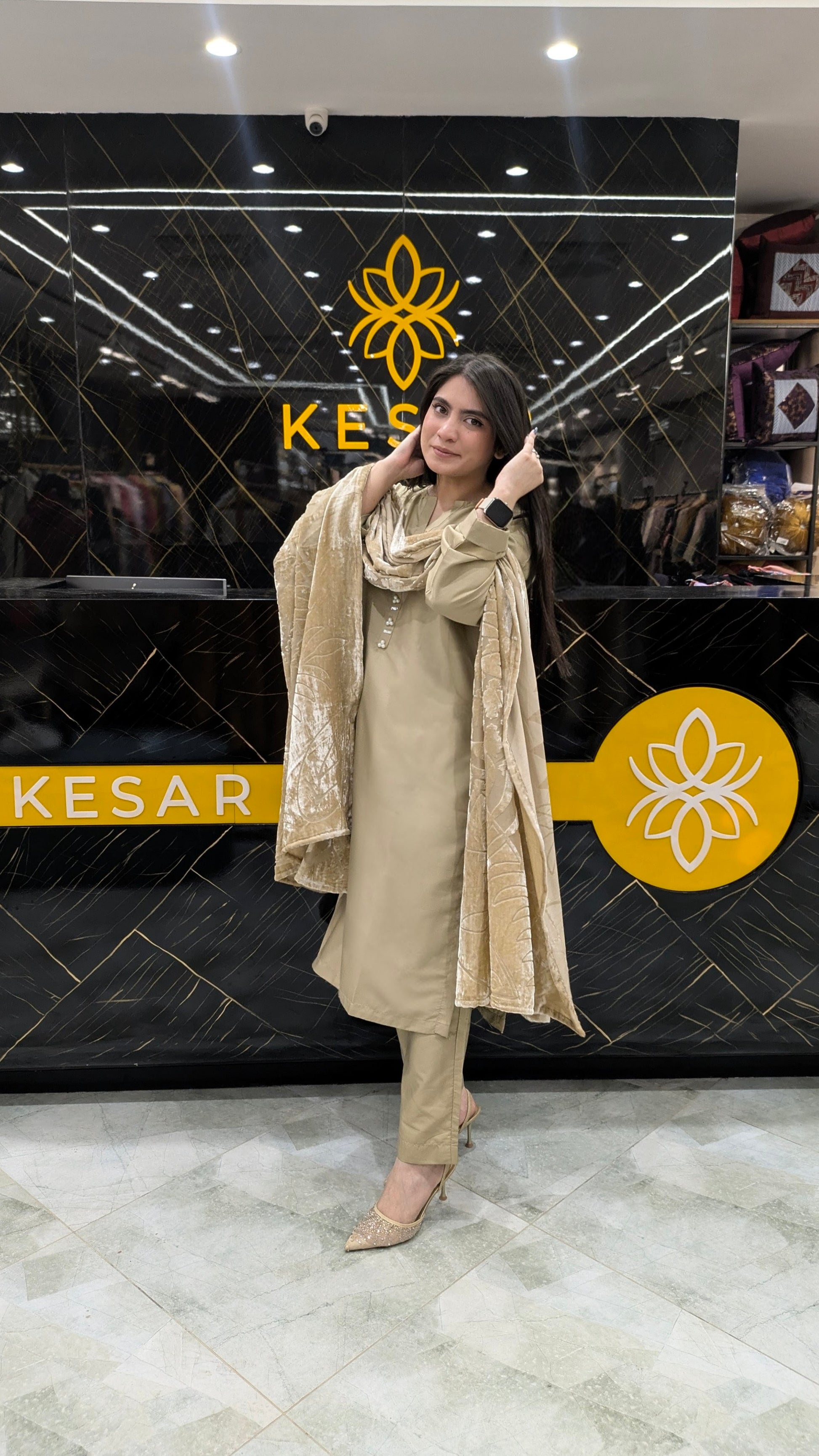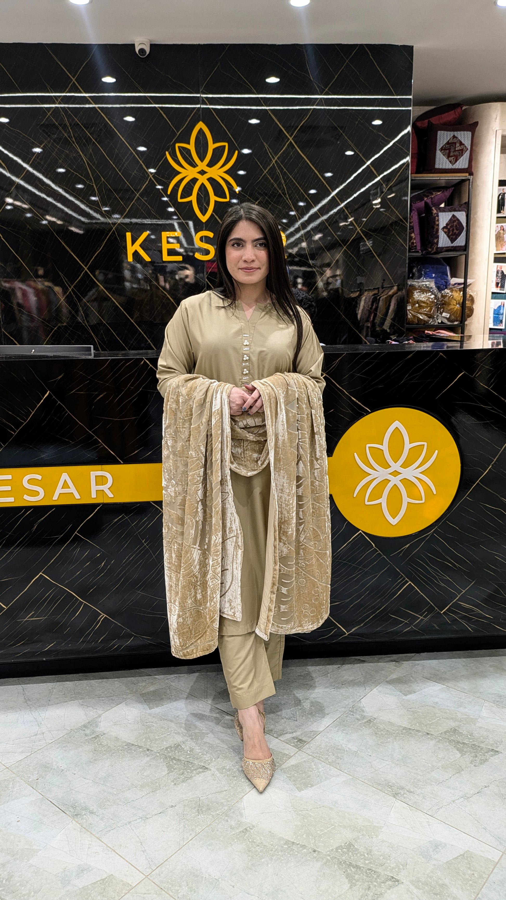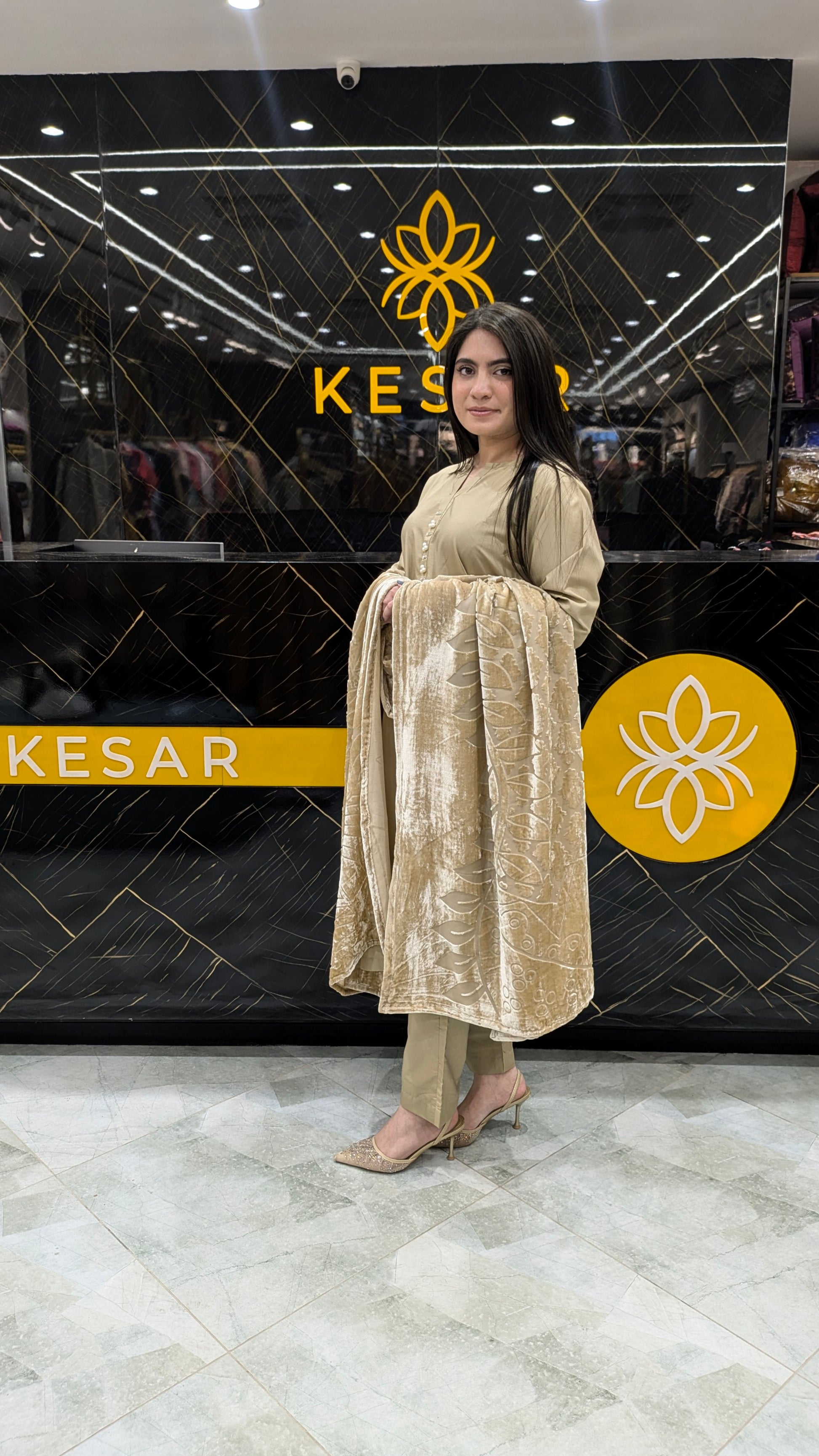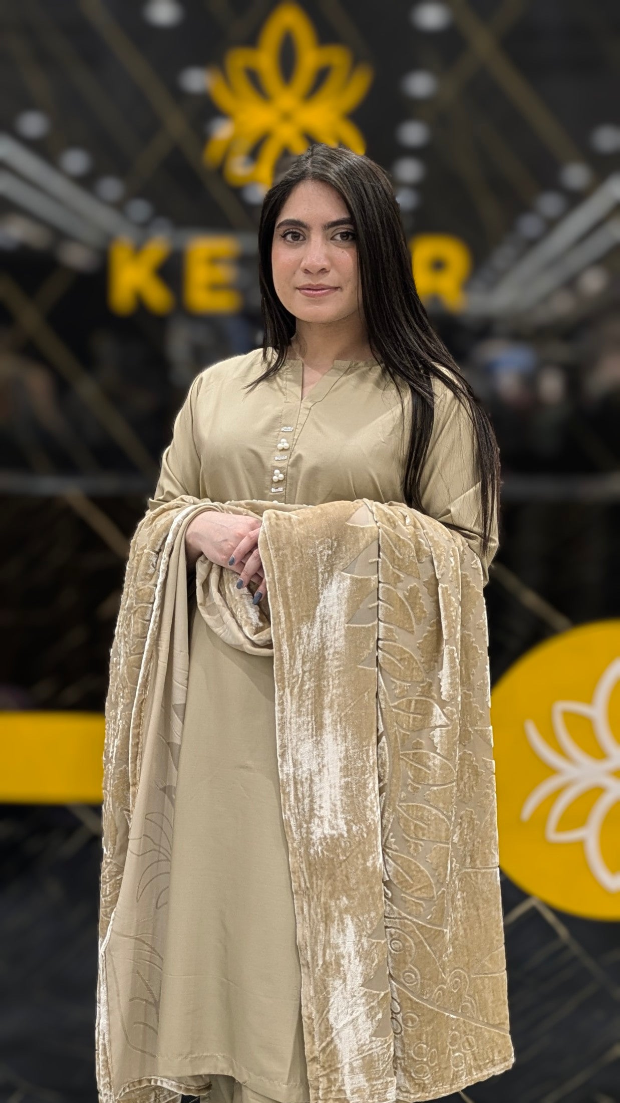 This stunning soft-gold outfit brings effortless sophistication to your wardrobe. The plain shirt and trouser are designed in a smooth, elegant fabric, giving a refined and graceful look. Its highlight is the luxurious velvet-textured dupatta, adding richness, depth, and a premium feel to the overall style. Perfect for semi-formal gatherings, festive dinners, and occasions where you want to look chic without going over the top. A timeless color combination that suits every skin tone, offering a classy, polished, and truly elegant appearance.