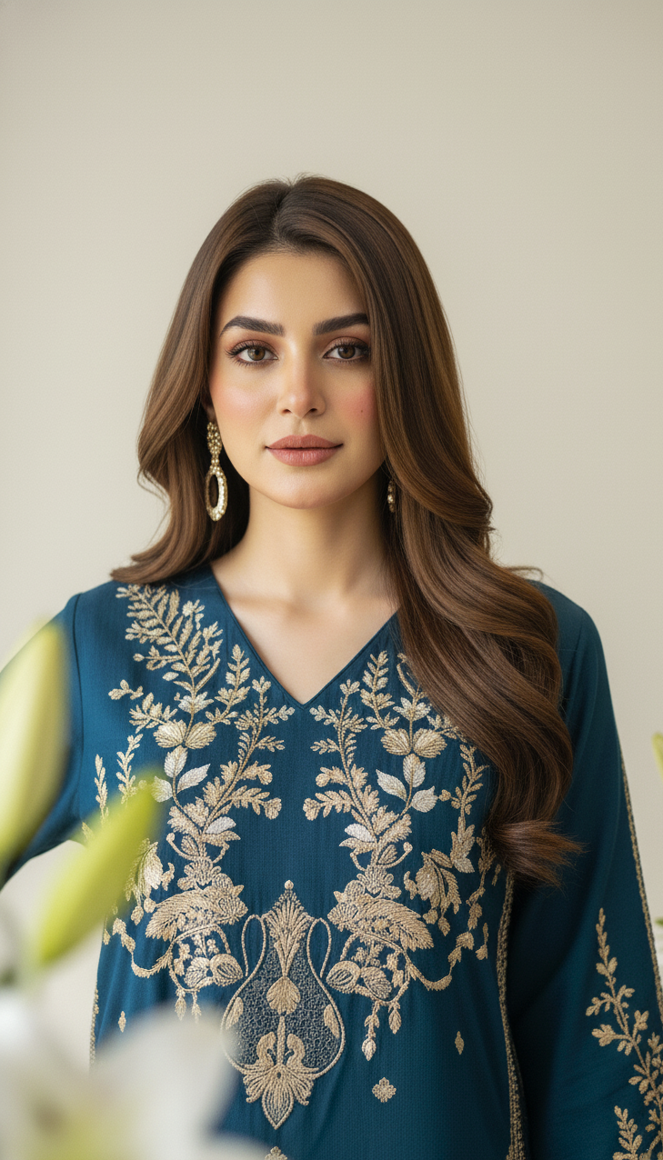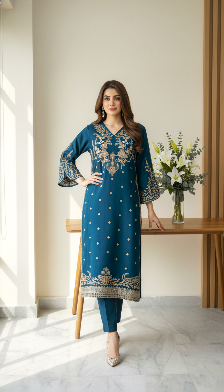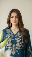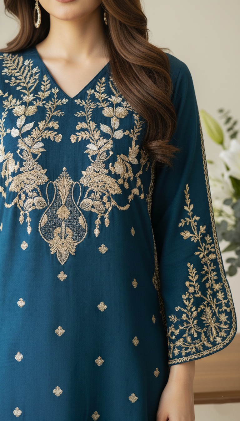 Shirt: Premium Viscose featuring intricate thread embroidery on the neckline, front panel, sleeves, and hem. The deep teal shade is beautifully elevated with ornate gold motifs and decorative detailing throughout, adding a luxurious festive look.