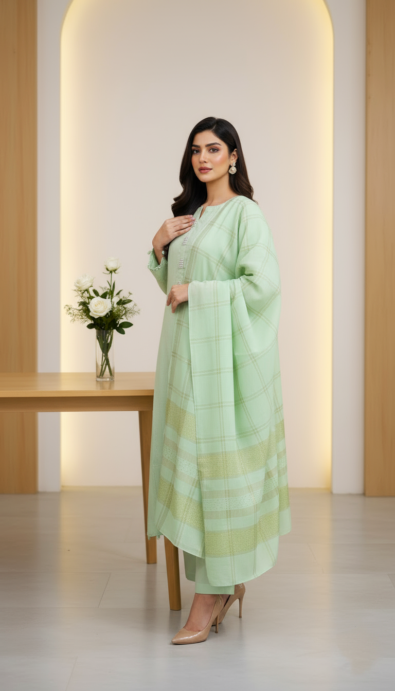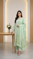 Shirt: Premium Viscose featuring a soft textured weave with fine thread embellishment on the neckline and sleeve edges. The soothing pastel mint color enhances its minimal and elegant look.