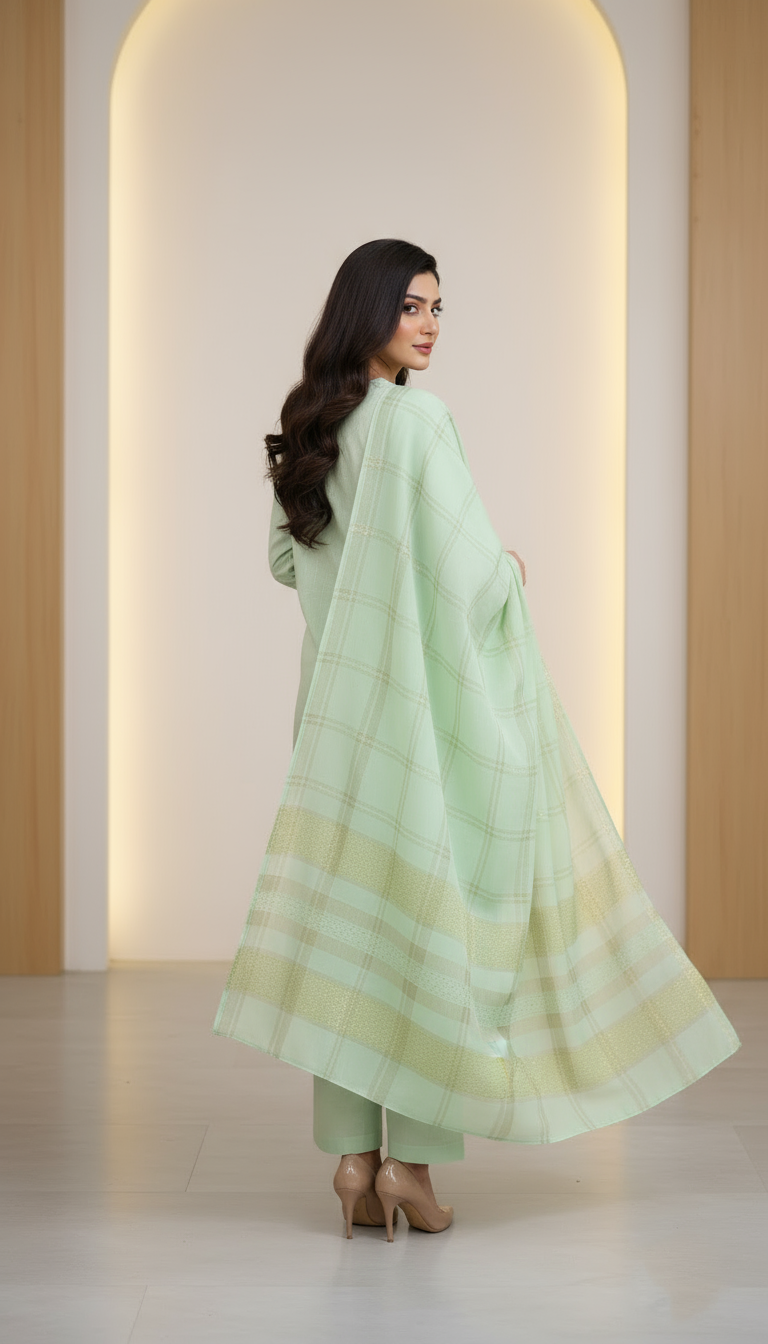 Dupatta: Jacquard Organza Dupatta with a subtle checkered pattern and delicate tonal detailing, adding a sophisticated and airy drape to the ensemble.