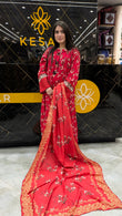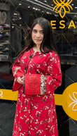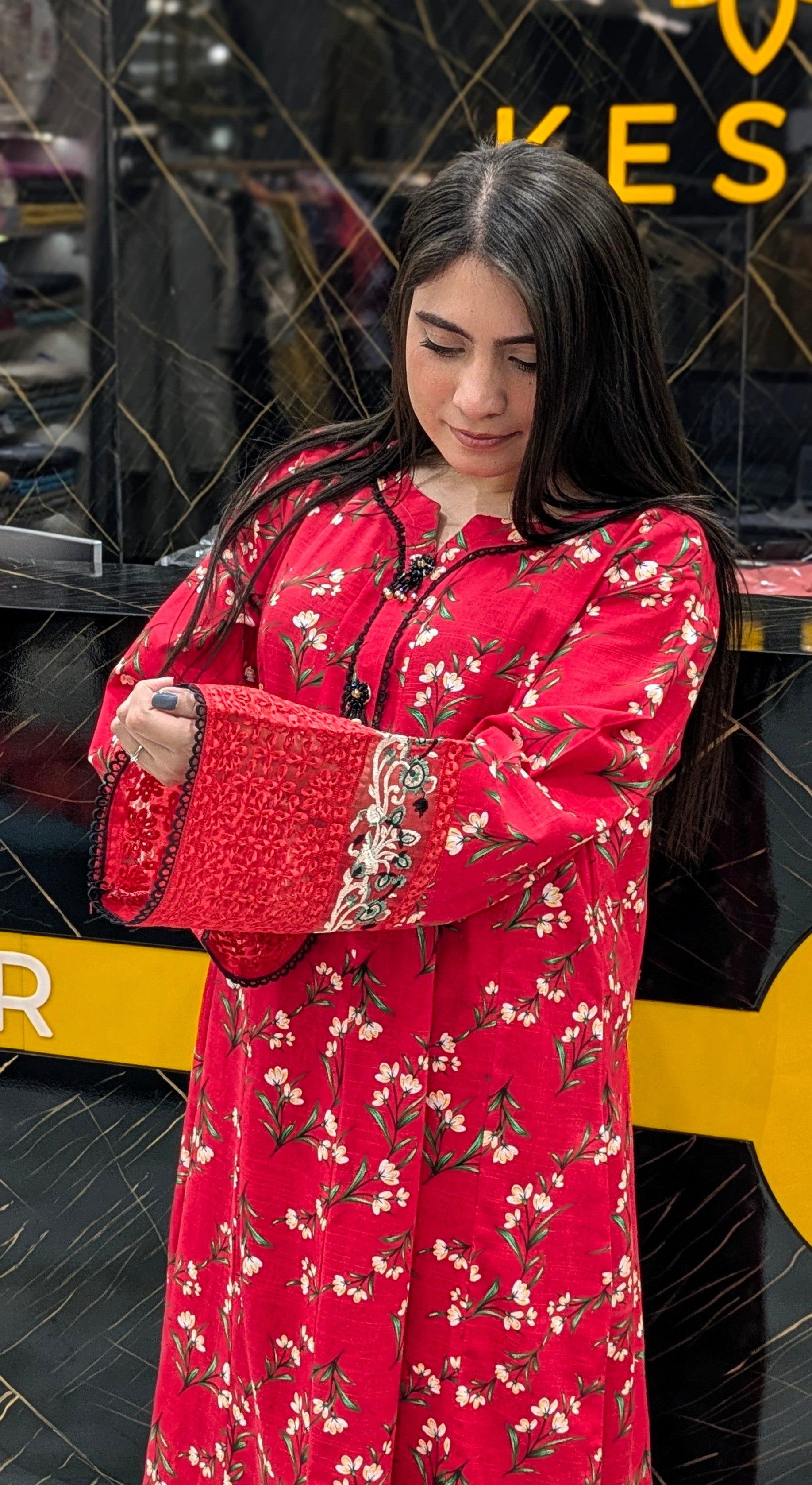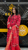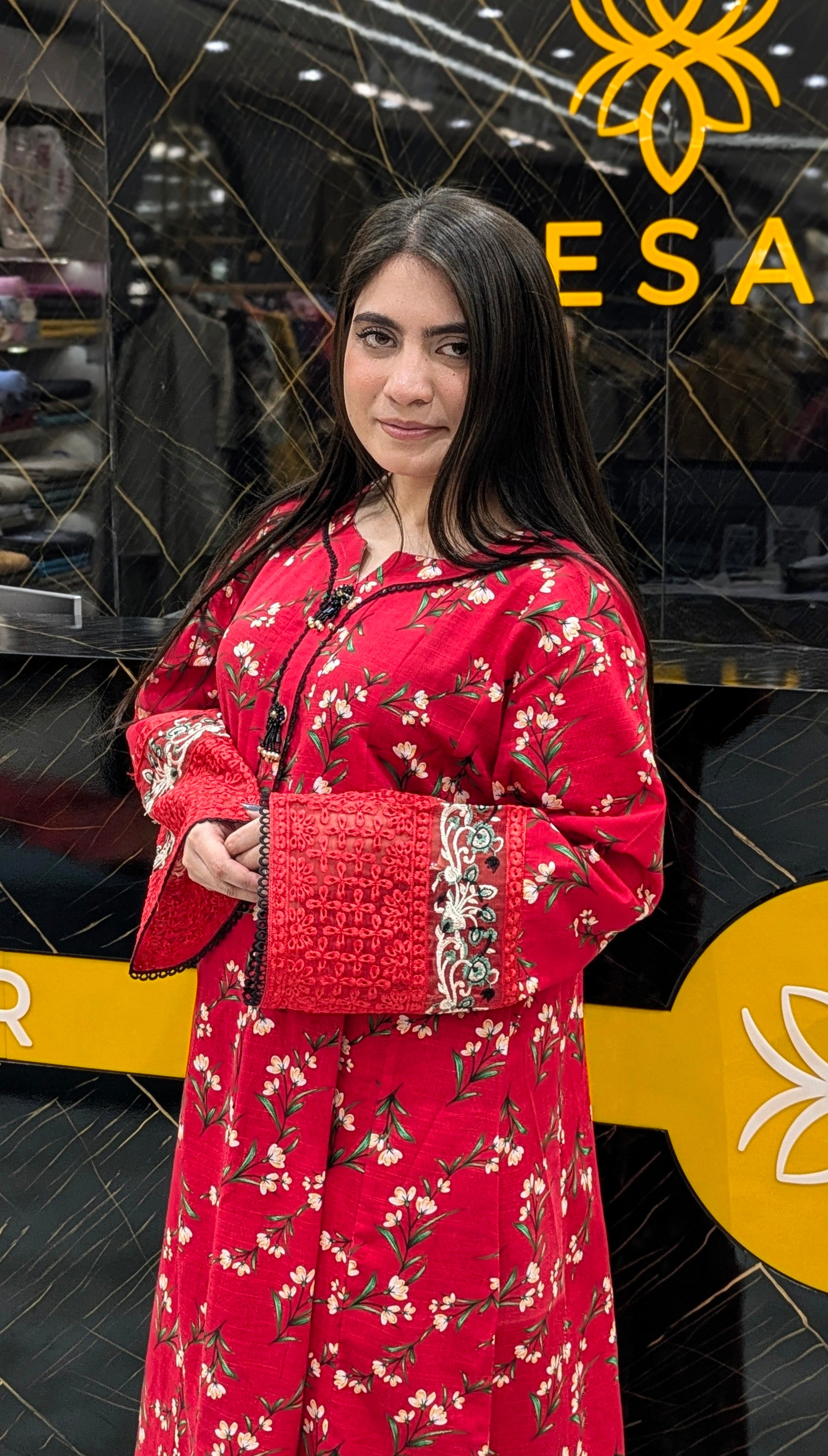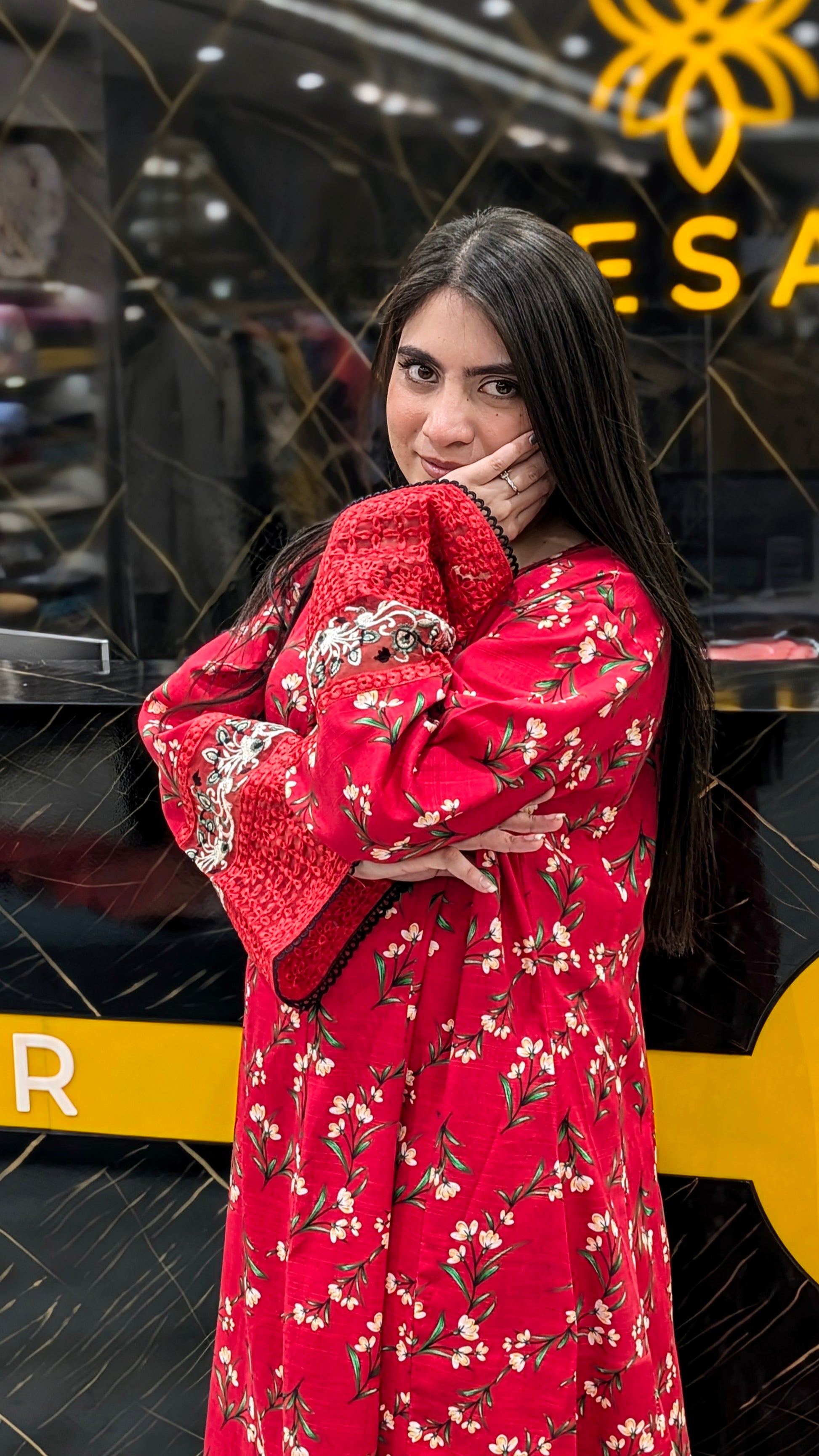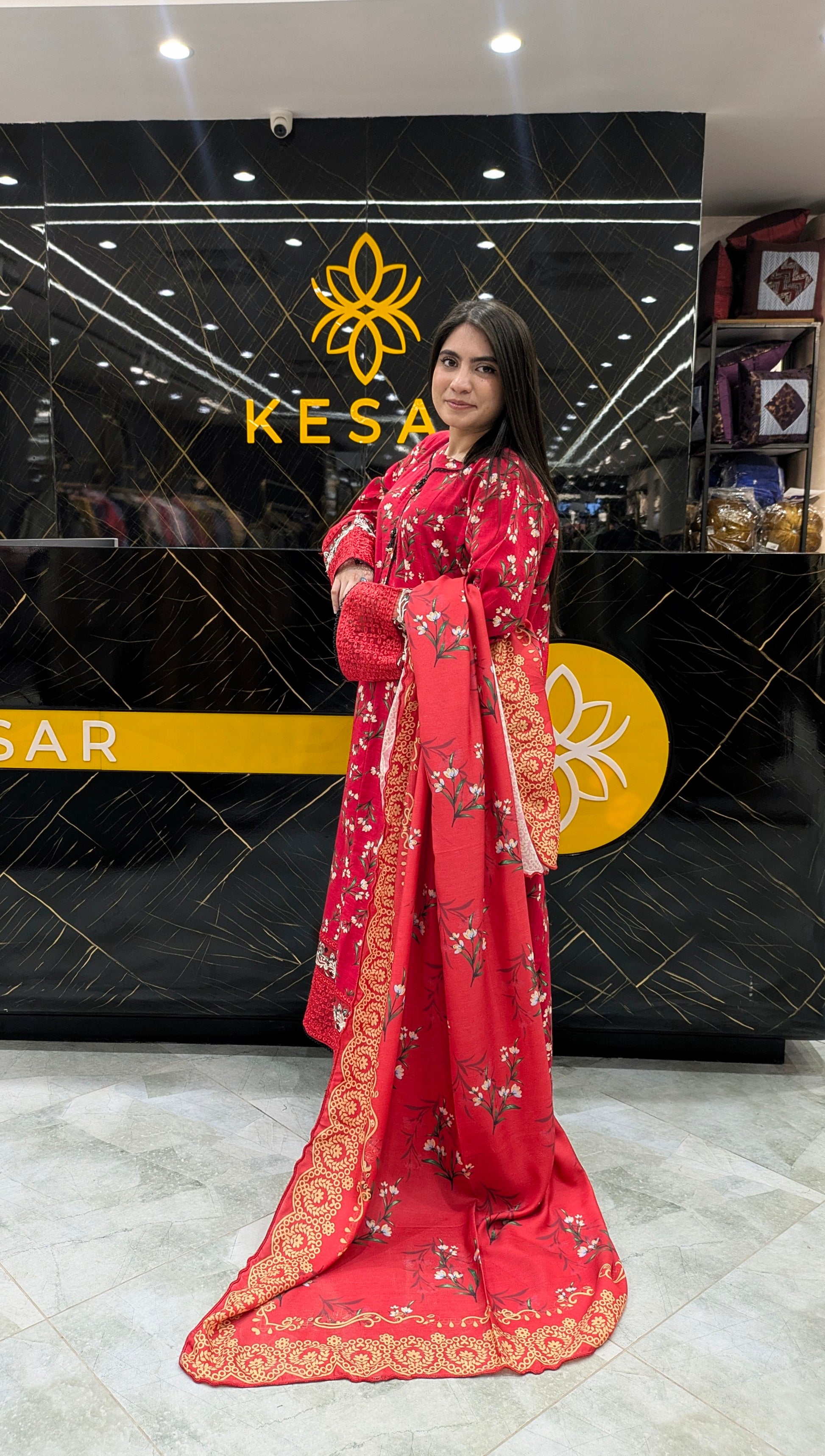 Turn heads with this stunning scarlet red floral 3-piece suit, designed to bring effortless charm and elegance to your festive wardrobe. The soft floral print paired with detailed embroidered cuffs and neckline adds richness and sophistication to the look. Its beautifully matching dupatta drapes gracefully, creating a classy and feminine silhouette. Comfortable, premium, and eye-catching—this outfit is perfect for dinners, family gatherings, festive events, and special occasions. A flawless choice for women who love vibrant colours with elegant detailing.