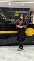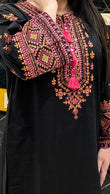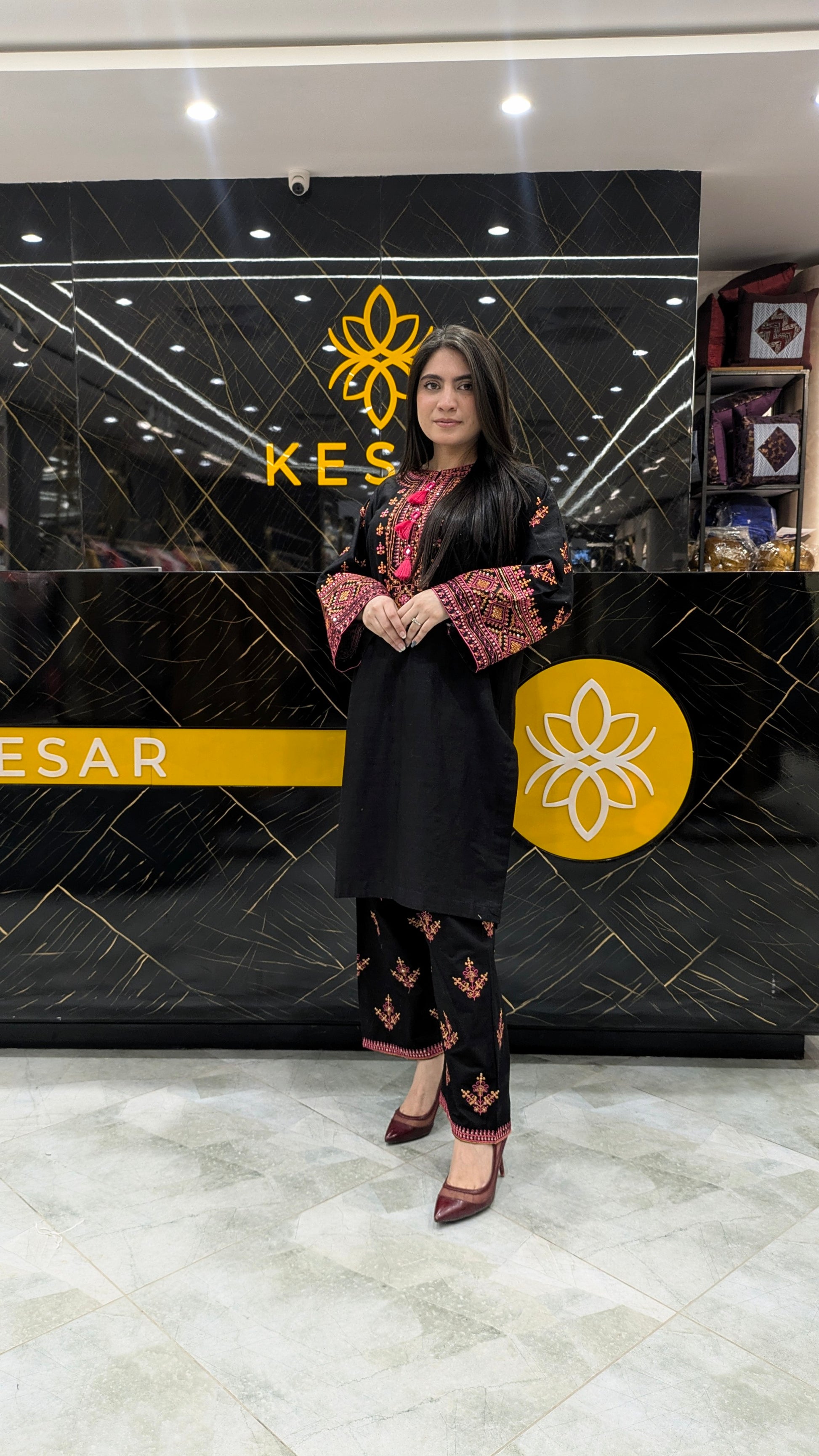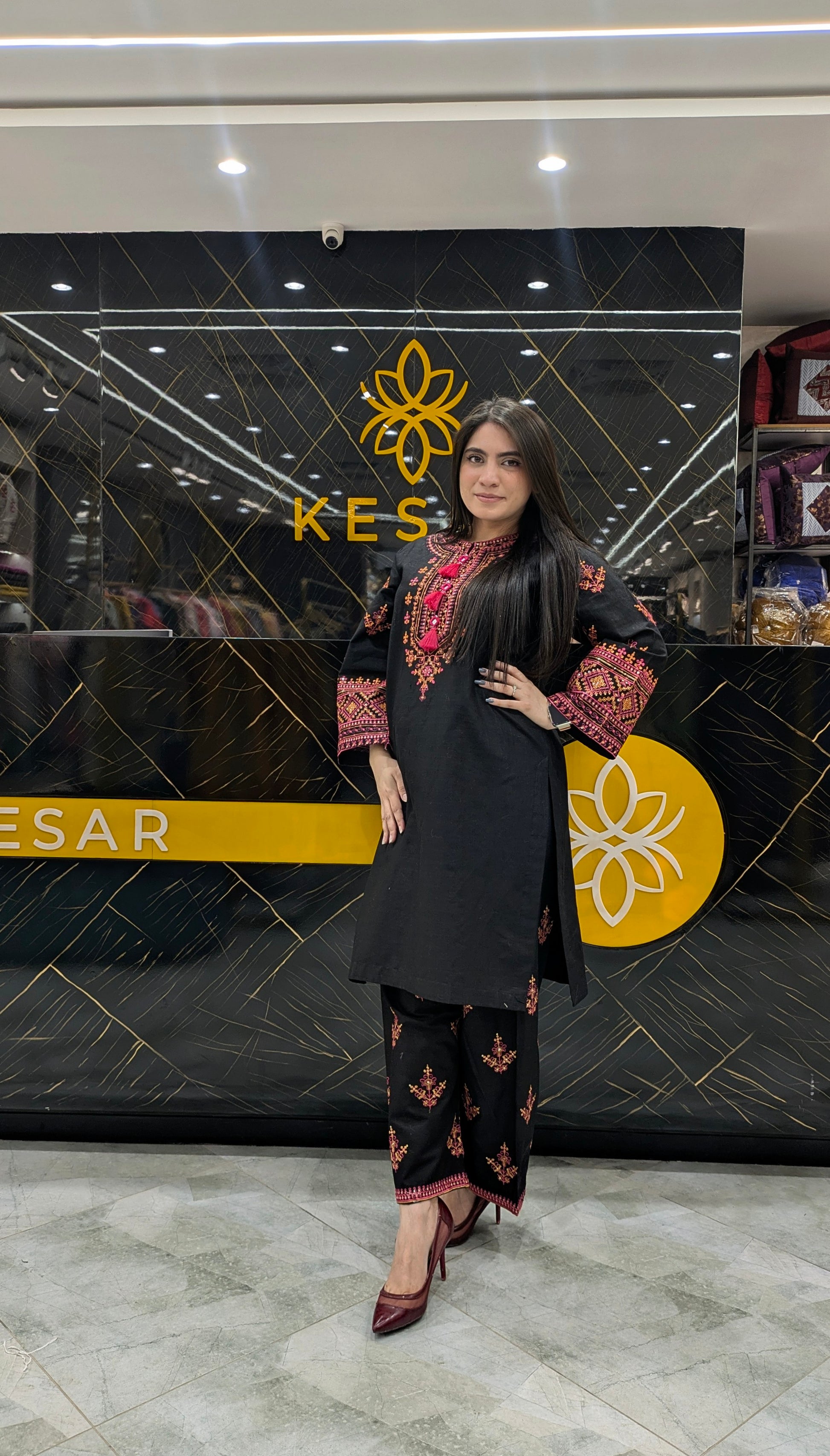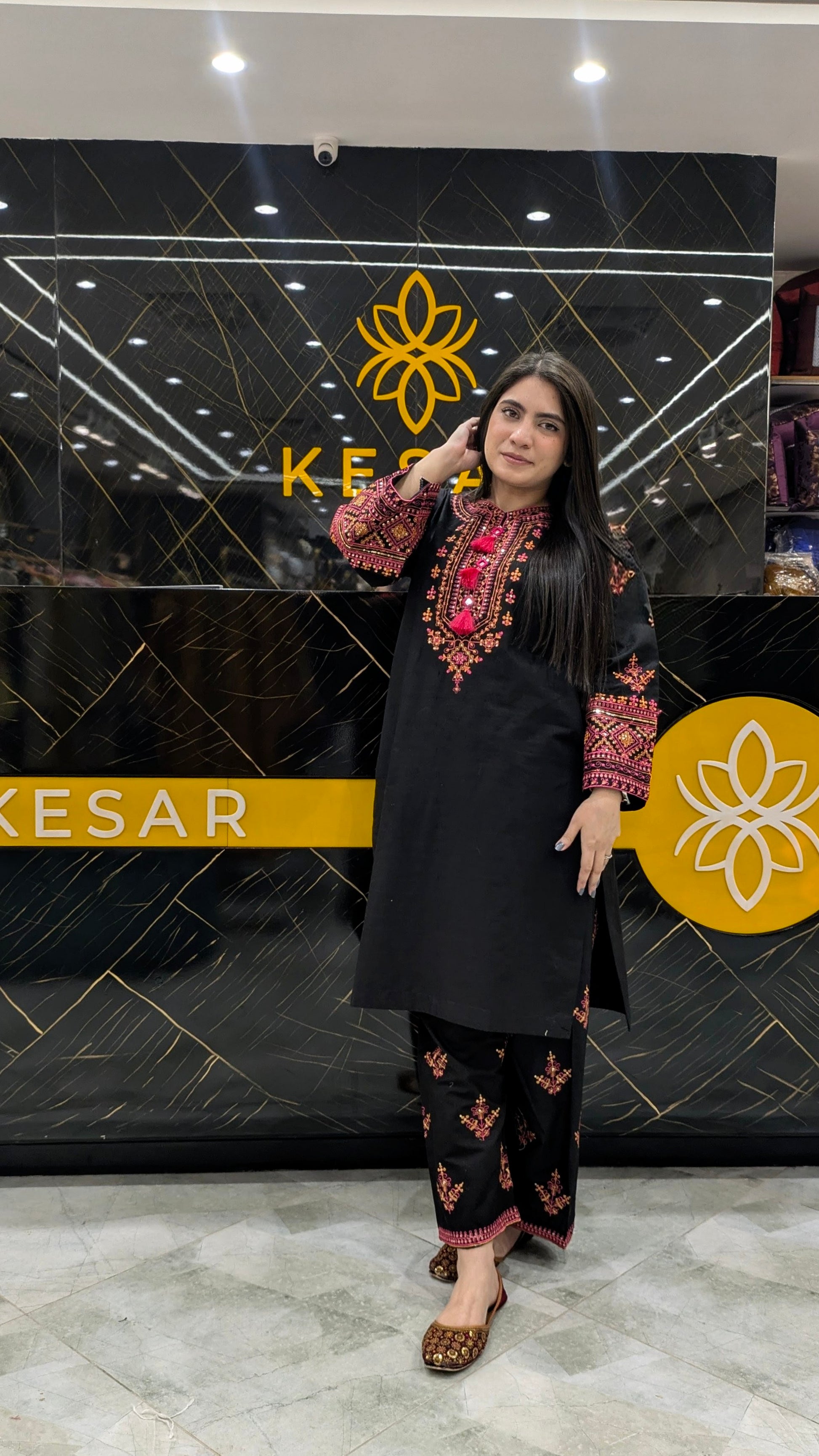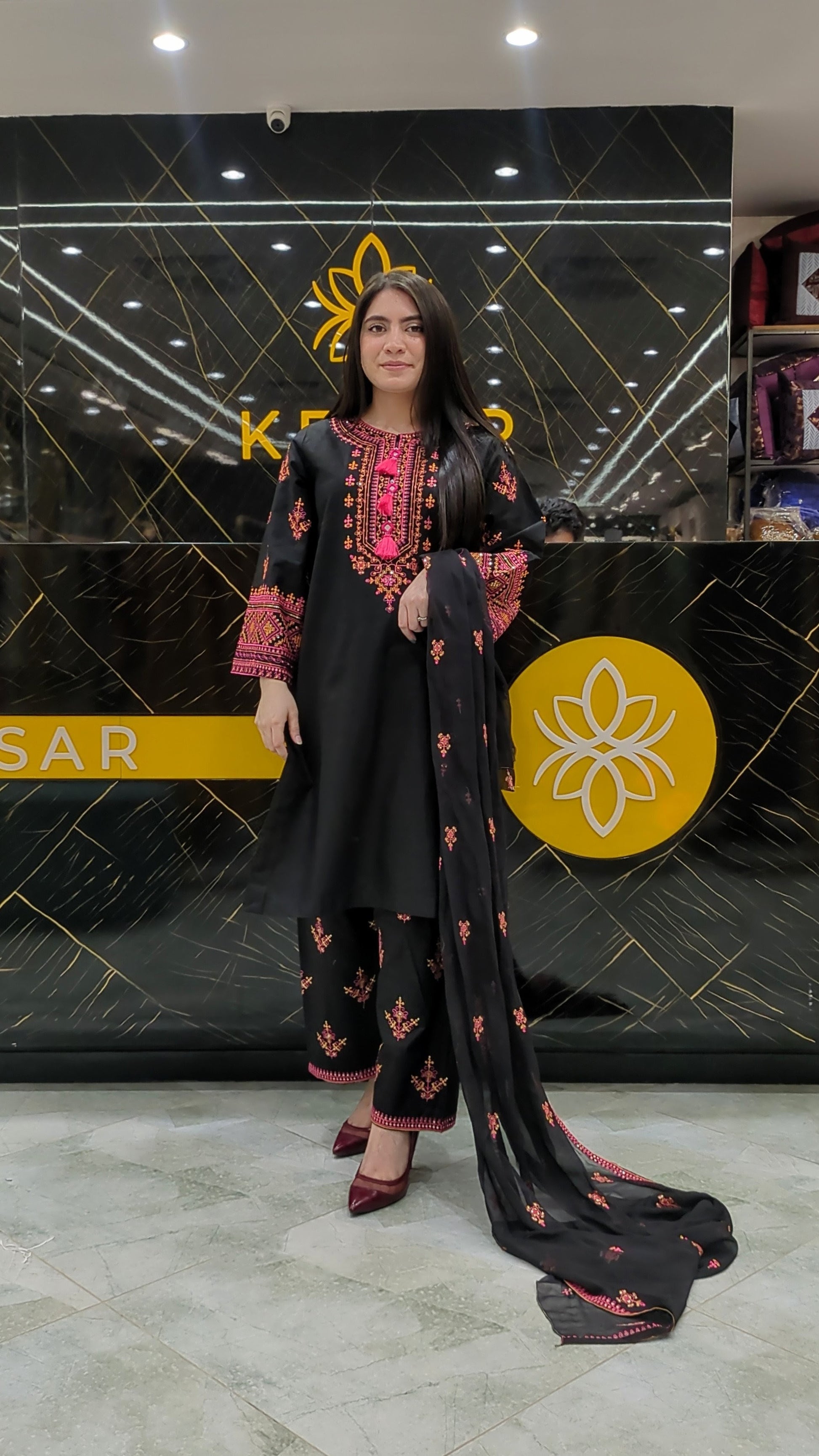 Make a bold style statement with this luxurious black embroidered 3-piece suit, featuring vibrant pink threadwork that brings stunning contrast and elegance. The beautifully detailed neckline, sleeves, and trousers create a rich, traditional look with a modern twist. Paired with a matching embroidered dupatta, this outfit offers effortless grace and sophistication. Crafted for comfort and beauty, itβs ideal for festive events, mehndi functions, dinners, and special gatherings. A perfect choice for women who love classic black with a touch of vibrant charm.