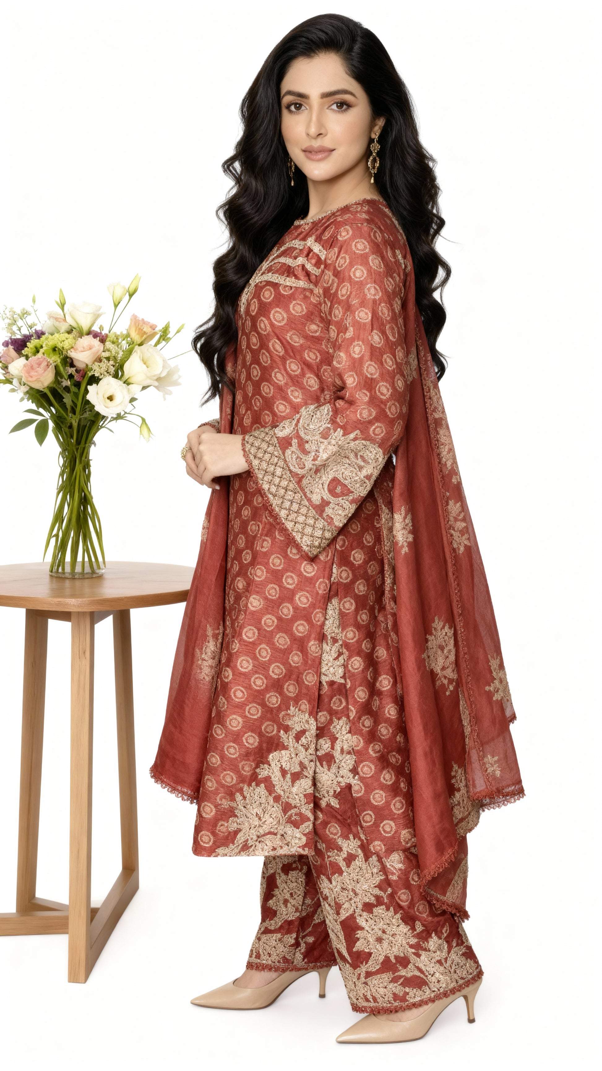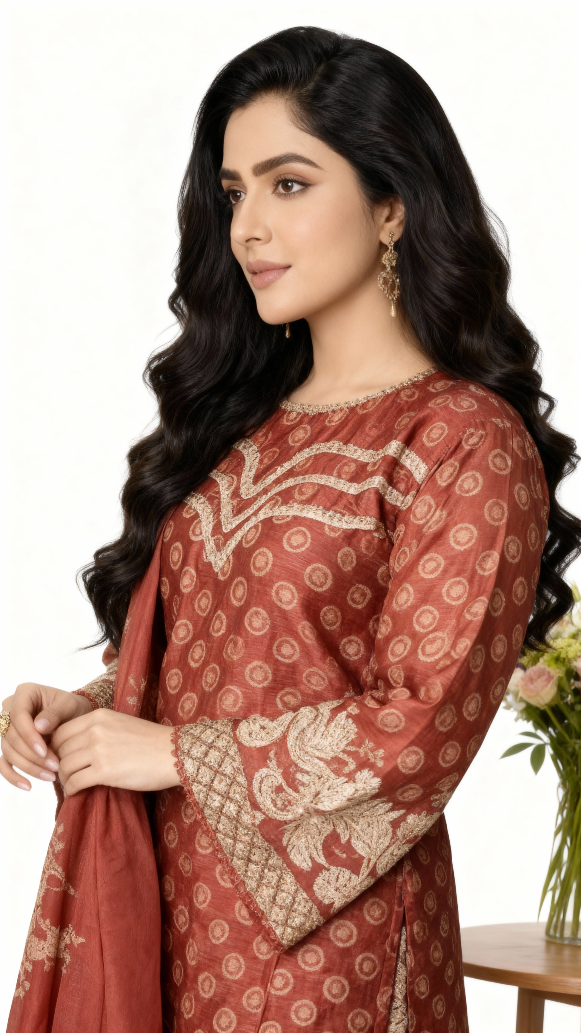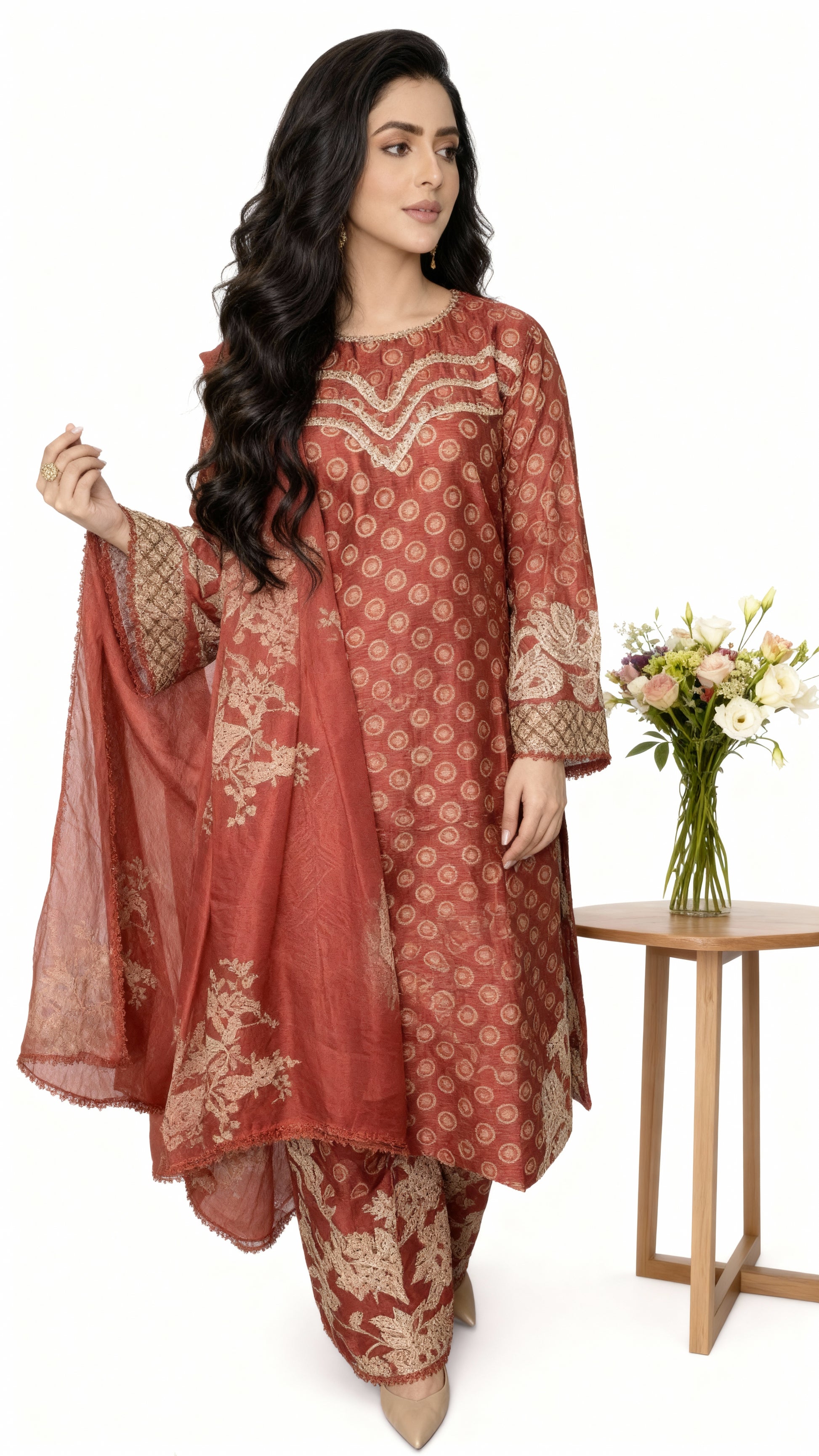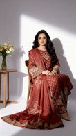 Elevate your festive wardrobe with this exquisite 3-piece China Cambric suit, featuring a rich rust hue adorned with intricate golden embroidery.