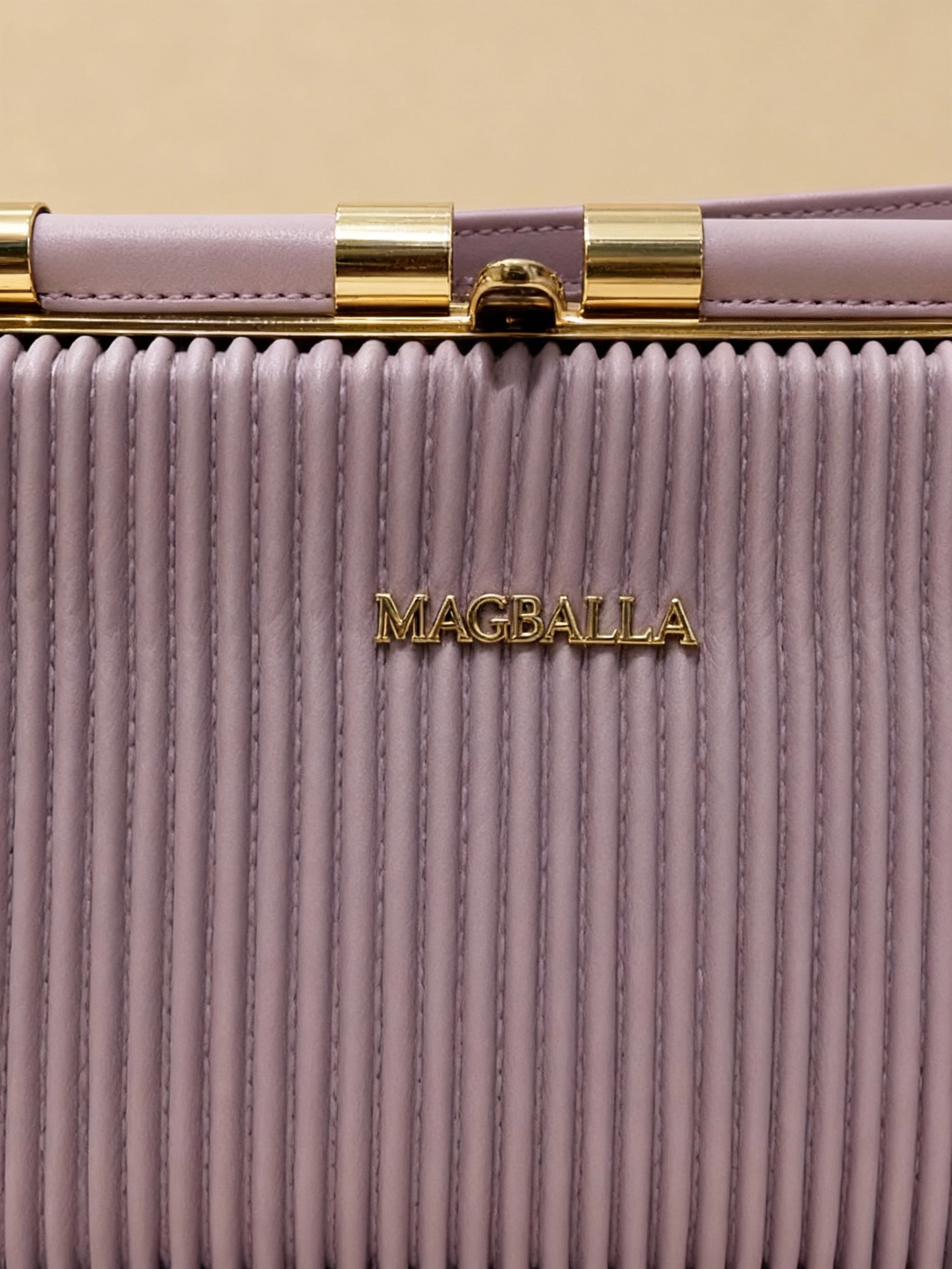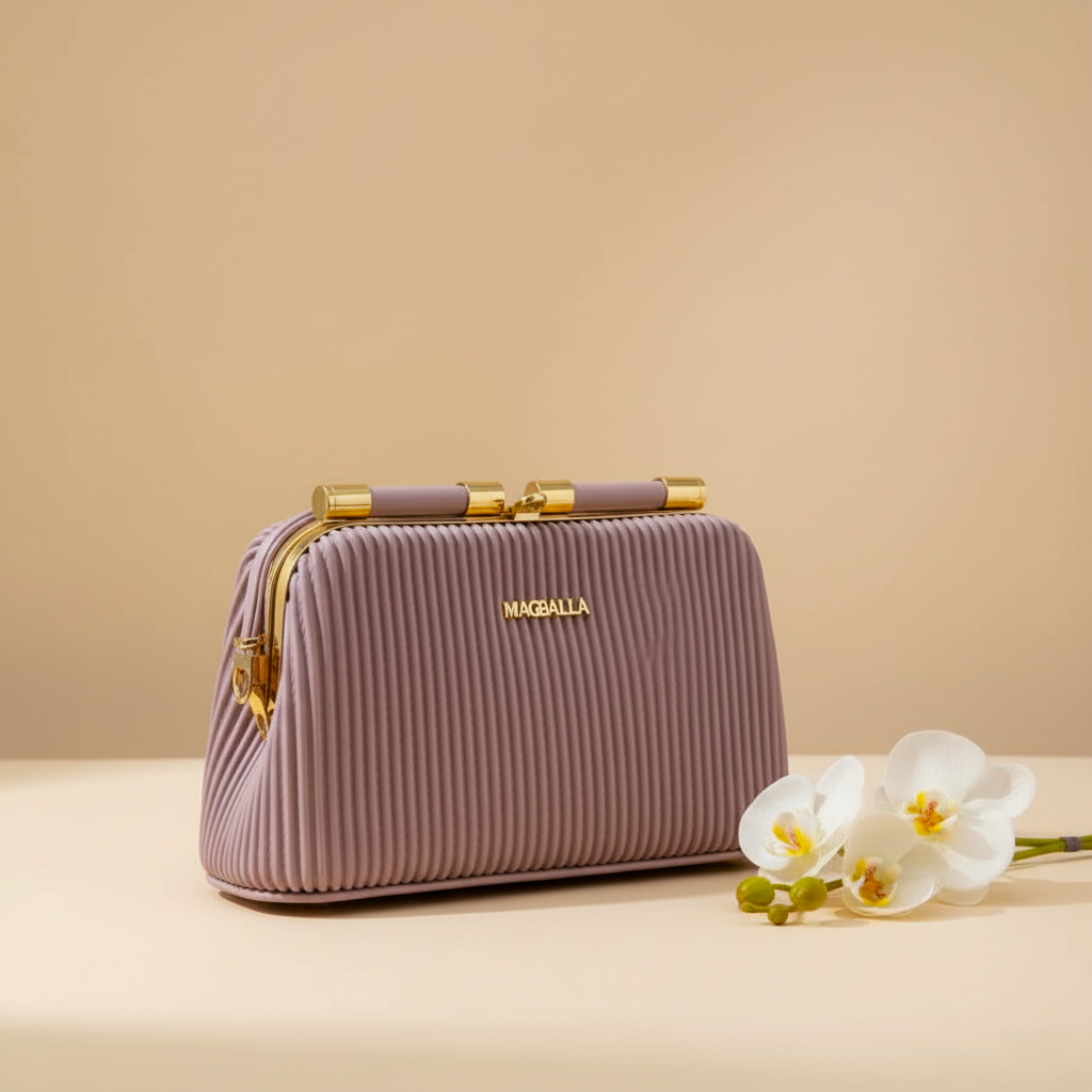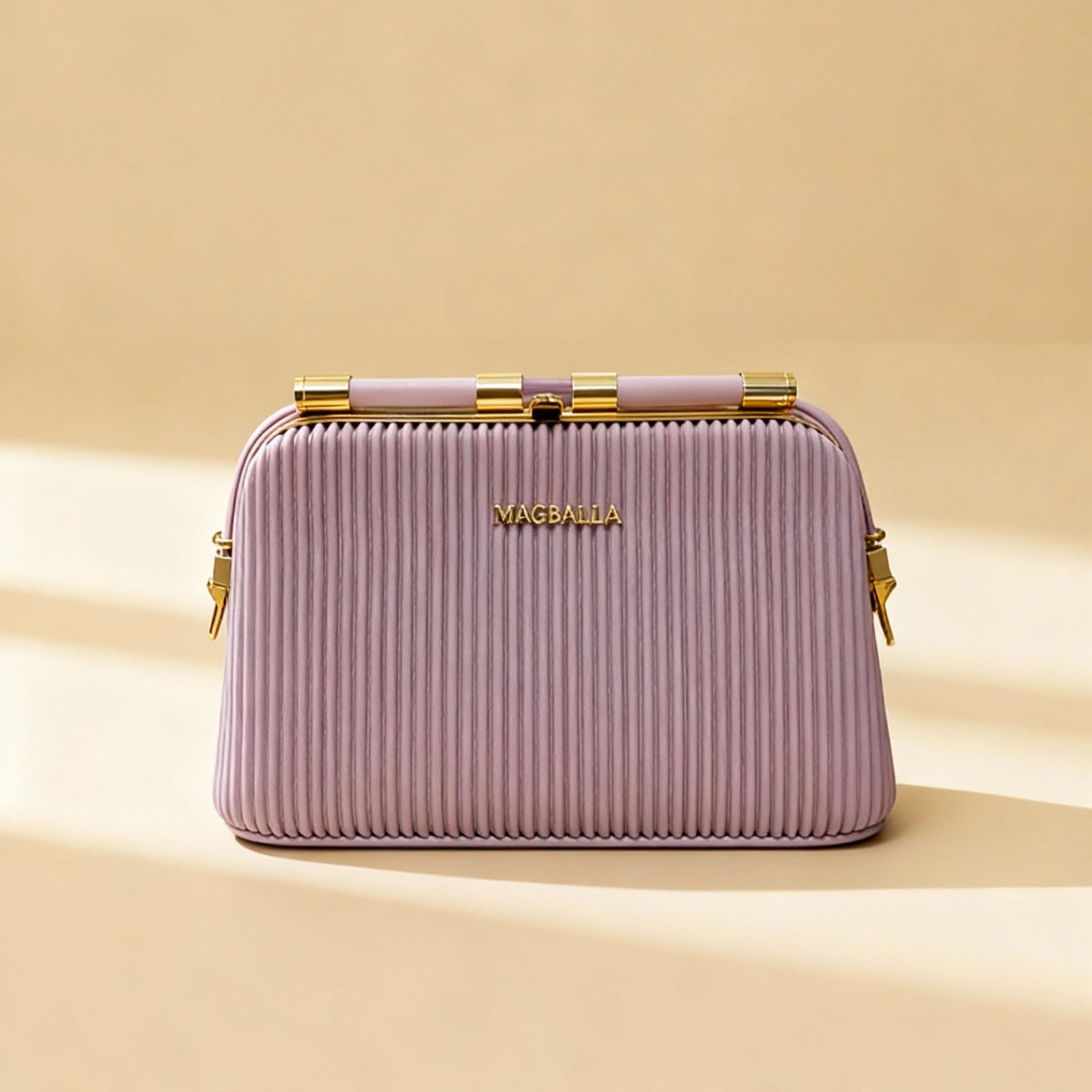 A stylish, structured handbag featuring a sleek, vertically pleated texture. It includes a firm top frame with polished metallic accents and a secure clasp. Side metallic elements add a refined touch, while the overall shape gives it an elegant, modern, and premium appearance.
