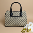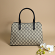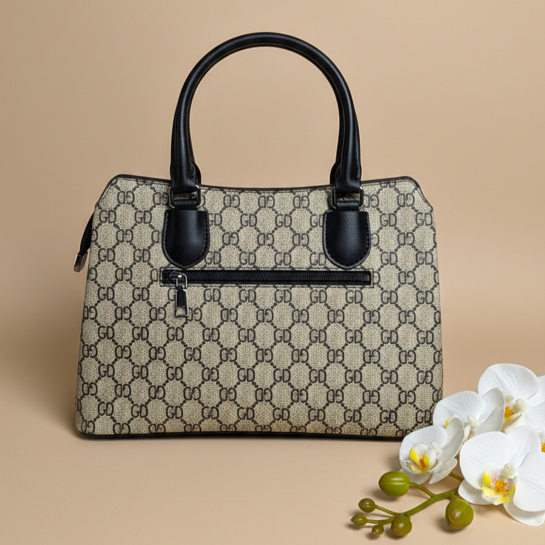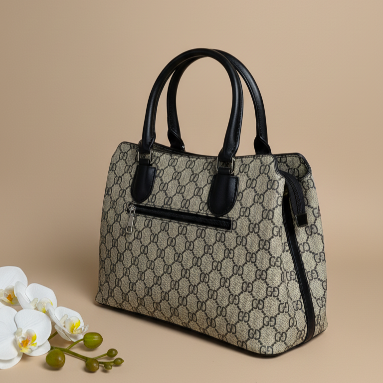 A structured handbag featuring an all-over geometric pattern that creates a stylish and modern look. It includes smooth, elongated handles with polished metallic accents that enhance its refined finish. The bag’s clean shape, detailed texture, and elegant overall design give it a sophisticated and premium appearance.