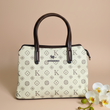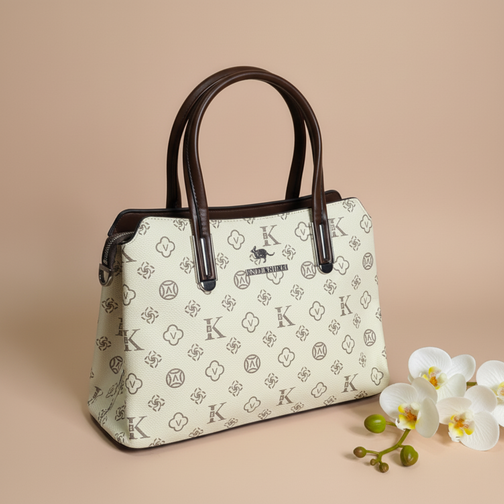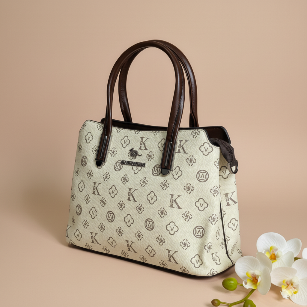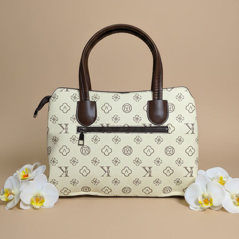 A structured handbag featuring a repeating motif pattern that creates a stylish and distinctive look. It includes smooth, rounded handles with polished metallic accents, adding a refined touch. The textured surface, clean silhouette, and elegant detailing give the bag a sophisticated and premium appearance.