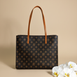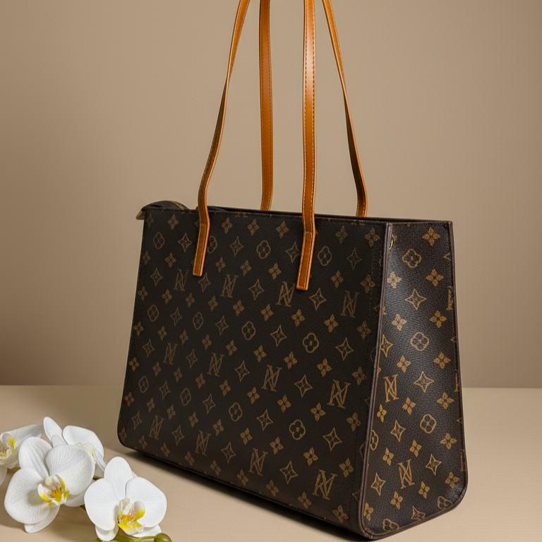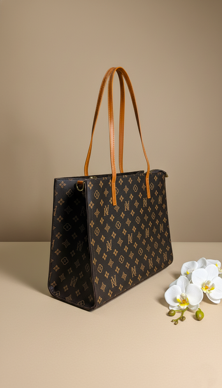 A rectangular tote-style handbag featuring an elegant all-over motif pattern that gives it a luxurious and stylish appeal. It includes long, smooth shoulder straps designed for comfortable carrying. The structured shape, clean lines, and refined details create a modern, sophisticated, and fashion-forward look.