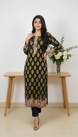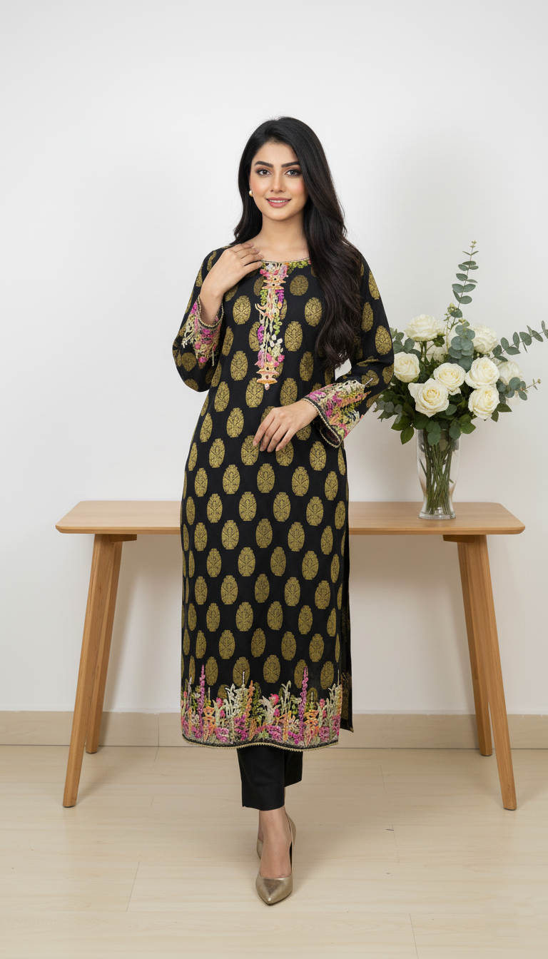 Shirt: Premium Viscose featuring intricate thread embroidery on the neckline, sleeves, and hem. The black base is adorned with gold jacquard-style motifs, complemented by vibrant multicolor floral embroidery for a bold, striking finish.