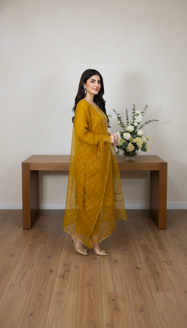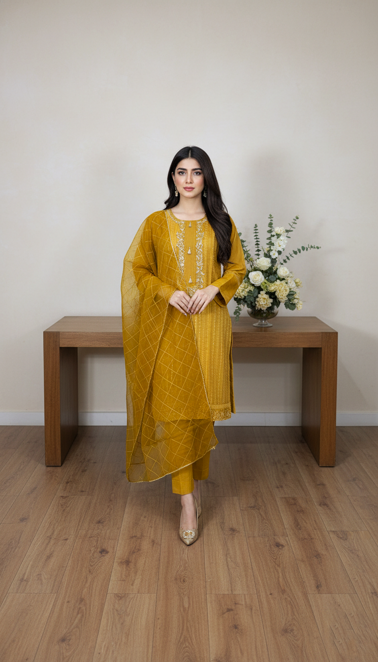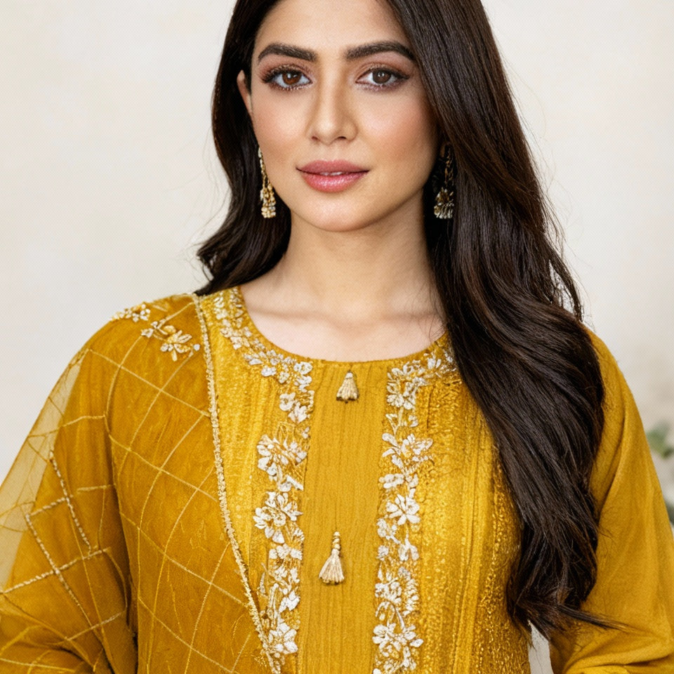 Ladies Organza Fancy Sheesha Gala Embroided Suit(Yellow)-PL00802