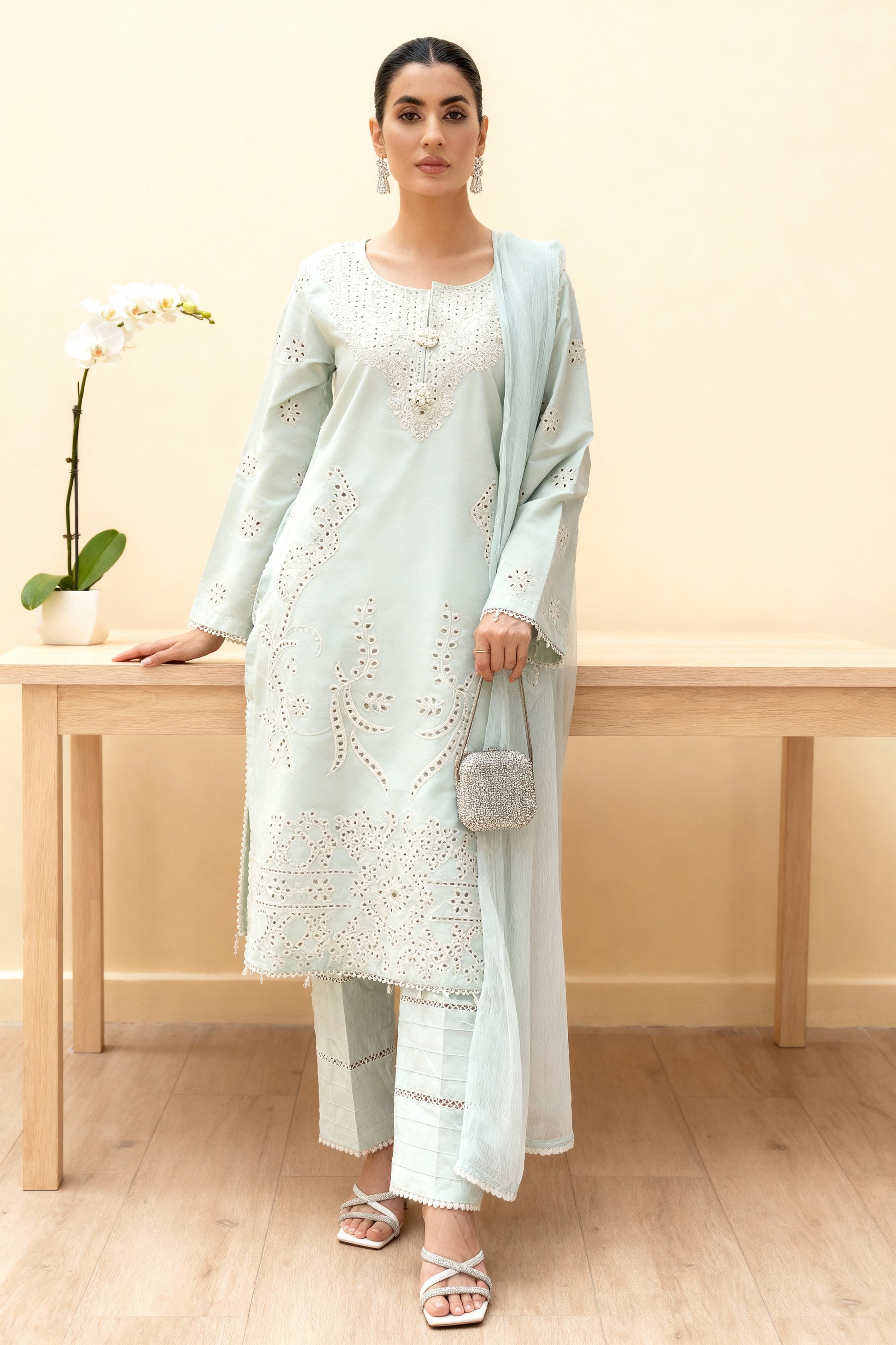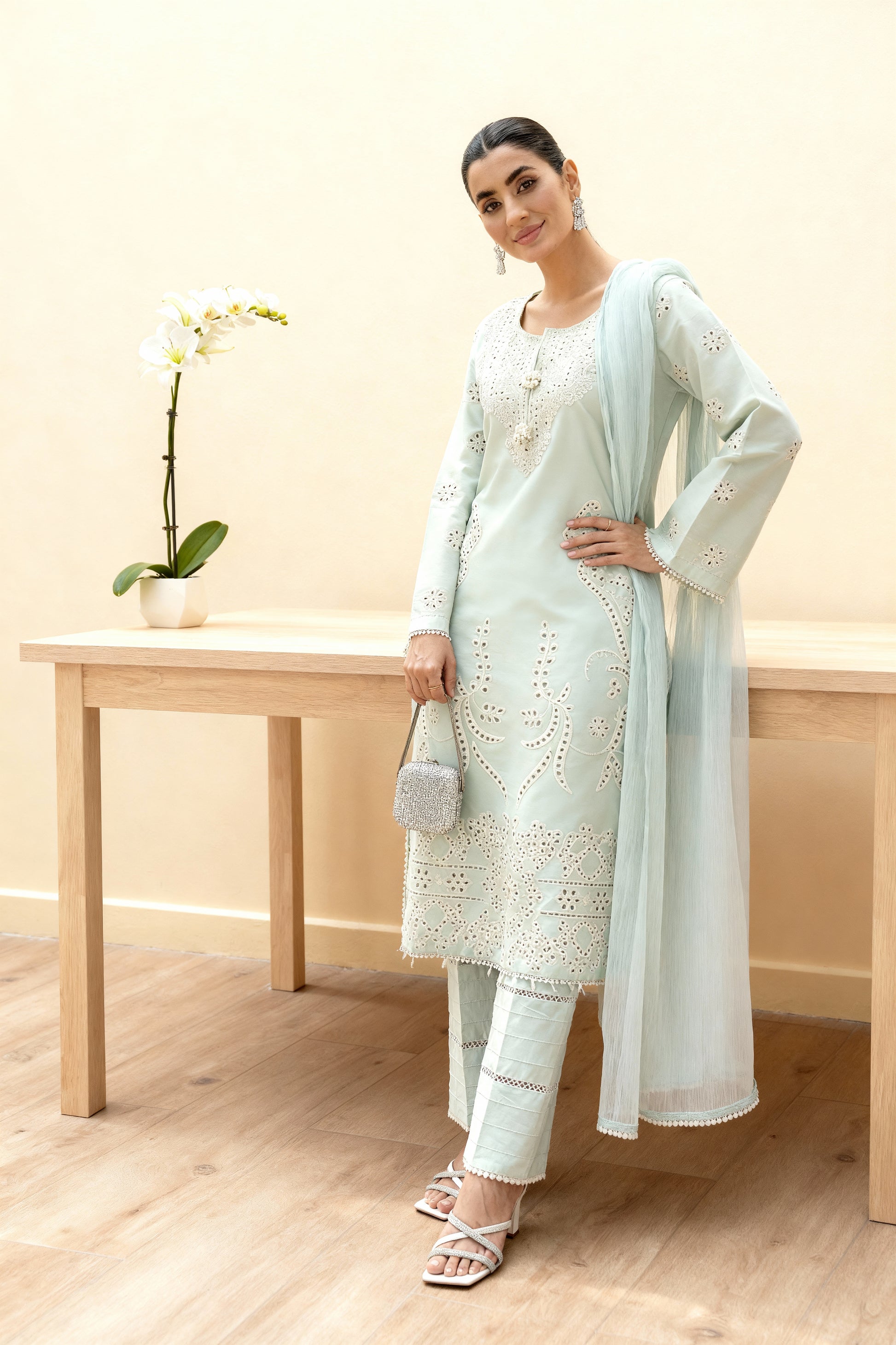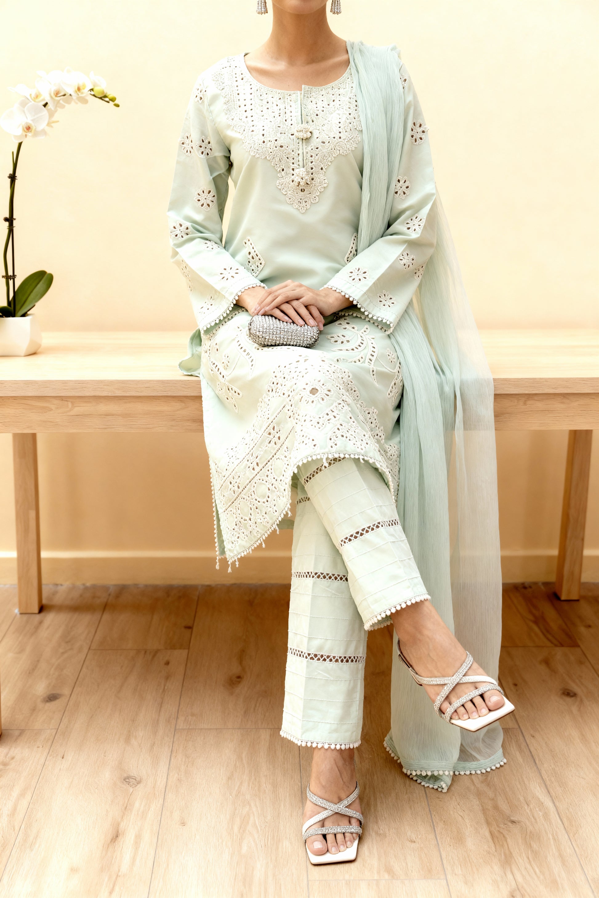 Showcase the delicate details of the embroidered chikenkari shirt by pairing it with the plain cambric trousers. Complete your ensemble with the dyed chiffon dupatta, using its lace trim to create a beautiful, cohesive look.