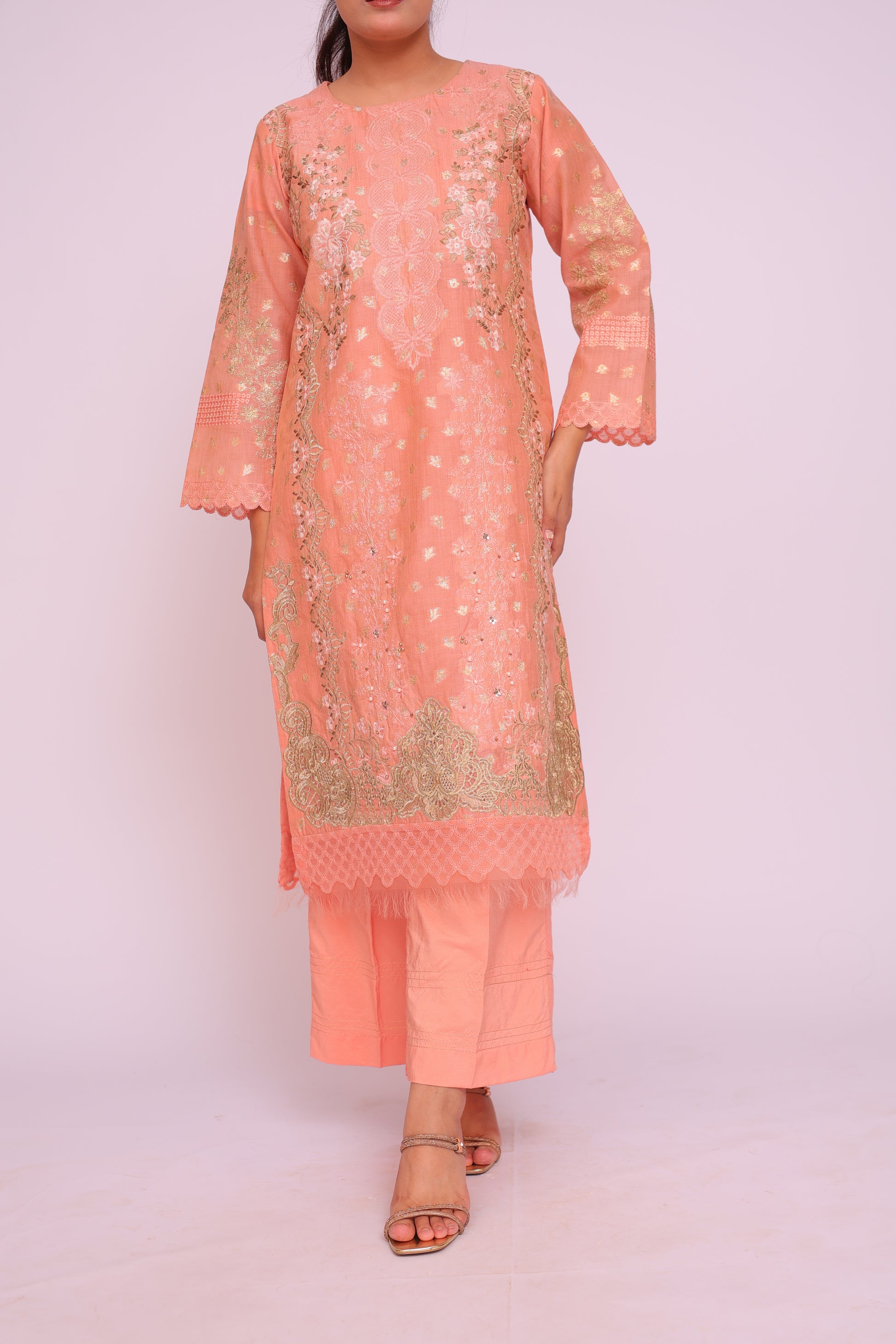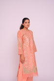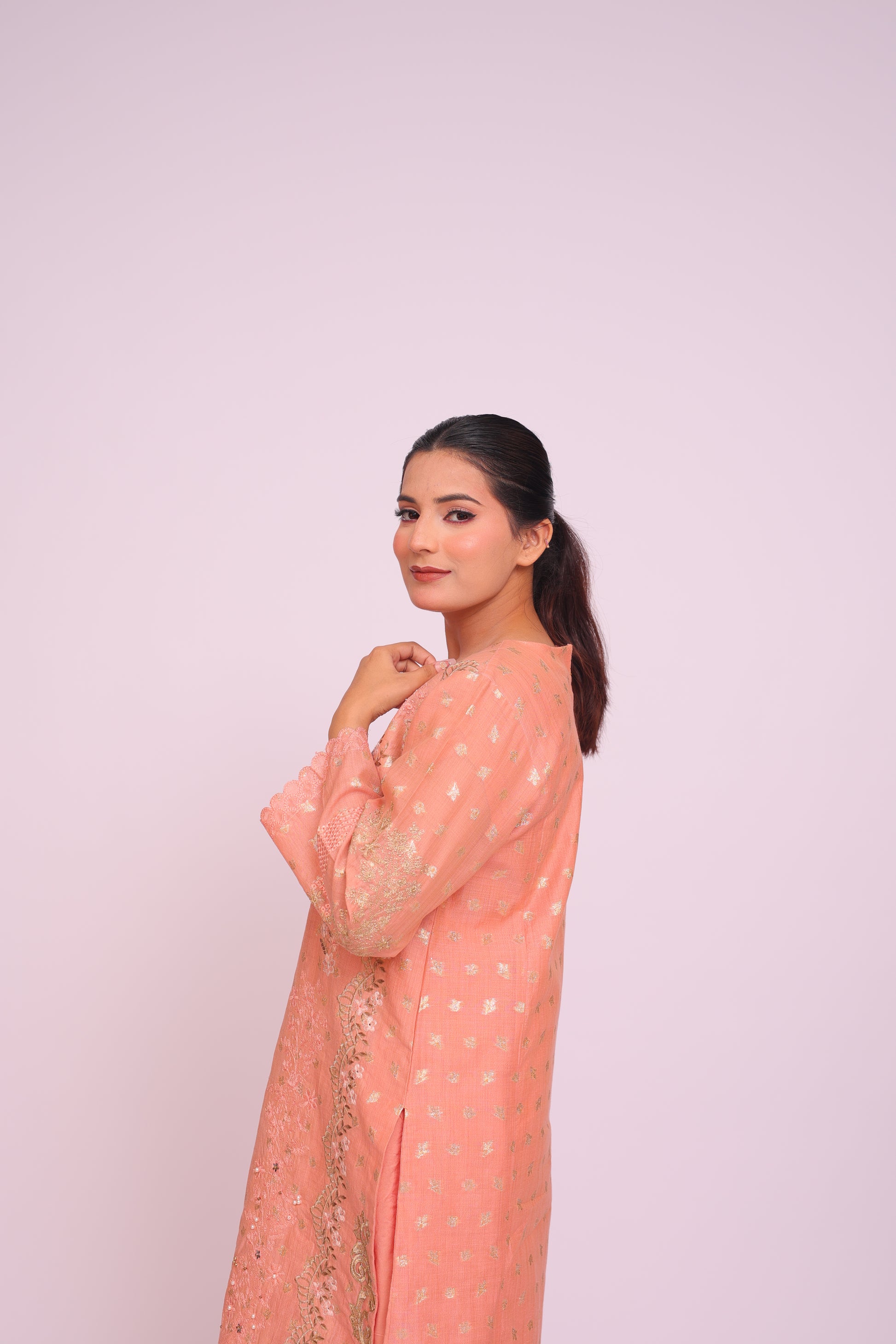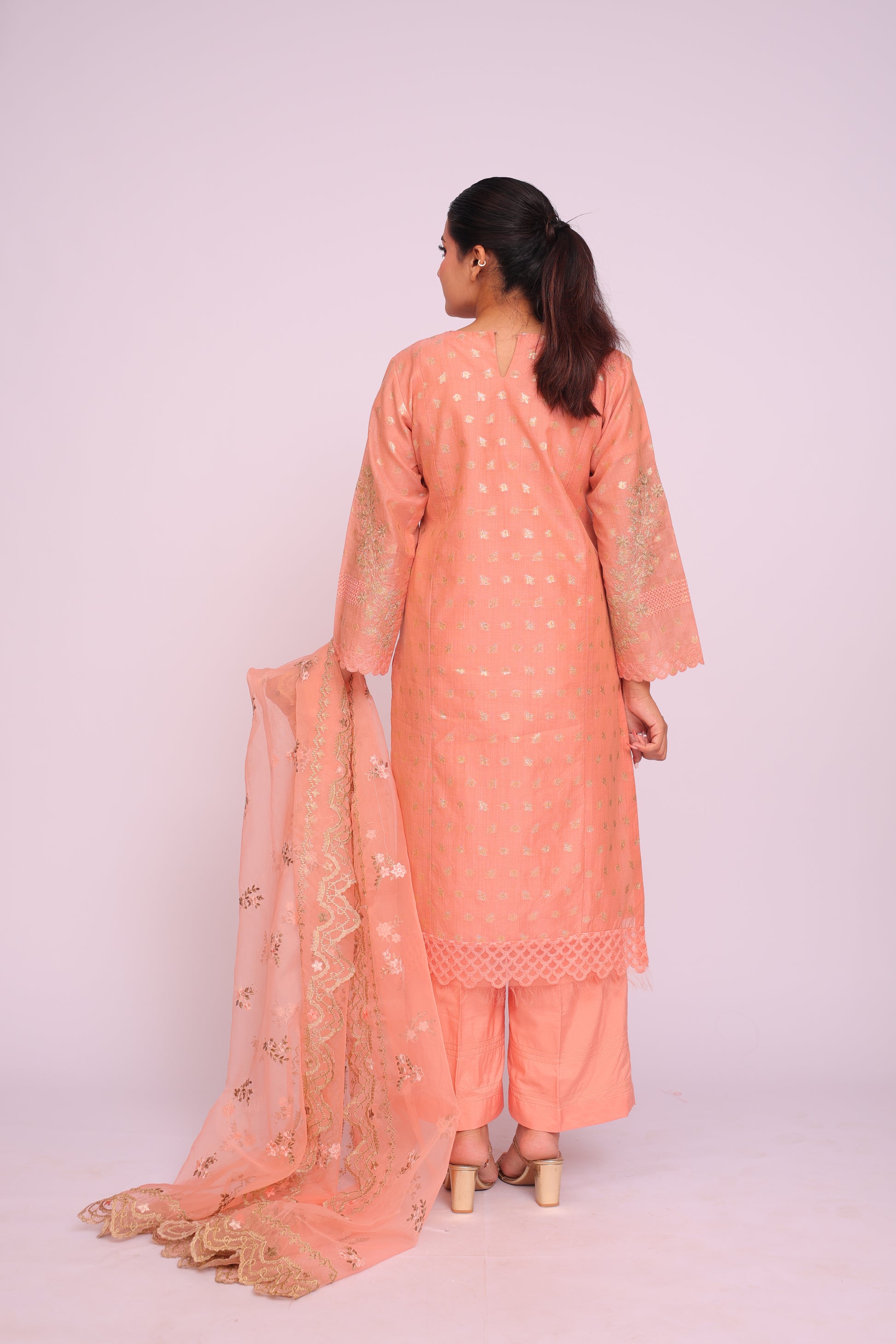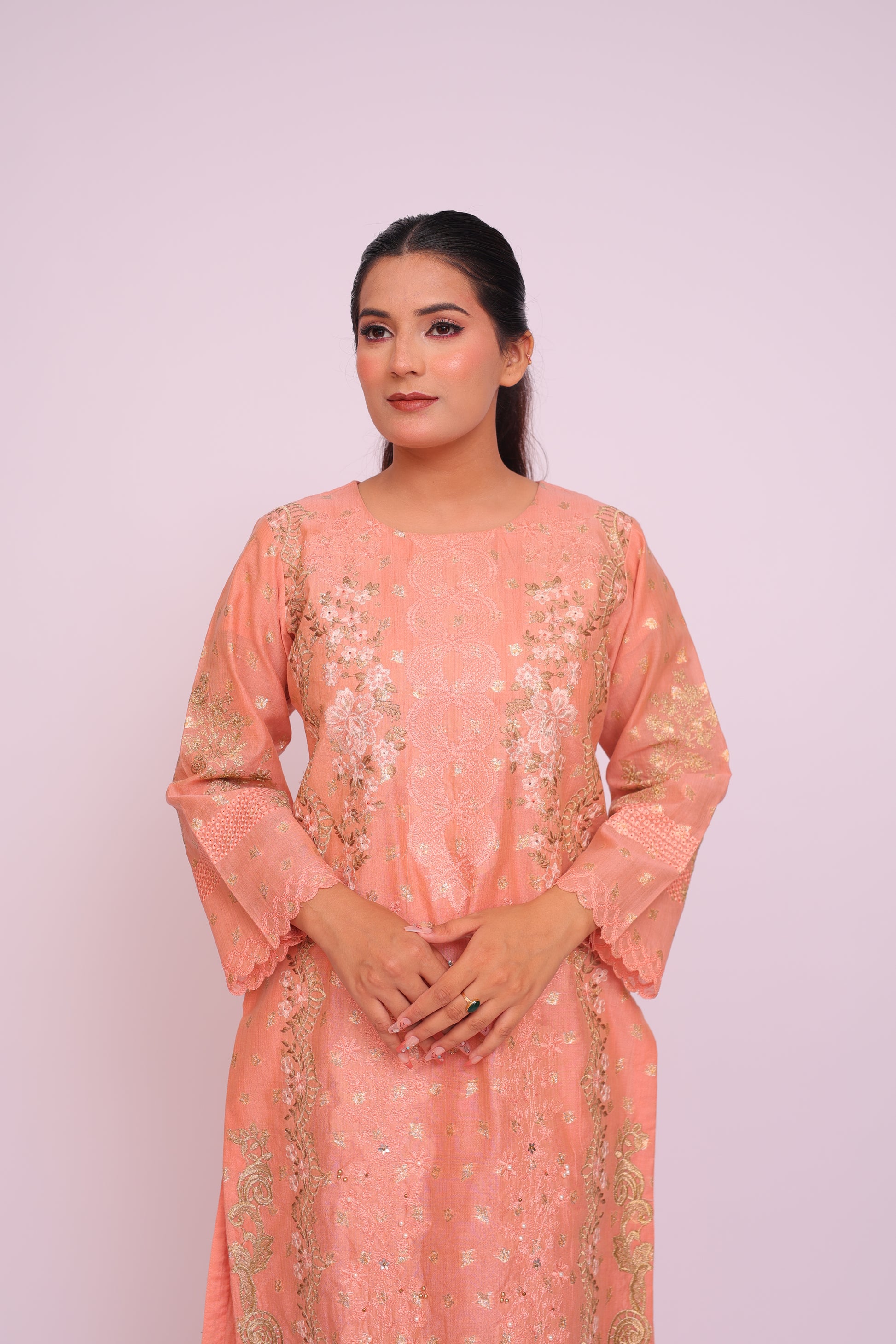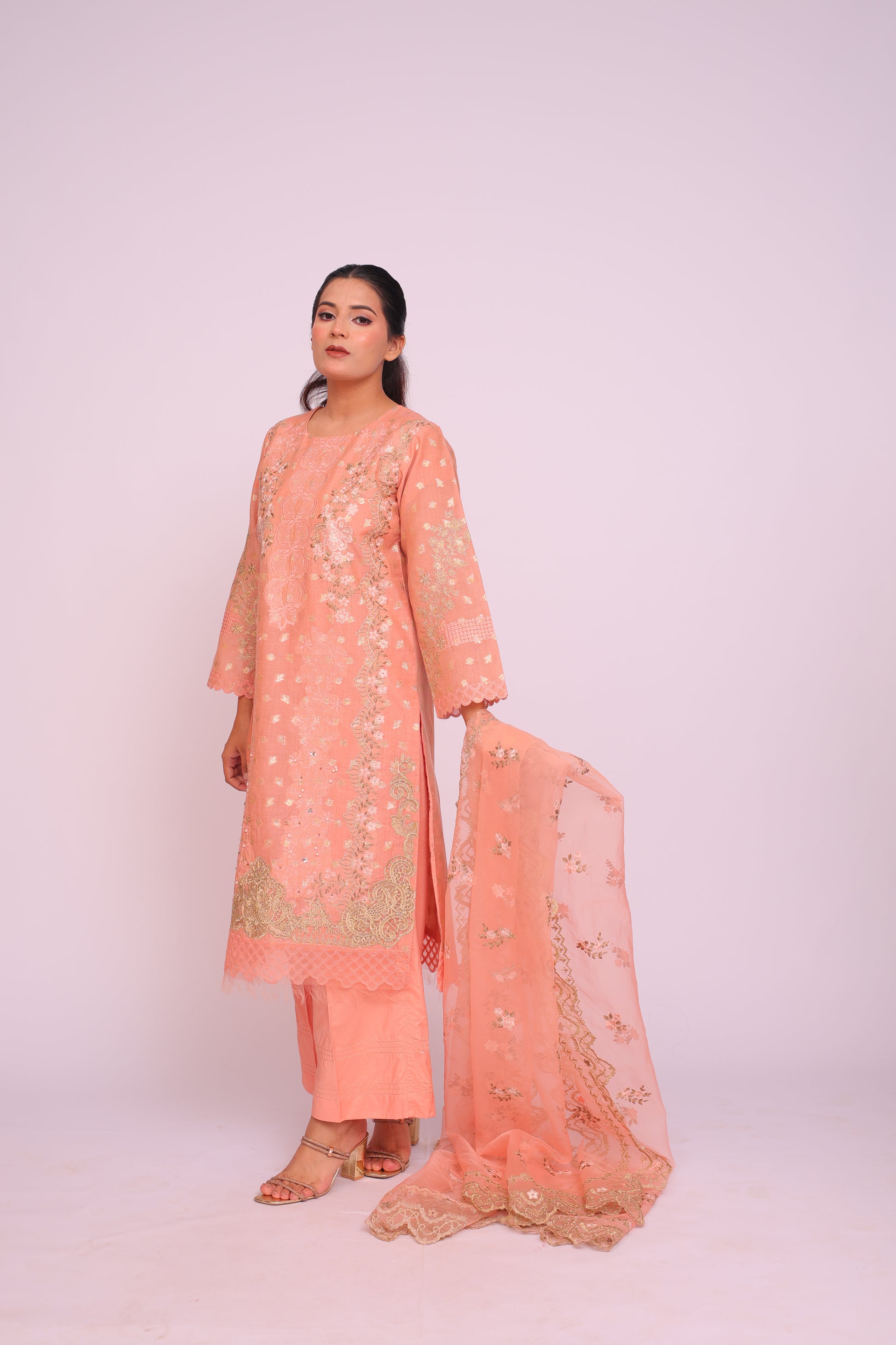Shirt: Imported Organza with embroidery, pleated bodice, lace-trimmed daman and sleeves