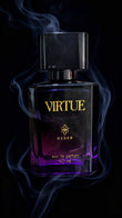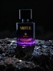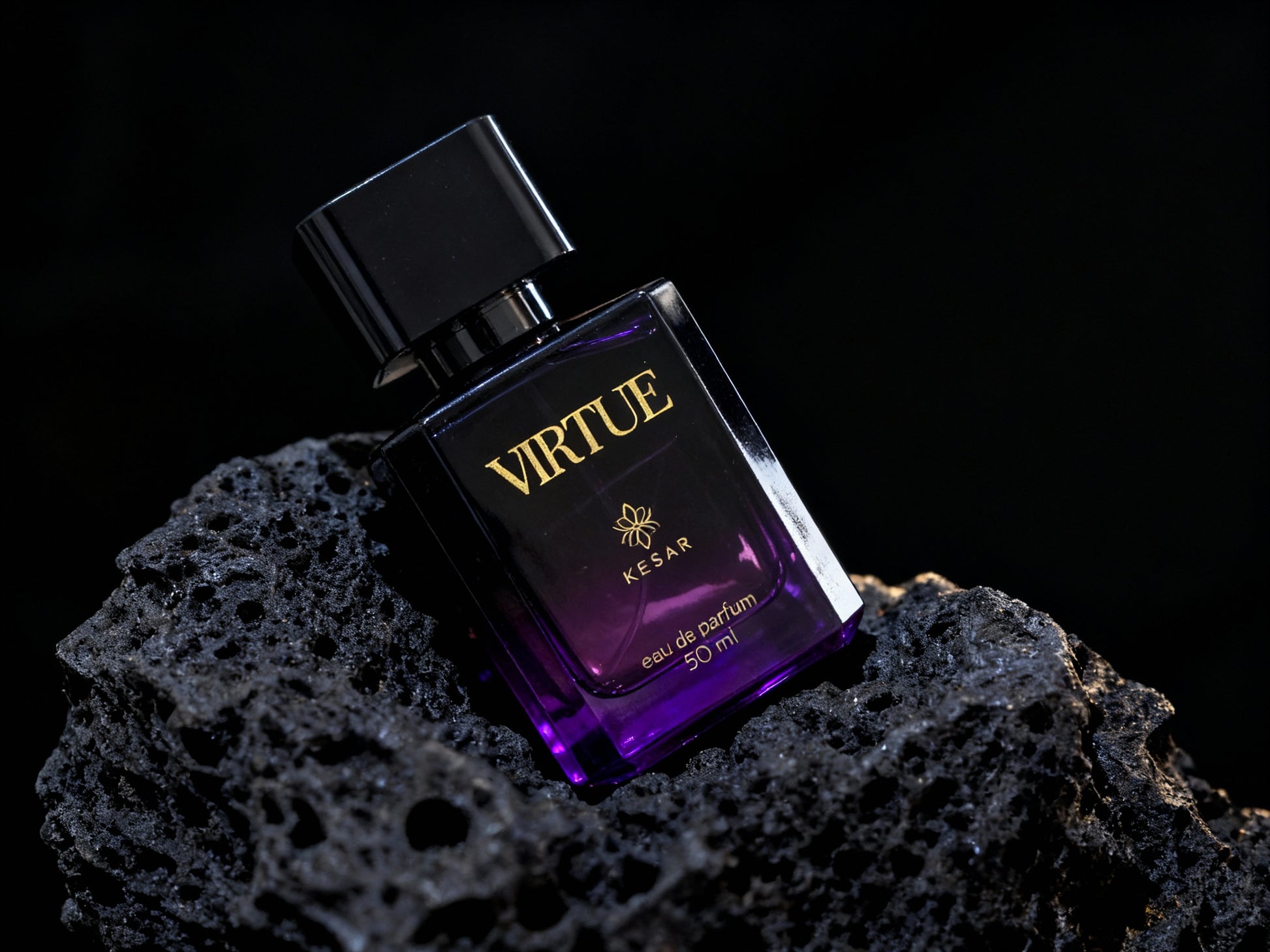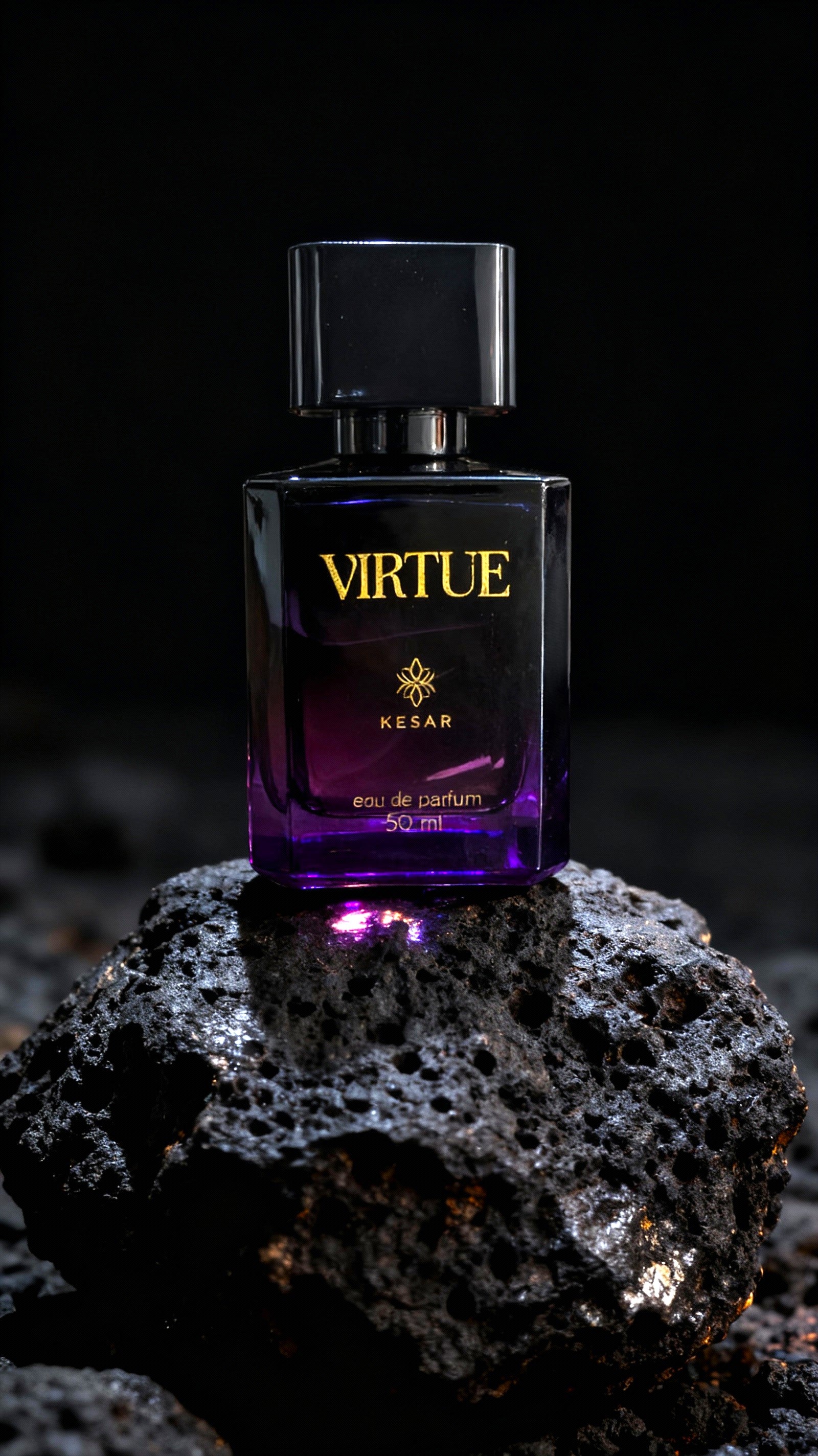 Introducing VIRTUE Eau de Parfum by KESAR, showcased in a captivating deep-violet bottle that embodies mystery, elegance, and refined luxury. Its bold black cap adds a modern, sophisticated touch, enhancing the bottle’s striking presence. Designed in a 50 ml size, this fragrance promises a long-lasting, graceful scent crafted for those who value purity and class. Set atop a rugged, volcanic-textured stone, the bottle symbolizes strength, depth, and timeless allure. Perfect for personal use or gifting, VIRTUE reflects a perfect balance of beauty and character.